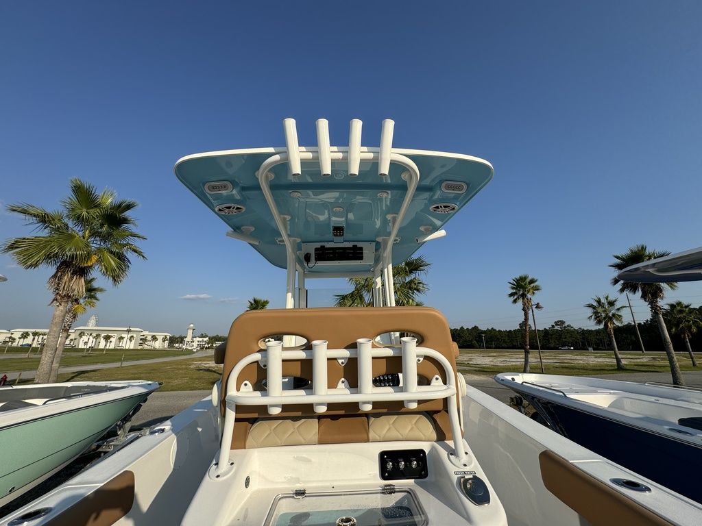 There is nothing you can’t accomplish in a 252 Legacy. Its deluxe leaning post includes a built-in 21-gallon bait well and prep station for pro-style fishability. It also holds tackle storage drawers and a freshwater wash down. Captain’s seating comes with flip-up bolsters, an armrest and a footrest. The whole family can cruise comfortably on the 252, too. The roomy cockpit features plush U-shaped seating and flip-out backrests in the bow. Table and filler options transition the space to a sun pad or picnic area. Three-across seating at aft houses an 18-gallon cooler and an oversized insulated 50-gallon fish box. A walkthrough transom door makes way to a swim platform with a retractable ladder. Whether hauling in a prize lunker or cruising around with family and friends, good times on the 2602 Legacy will go on forever.