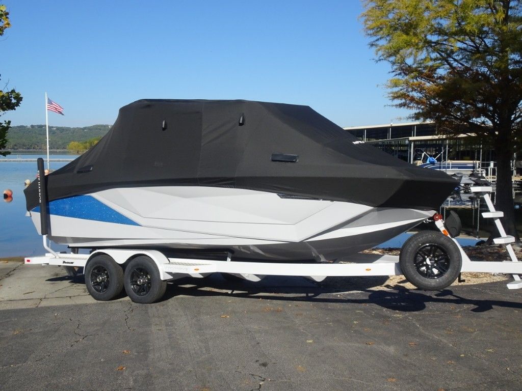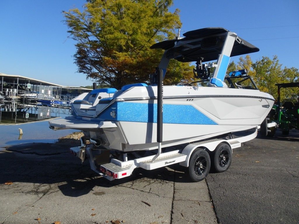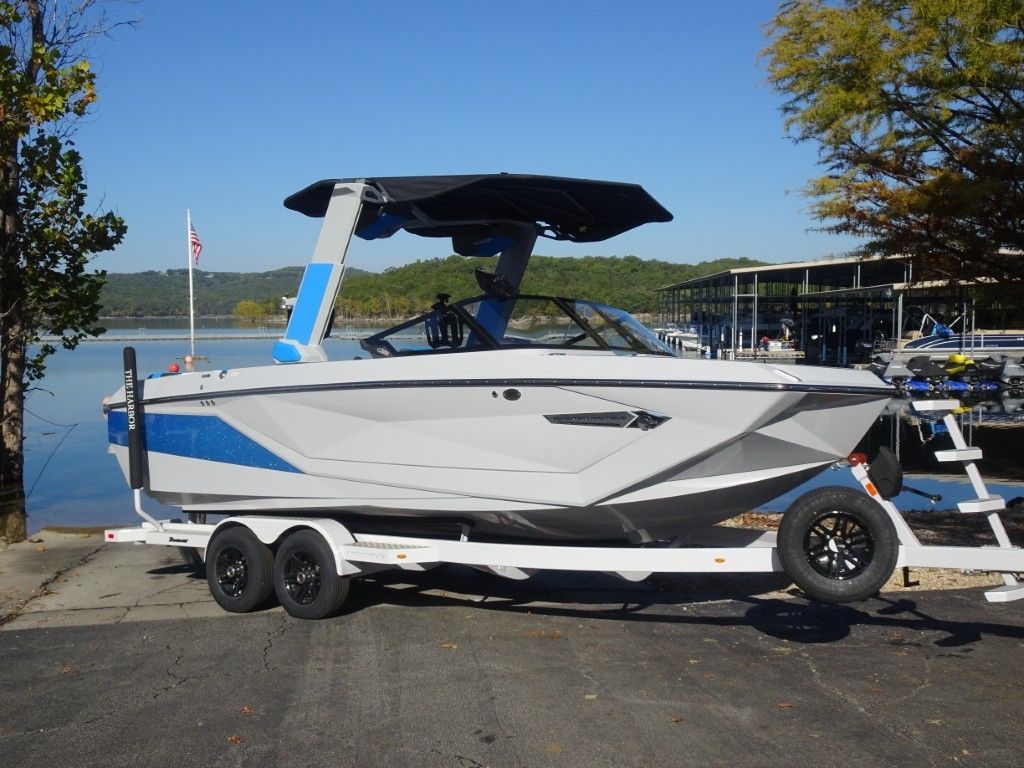 This is a Dealer Demo 2024 Nautique G-23 in Haze Grey with Masters Blue Accent and Masters Blue Interior. It is powered by a PCM ZZ6 6.2L 450hp with 418 hours and has a matching Boat Mate tandem axle trailer, along with the following upgraded options: