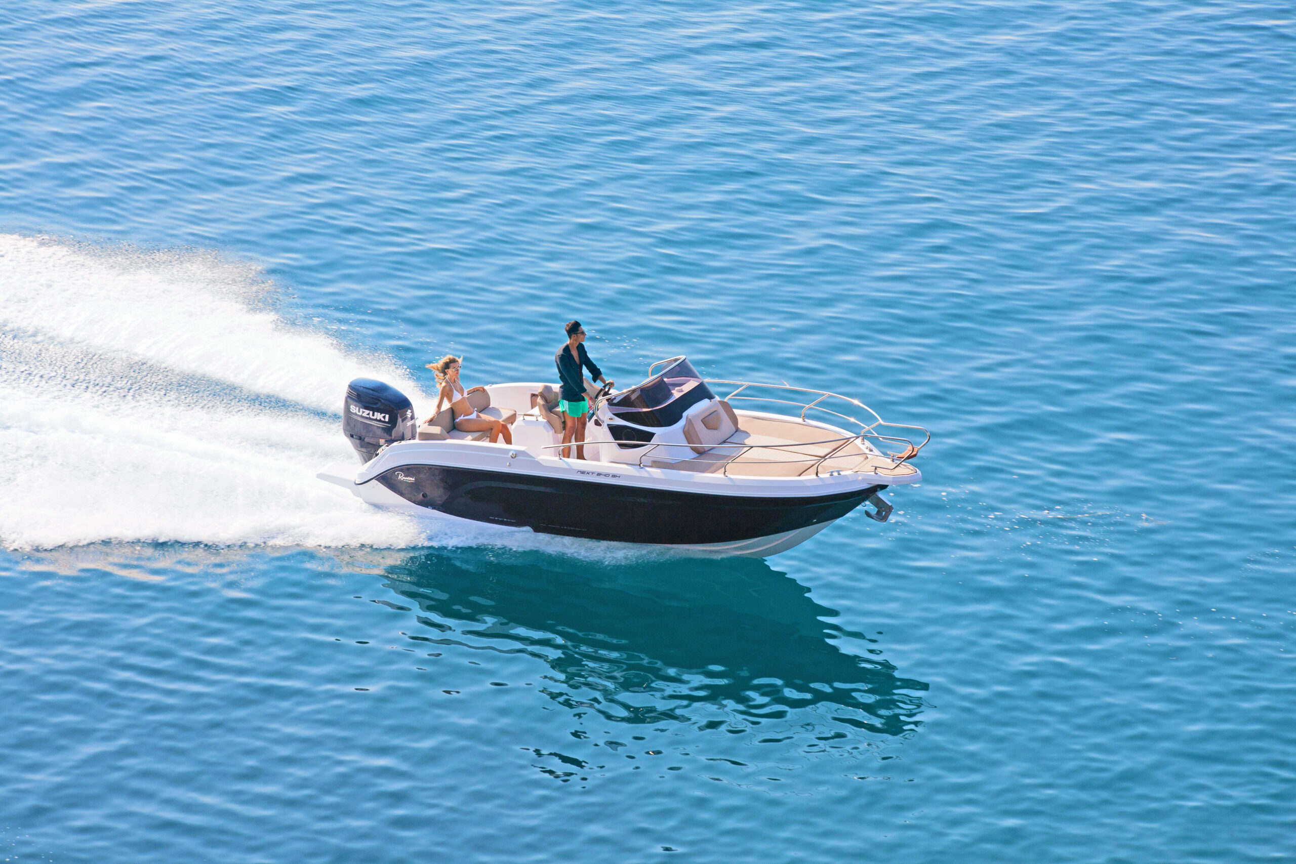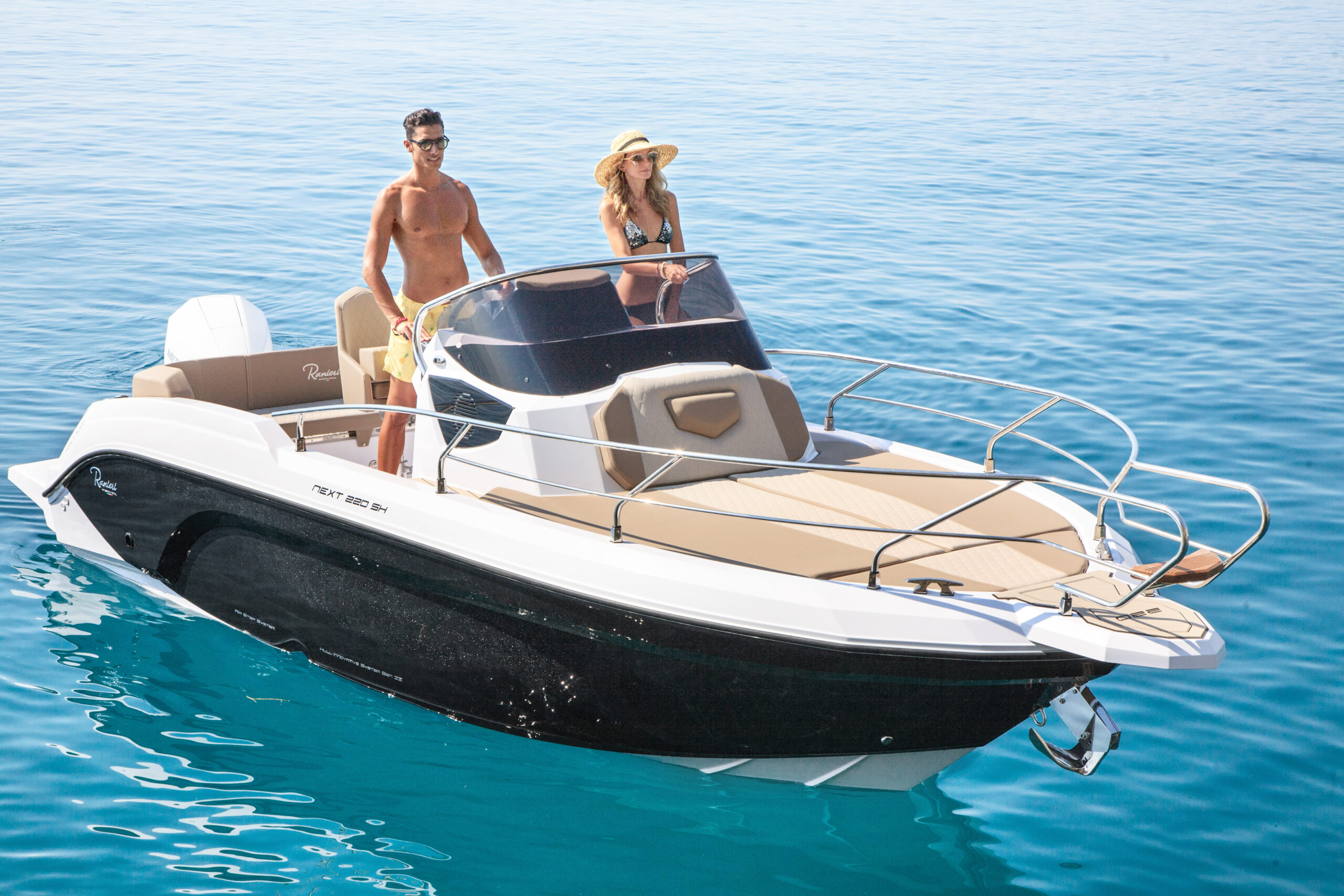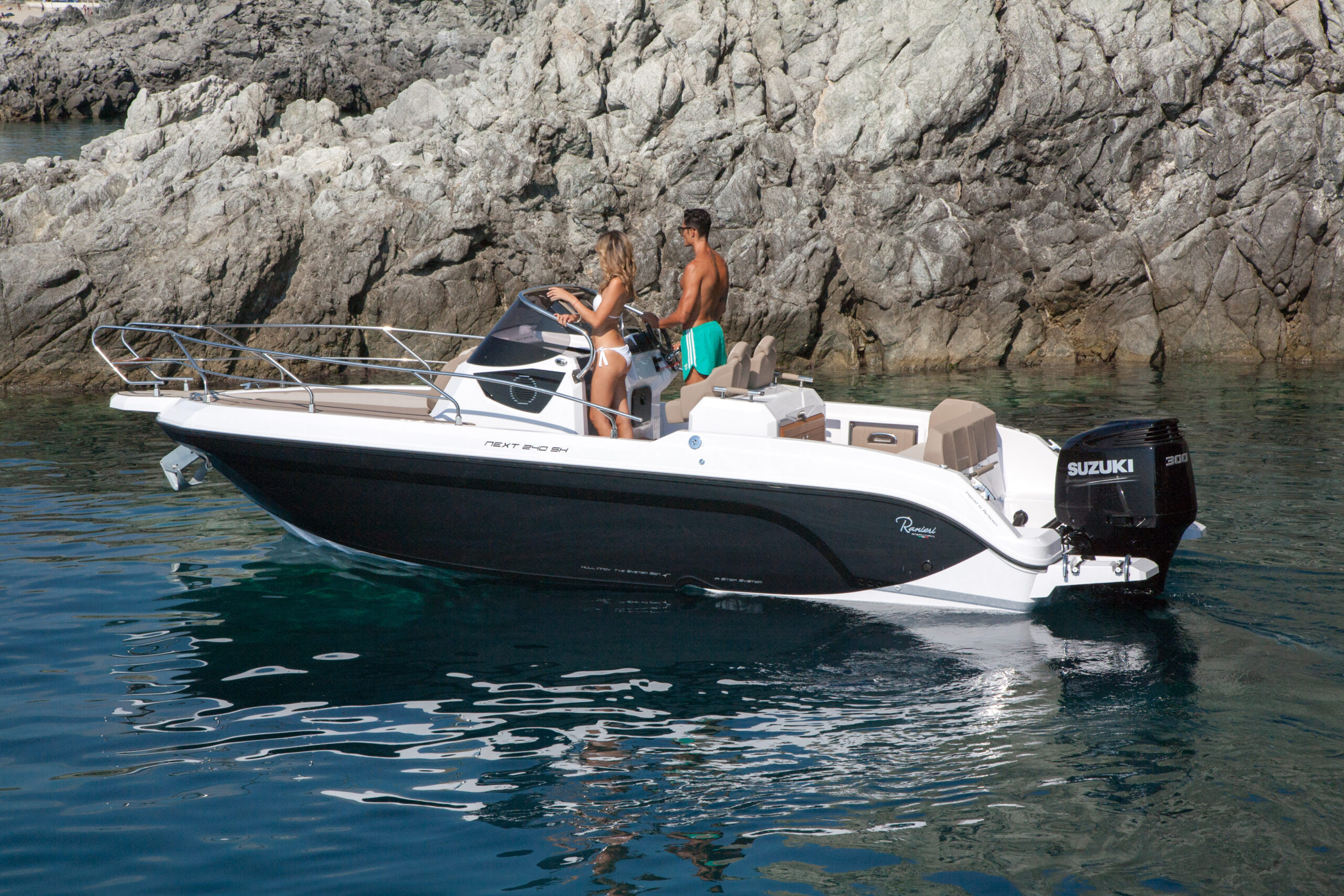 The Next 240 SH is compatible with single-engine ranging from 200 hp to 300 hp maximum. The Ranieri Next 240 SH has a step hull (redan – H.I.S). This intake of air under the hull creates an efficient ventilation which makes it possible both to reduce the differences in pressure on the hull and to improve the overall stability. The efficiency of steps is to adopt this hydrodynamic advantage over the whole of its range by grouping three concepts dear to Ranieri International: the best performance, comfort and optimization of consumption.