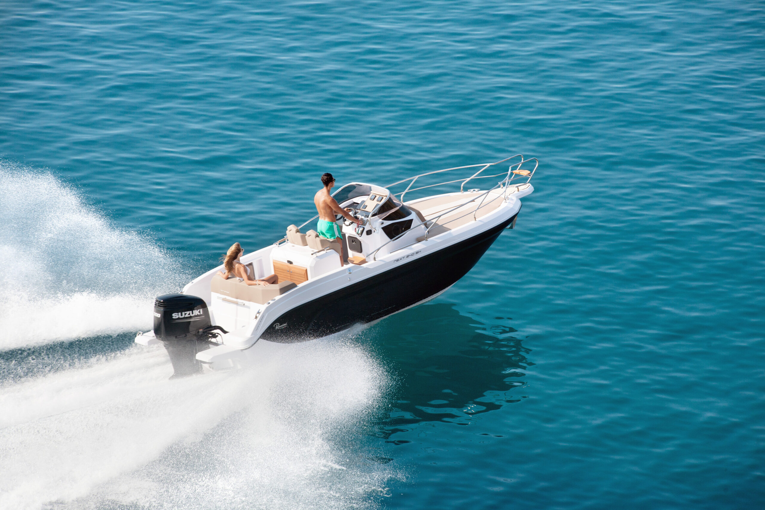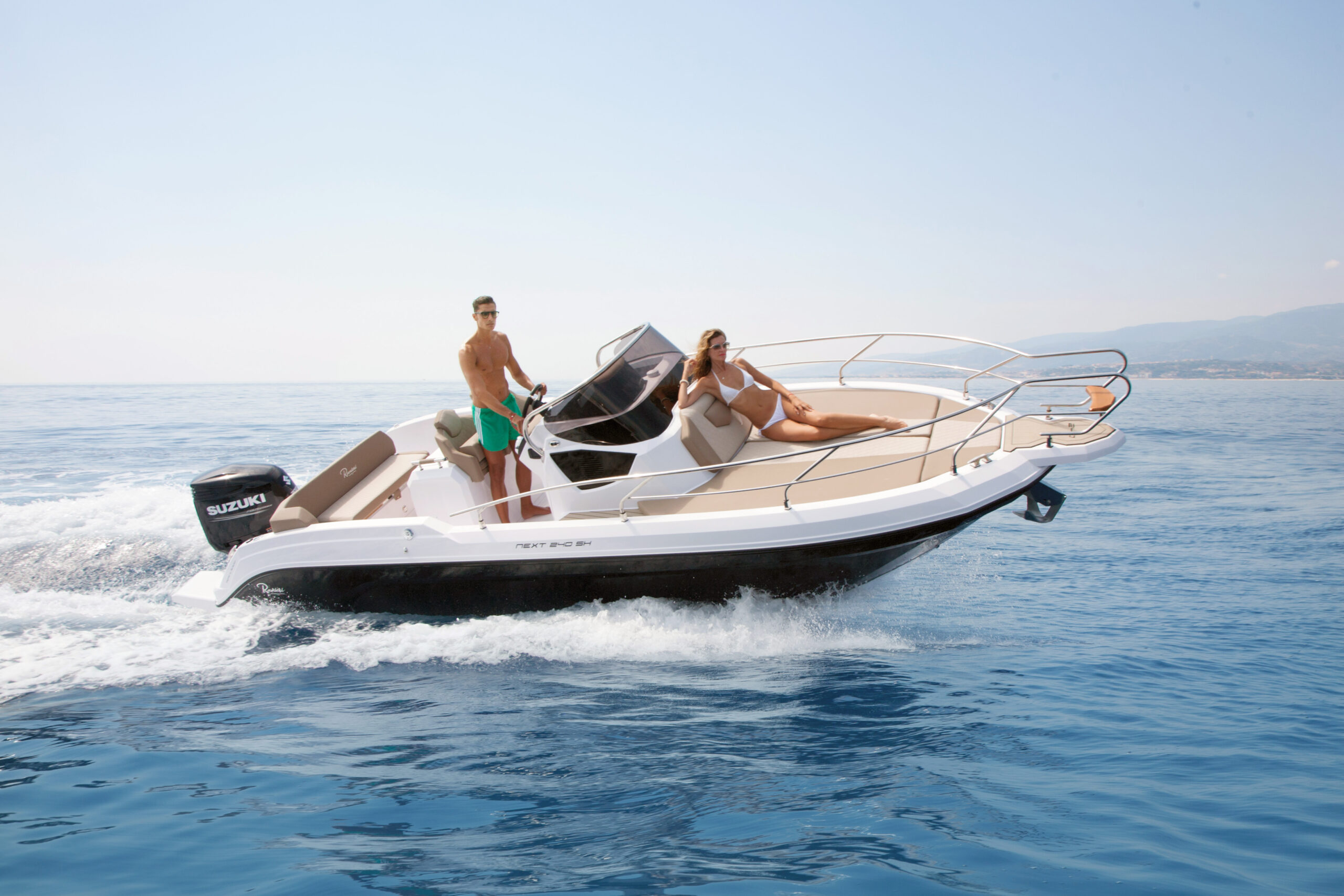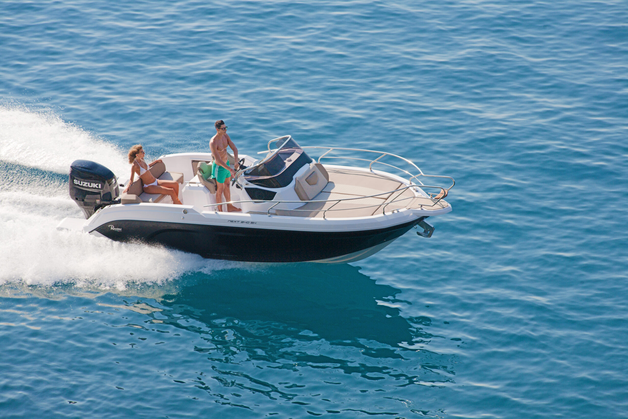 The Next 240 SH is compatible with single-engine ranging from 200 hp to 300 hp maximum. The Ranieri Next 240 SH has a step hull (redan – H.I.S). This intake of air under the hull creates an efficient ventilation which makes it possible both to reduce the differences in pressure on the hull and to improve the overall stability. The efficiency of steps is to adopt this hydrodynamic advantage over the whole of its range by grouping three concepts dear to Ranieri International: the best performance, comfort and optimization of consumption.