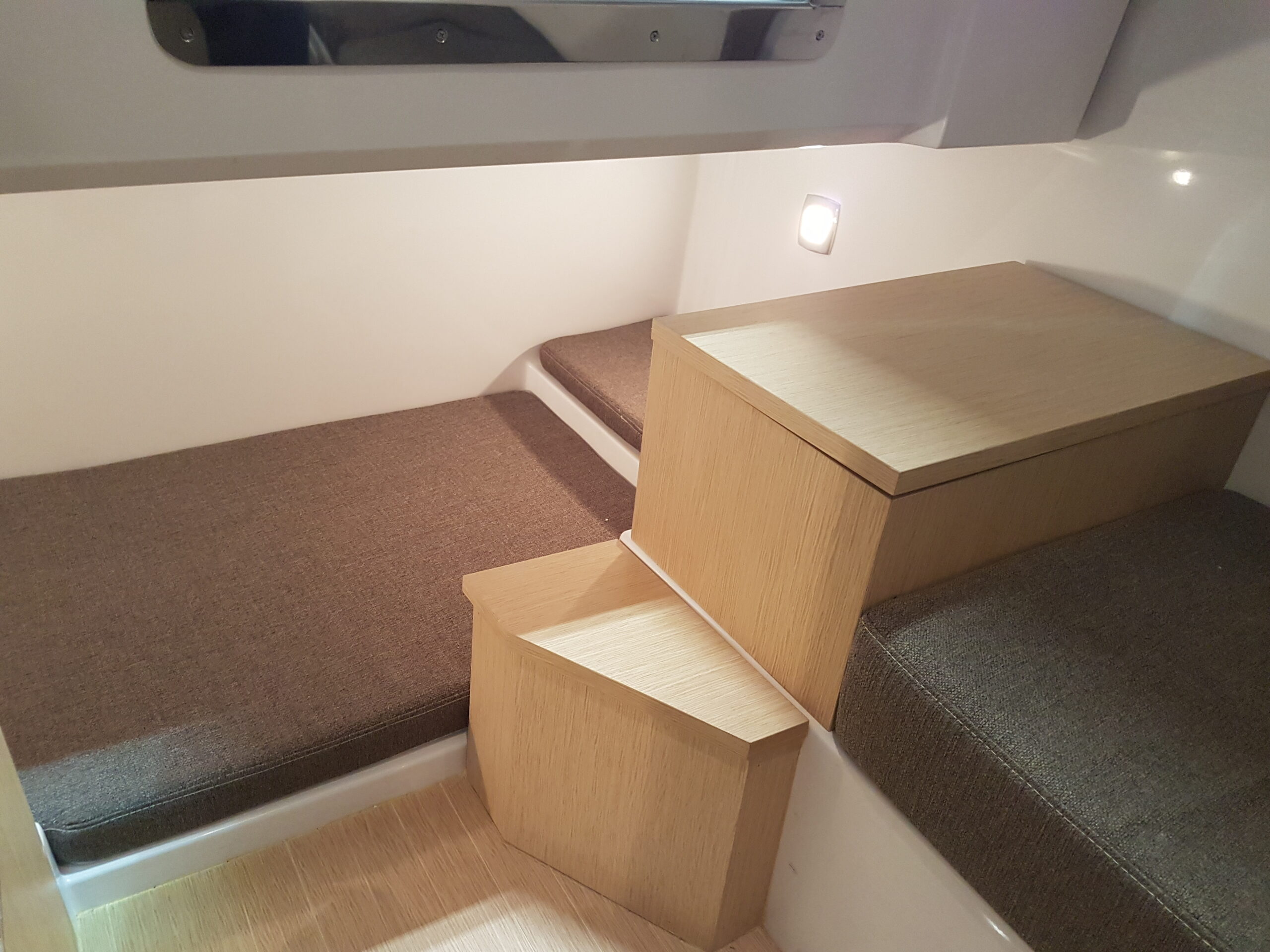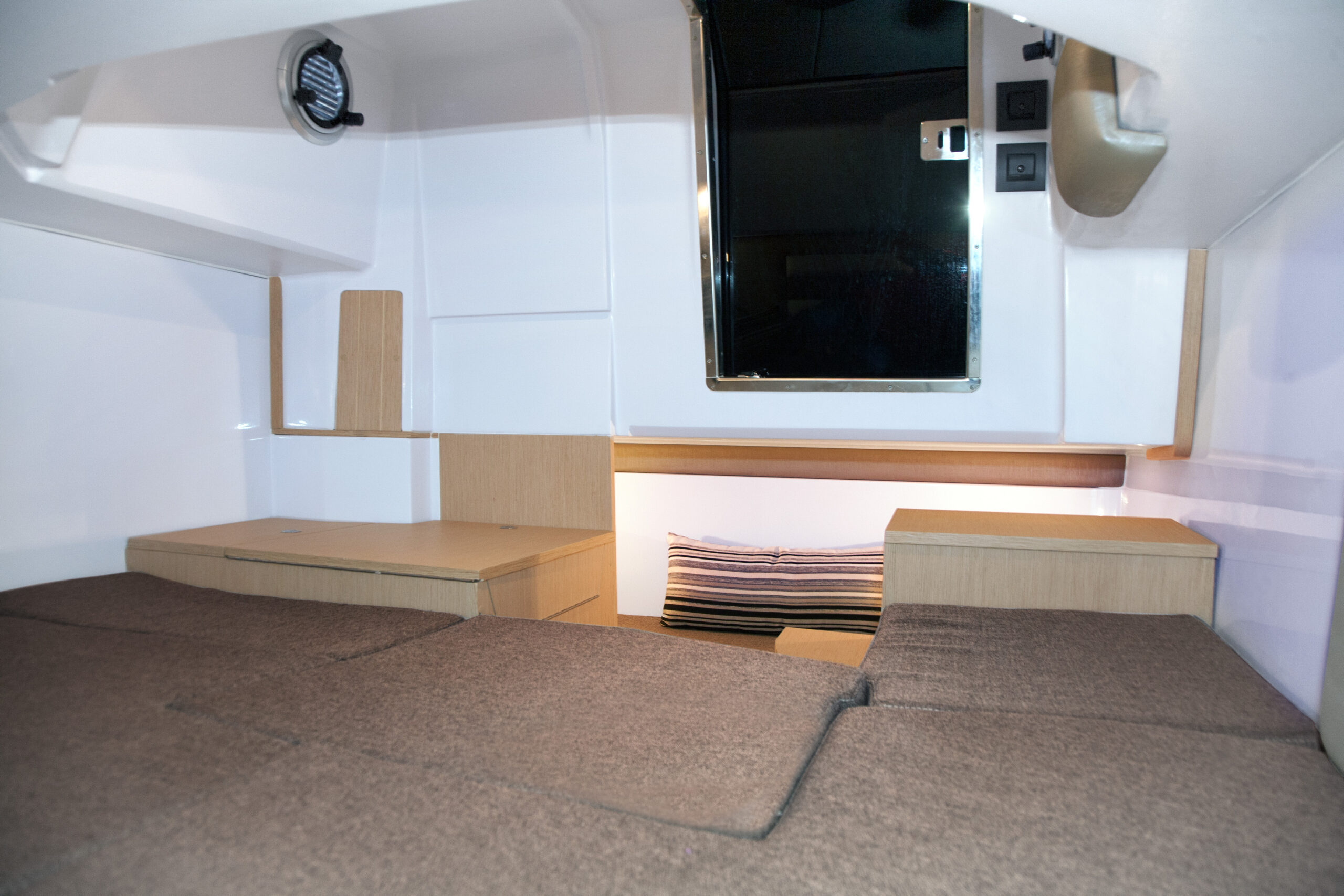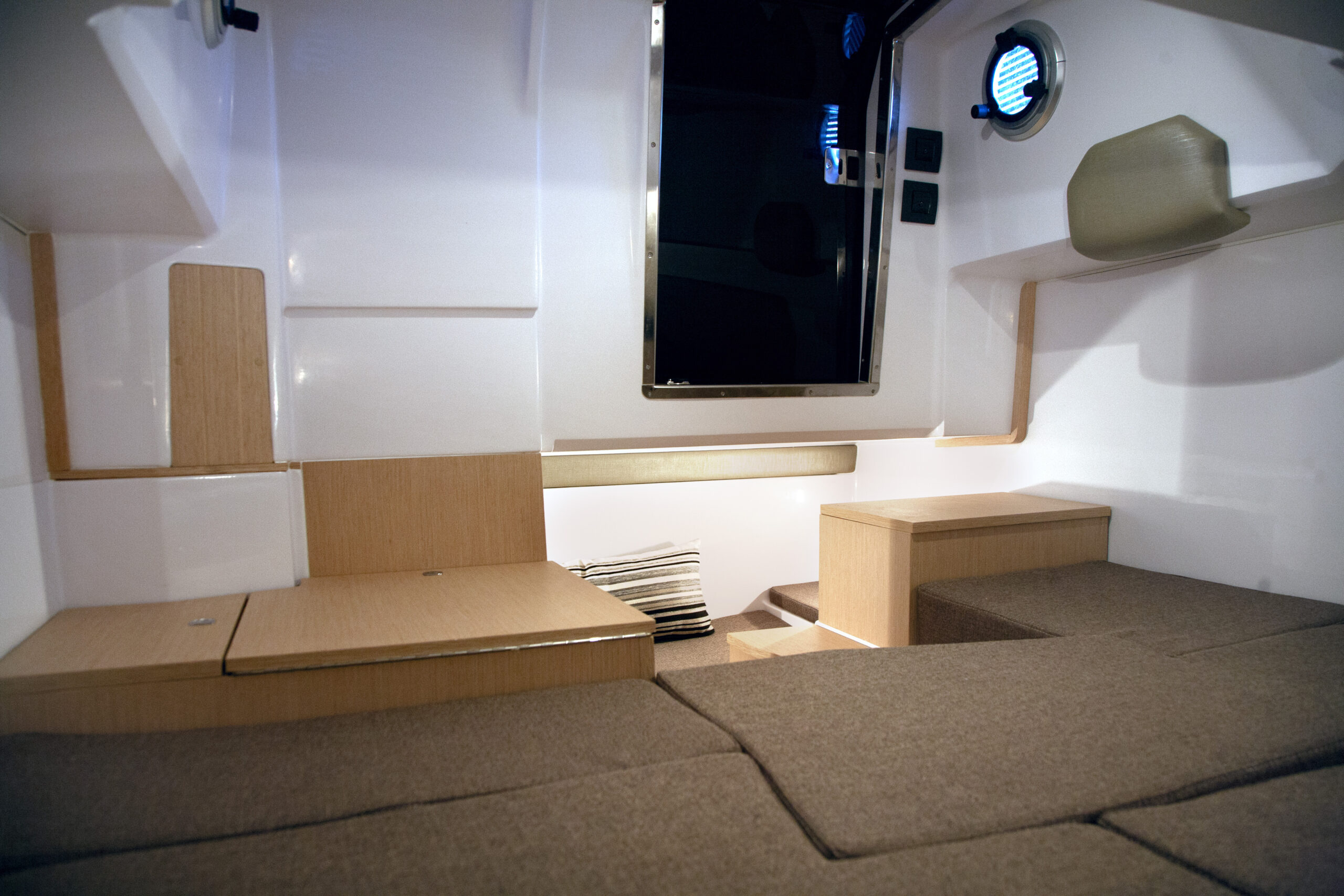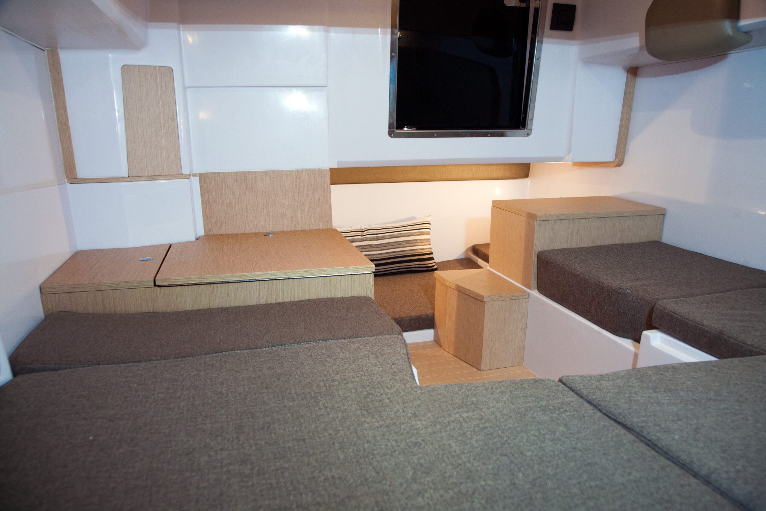 The cockpit layout is pleasant, it consists of a console protected by a windshield surmounted by a stainless steel handrail, securing while move on board. Characteristic of the Next range, there is a large sunbath area on the front deck. The rear part of the Ranieri Next 240 SH offers easy circulation. The cockpit is adjustable to accommodate up to seven people around a table. According to the shipyard, in fact, the Next 240 SH is the first boat under 8 meters with three berths located in two separate spaces. Interiors, in fact, include a large double bed in the bow – which can become an indoor dinette with two opposing sofas – and a third single bed on the side. Hidden inside a locker, there is a marine manual or electric wc. Instead of the third bed, a toilet with wc and washbasin can be installed on the starboard side.