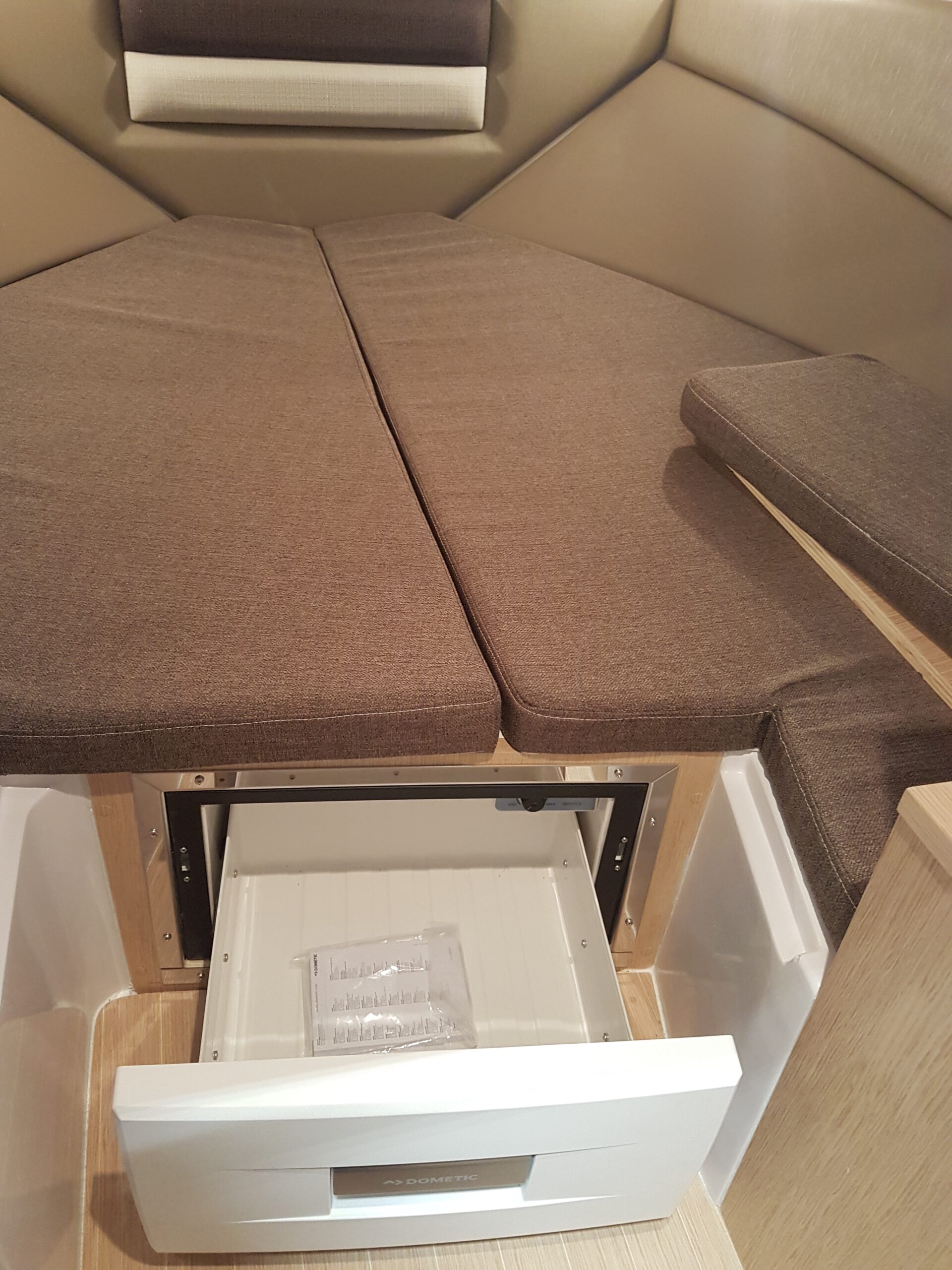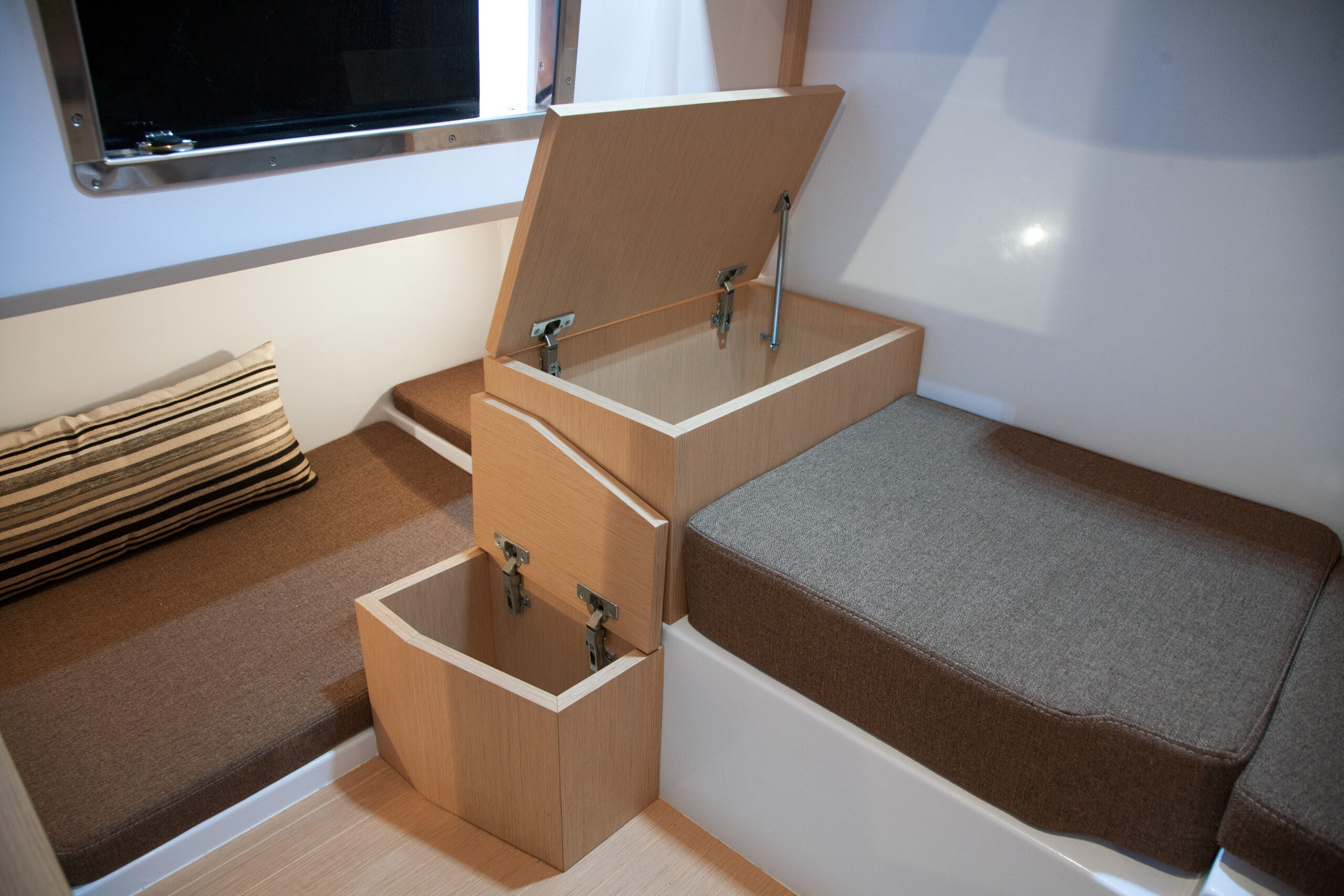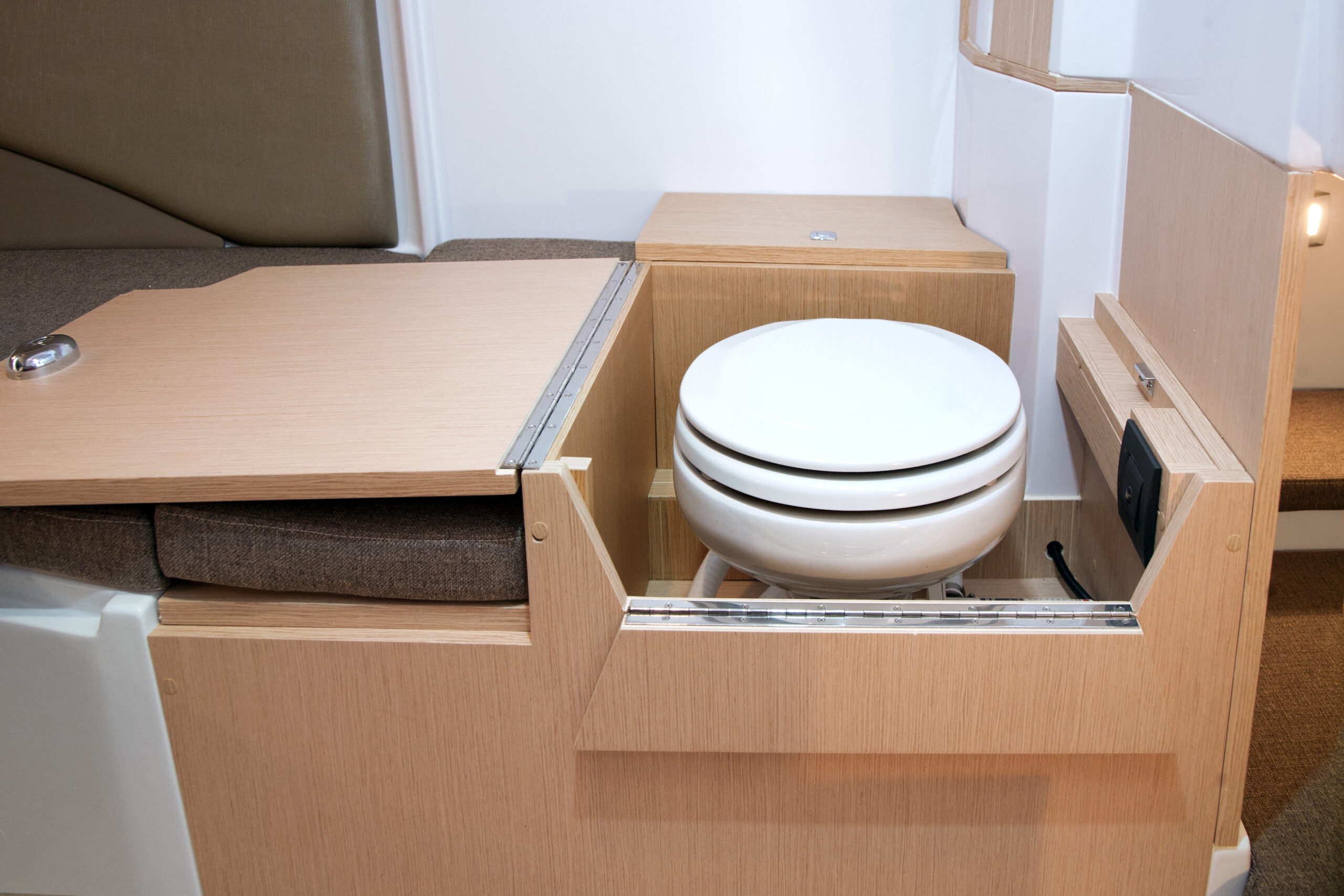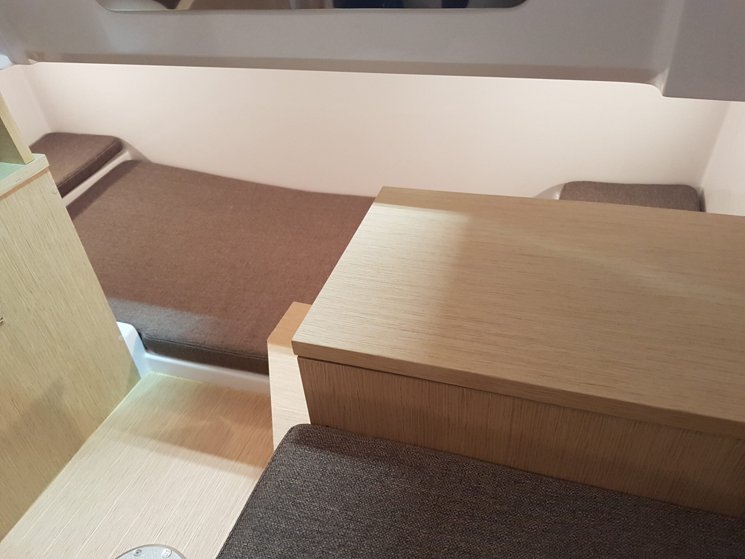 The cockpit layout is pleasant, it consists of a console protected by a windshield surmounted by a stainless steel handrail, securing while move on board. Characteristic of the Next range, there is a large sunbath area on the front deck. The rear part of the Ranieri Next 240 SH offers easy circulation. The cockpit is adjustable to accommodate up to seven people around a table. According to the shipyard, in fact, the Next 240 SH is the first boat under 8 meters with three berths located in two separate spaces. Interiors, in fact, include a large double bed in the bow – which can become an indoor dinette with two opposing sofas – and a third single bed on the side. Hidden inside a locker, there is a marine manual or electric wc. Instead of the third bed, a toilet with wc and washbasin can be installed on the starboard side.