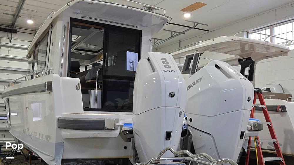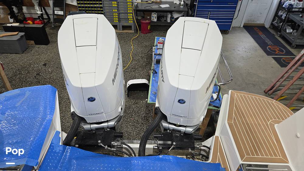 Twin Mercury Verado V10 engines provide 400 horsepower. This beauty also includes features like Joystick Control, Autopilot, and the Zipwake Dynamic Trim Control System.