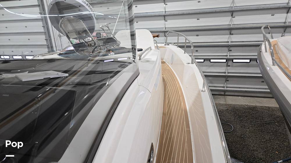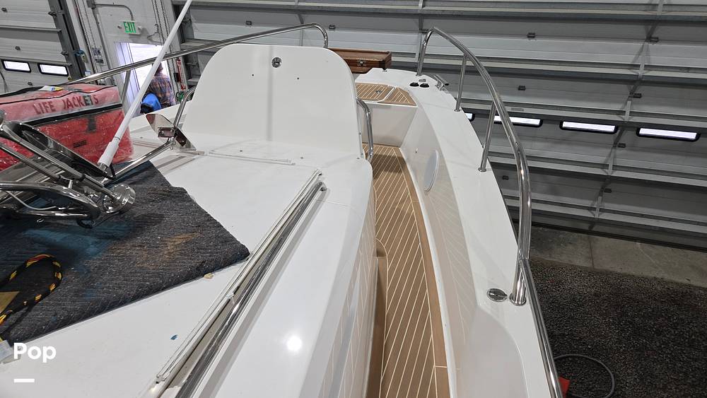 The seating arrangement is highly flexible, offering three functional modes: forward-facing transport for up to nine people, a dinette for lunch, or a large U-sofa for socializing. The twin sliding doors, extra-wide side decks, and wide passageways allow for safe, easy, walk-around access from bow to stern, which is especially convenient for single-handed docking.