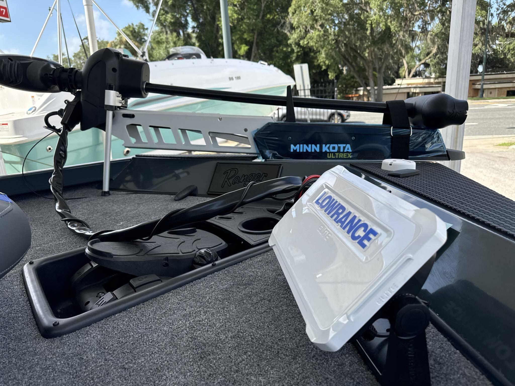 2024 Ranger 178RT $2500 Discount Till July 7th Mercury 75HP Cup Package 1 2- Lowrance 9FS 24V Minn Kota Ultrex The Ranger® RT178 represents the perfect blend of value, features and performance. It enjoys the same build processes as our larger aluminum models, but in a size that will fit in your budget – and your garage. It boasts an 8-foot port rod locker, a recessed trolling motor foot pedal, three tackle-specific storages and an oversized center storage box. The ultra-wide deck and cockpit deliver stability from bow to stern. The .100” hull is filled to the brim with our signature sound-deadening foam flotation for a noticeably smooth and solid feel at all speeds and in all environments. The carpet is rugged all-weather marine-grade, as is the premium vinyl upholstery. A fully featured console houses electronics up to 12 inches, gauges and a cantilevered design to maximize comfort and space. With so much loaded into its 17-foot, 8-inch frame, the RT178 boldly boasts a Brilliant Pedigree With Matching Performance. Options Mercuy 75 HP Minn Kota Edge 70lbs 24volt
