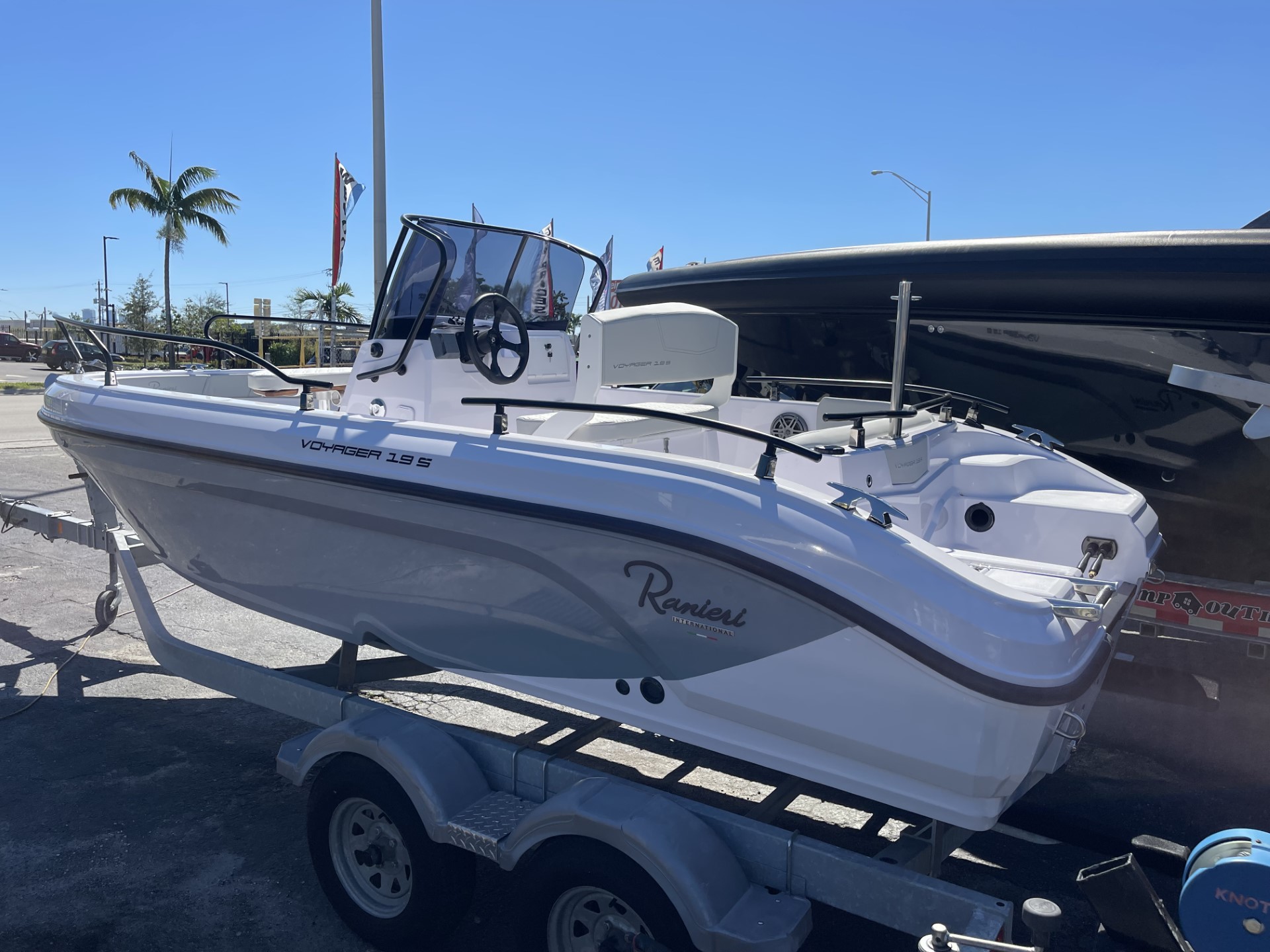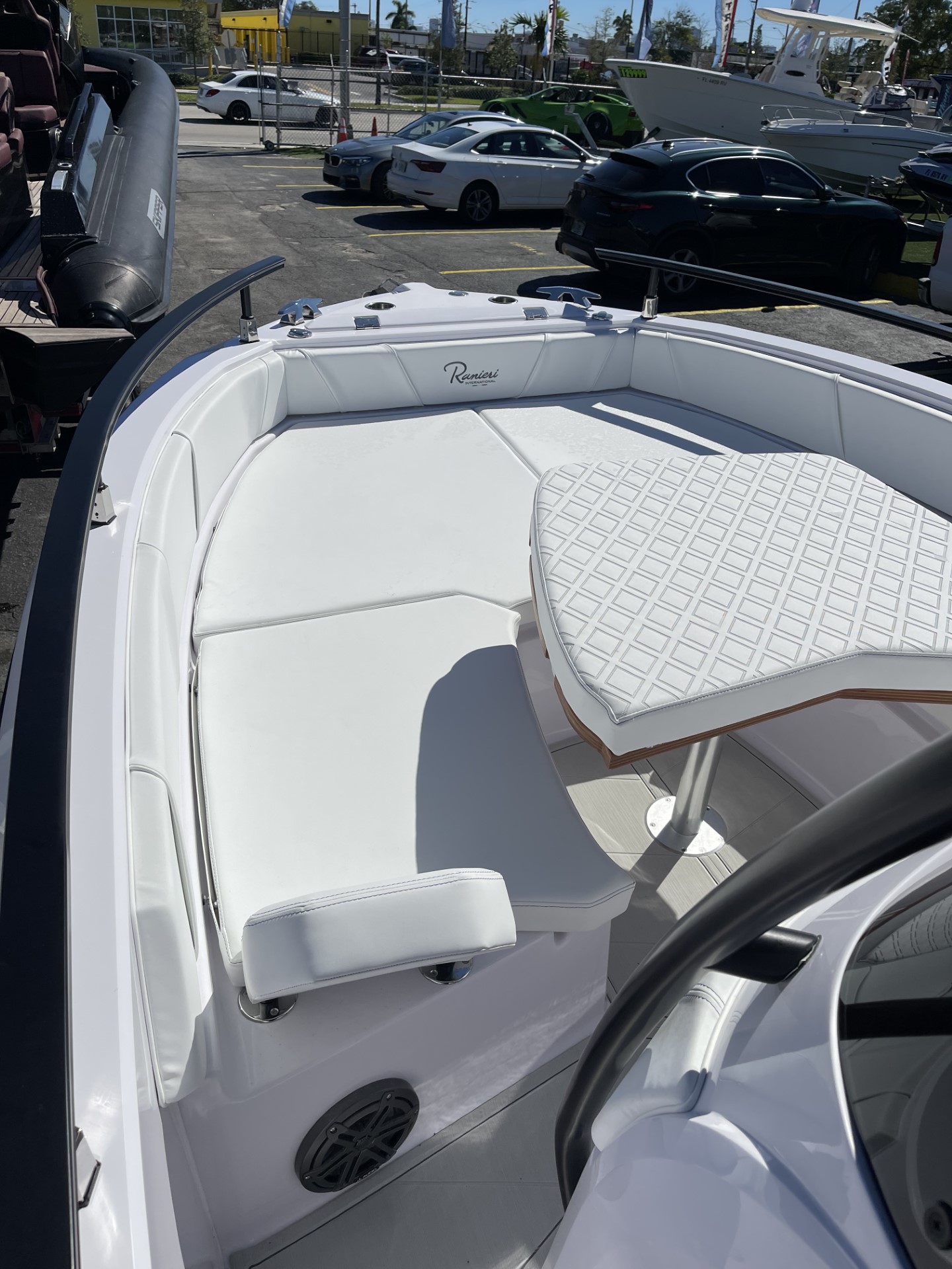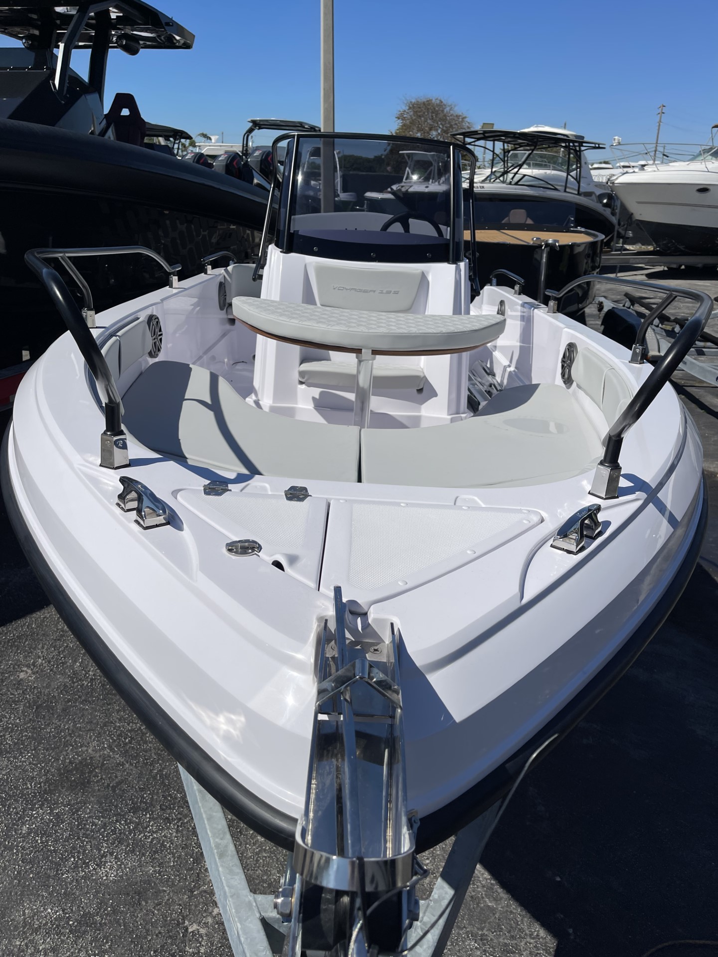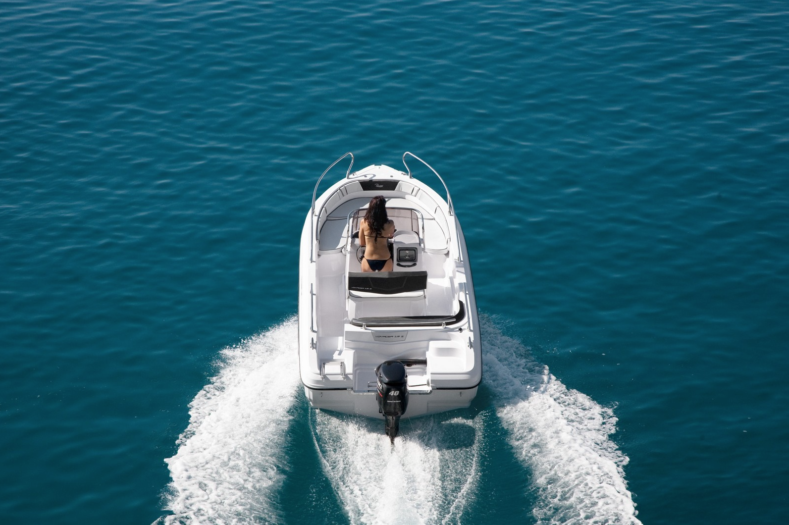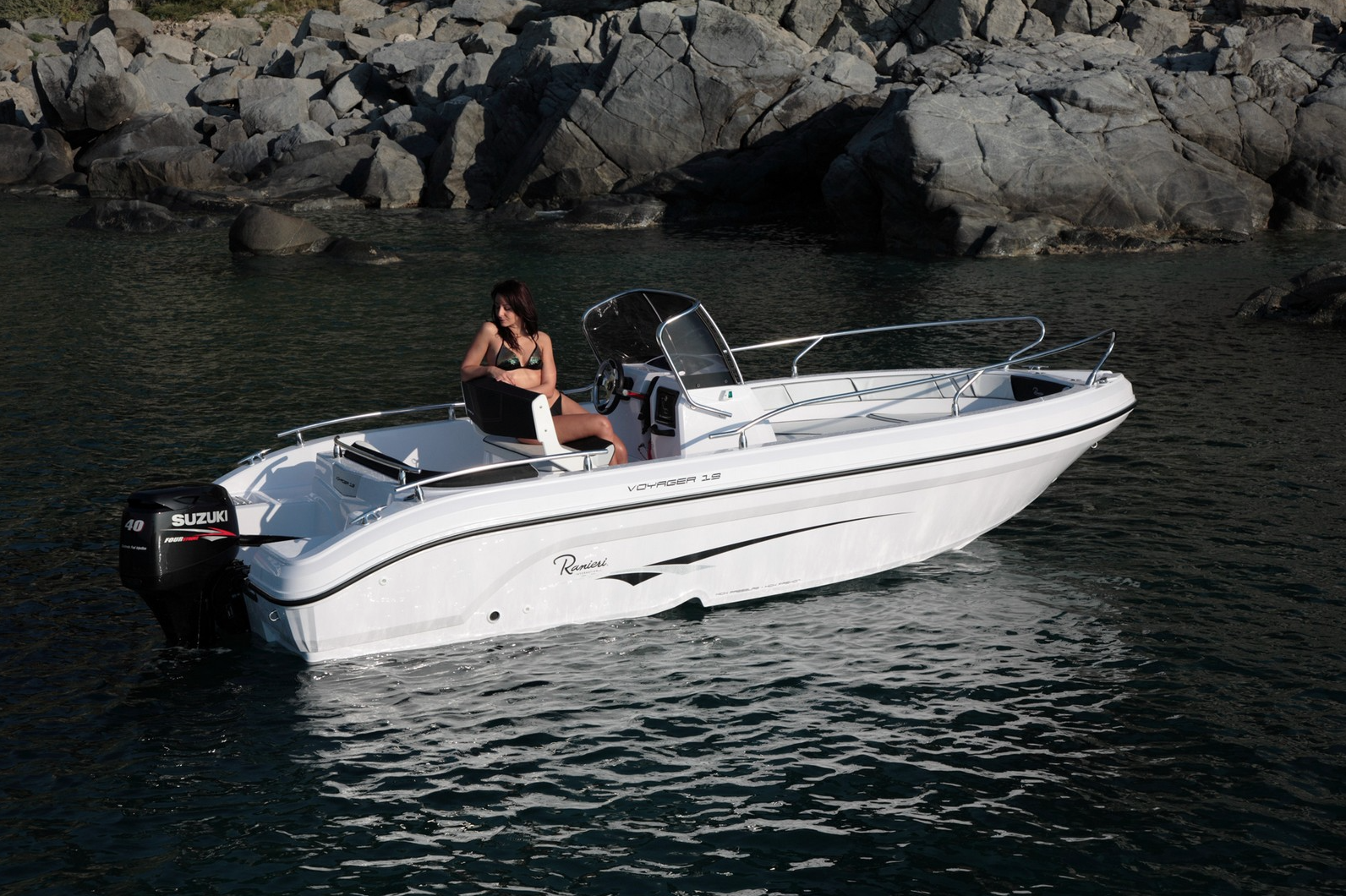 Just like the V19 the deck is self bailing; so the bilge pump will never drain the battery, there's plenty of storage space for all your kit, as well as a cool box for picnicking and a boarding ladder for easy bathing. The 19 features a "stepped hull" which technically bleeds air over the hull surface as your going along, this promotes better fuel efficiency and better performance.