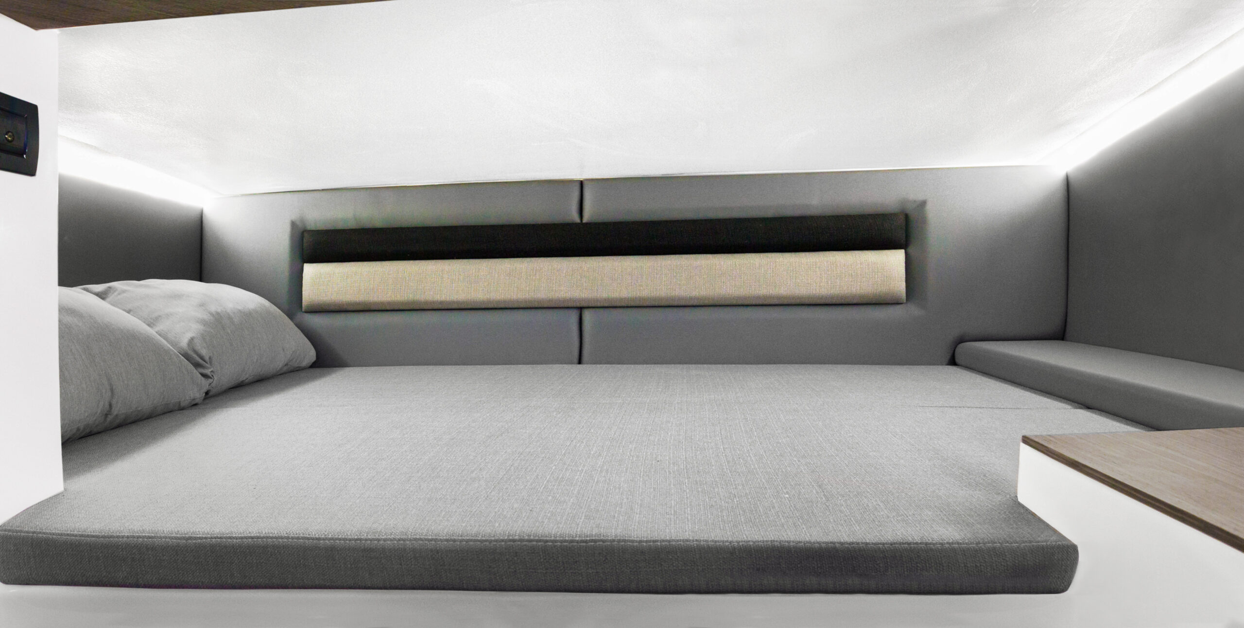 To accommodate, immediately aft, two swim platforms surround the outboard motoring, facilitating both access aboard and descent into the water thanks to a newly conceived design of the entire section. Just beyond, the cockpit unfolds, which features a double folding back sofa seat that can be converted into a sundeck by taking advantage of the table just ahead. On the latter, two fold-down bench seats recessed in the broadside also face each other, while a third fold-down bench is located in the bow, recessed in the wet bar, thus completing the 4 sides of the table with seating. The triple fold-down seat solution is convenient, thus allowing free movement around the entire cockpit.