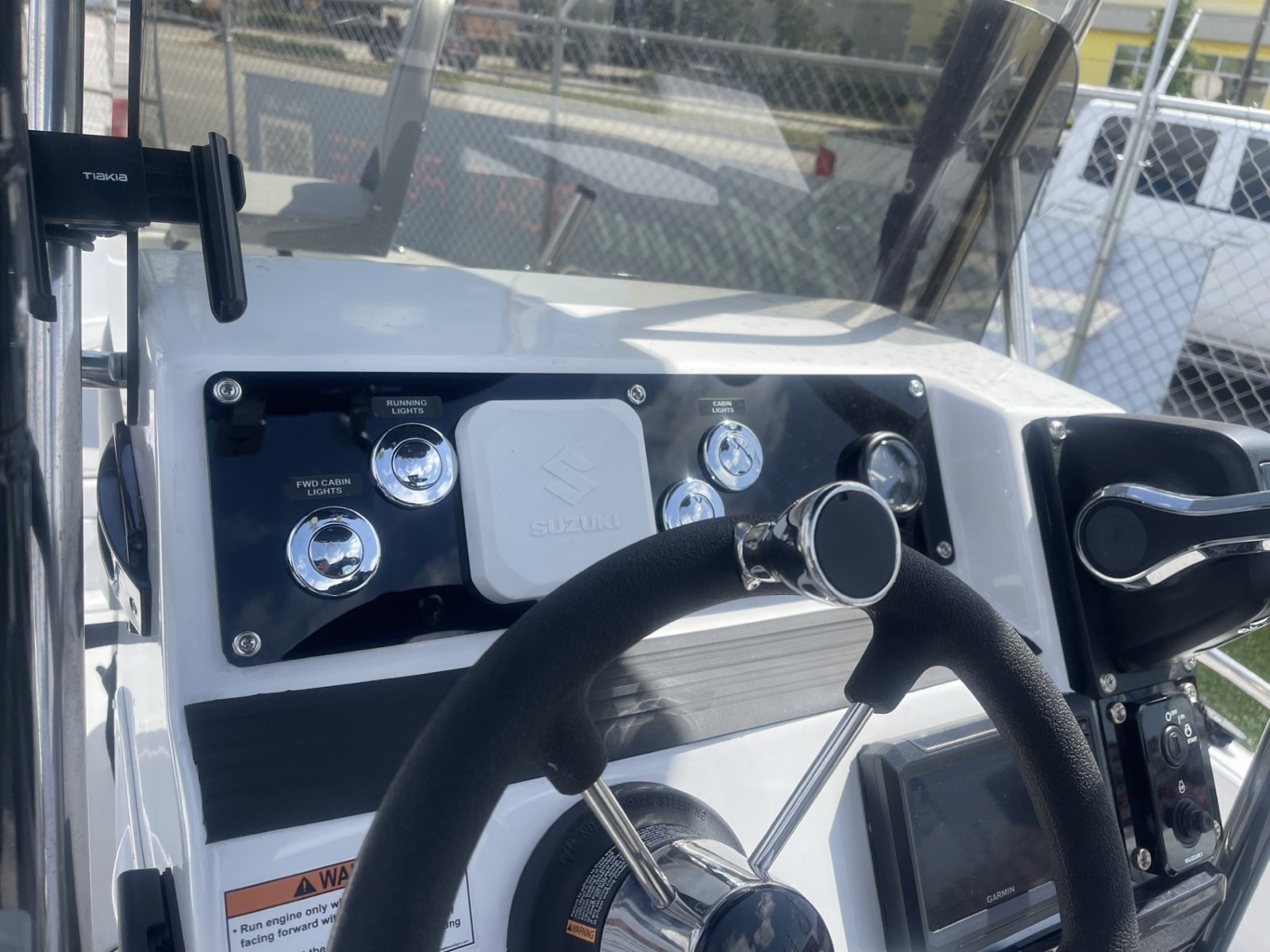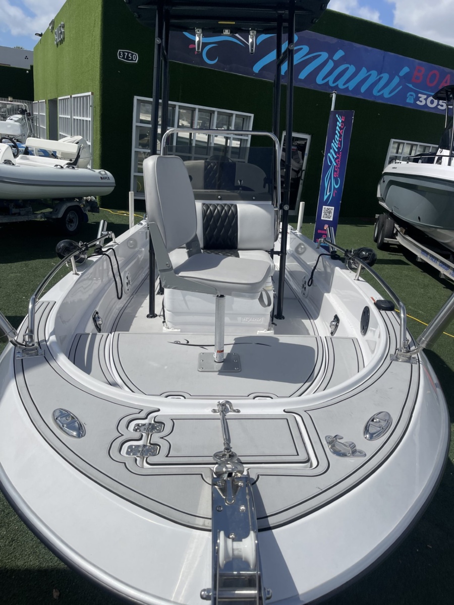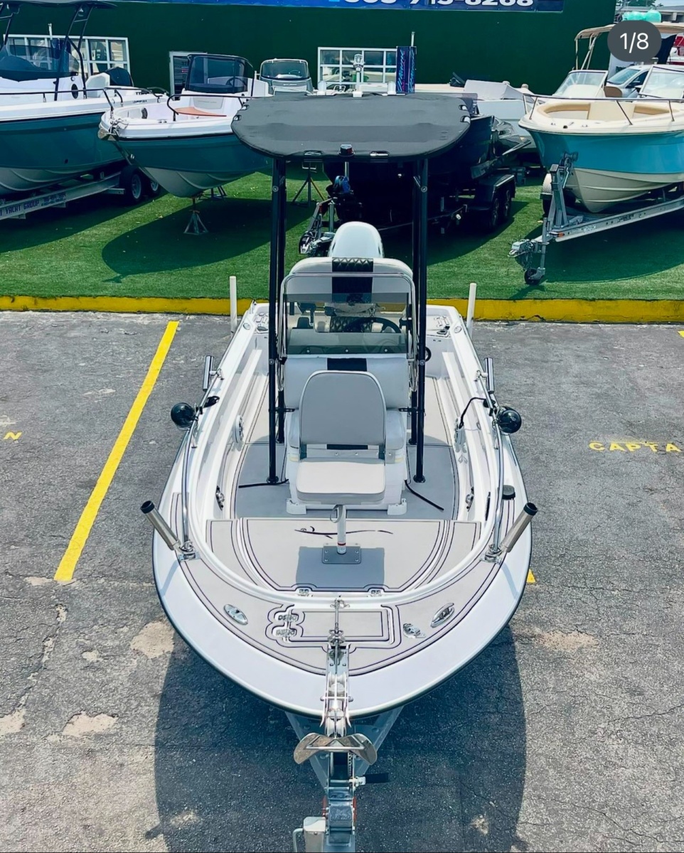 Fishfinder GPS, Phone base, 316 Stainless steel Anchor Bow roller with anchor tensional grabber, 11 Lbs. Delta anchor 316 stainless steel with 4 feet chain, 100 feet nylon rope 3/8", 2 fenders with a pair 3/8" Nylon 6 feet rope, 2 Dock nylon 3/8" lines x 15 feet each. Tackle compartment with 3 lure trays, Extinguisher compartment, first aid kit, 4 white LED interior lights and 2 on transom underwater rated. golve compartment with USB port, 2 Bilge pumps, midle and back, Washdown system with sea water pump and shower, Bluetooth stereo amplifier with 2 Marine Kicker speakers 100 watts, Marine Horn, integral 20 gallon tank with sender and gauge. Unique air pressure-electric relay switches 100% water proof, Custom EVA deck floor 2 colors. Black powder paited aluminum T-Top, 4 Flip up 316 stainless steel cleats and much more.