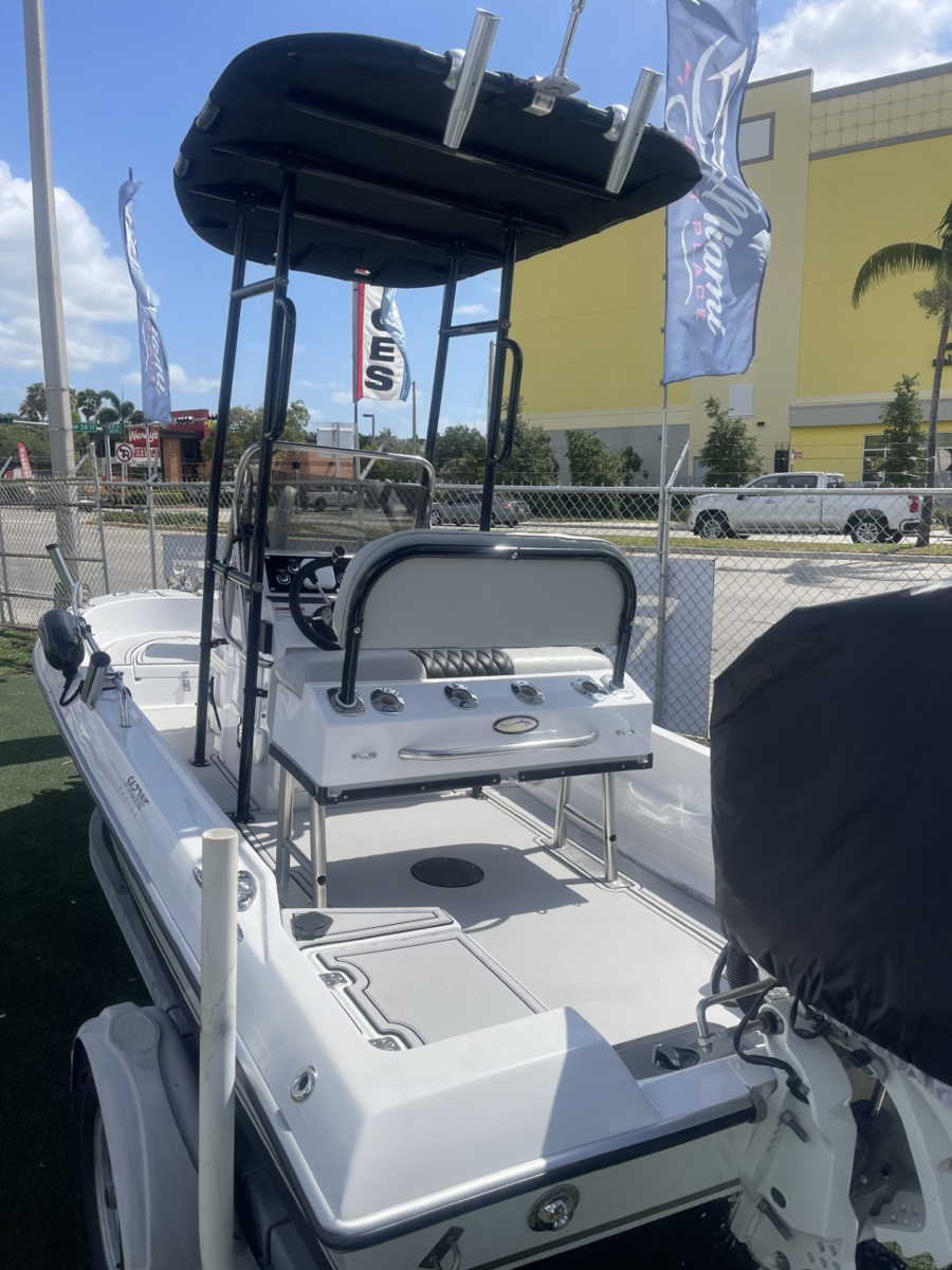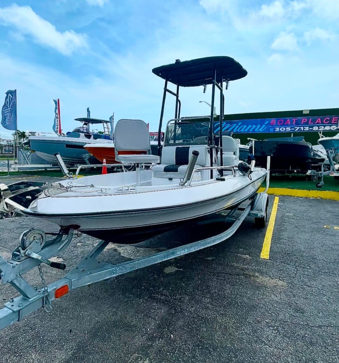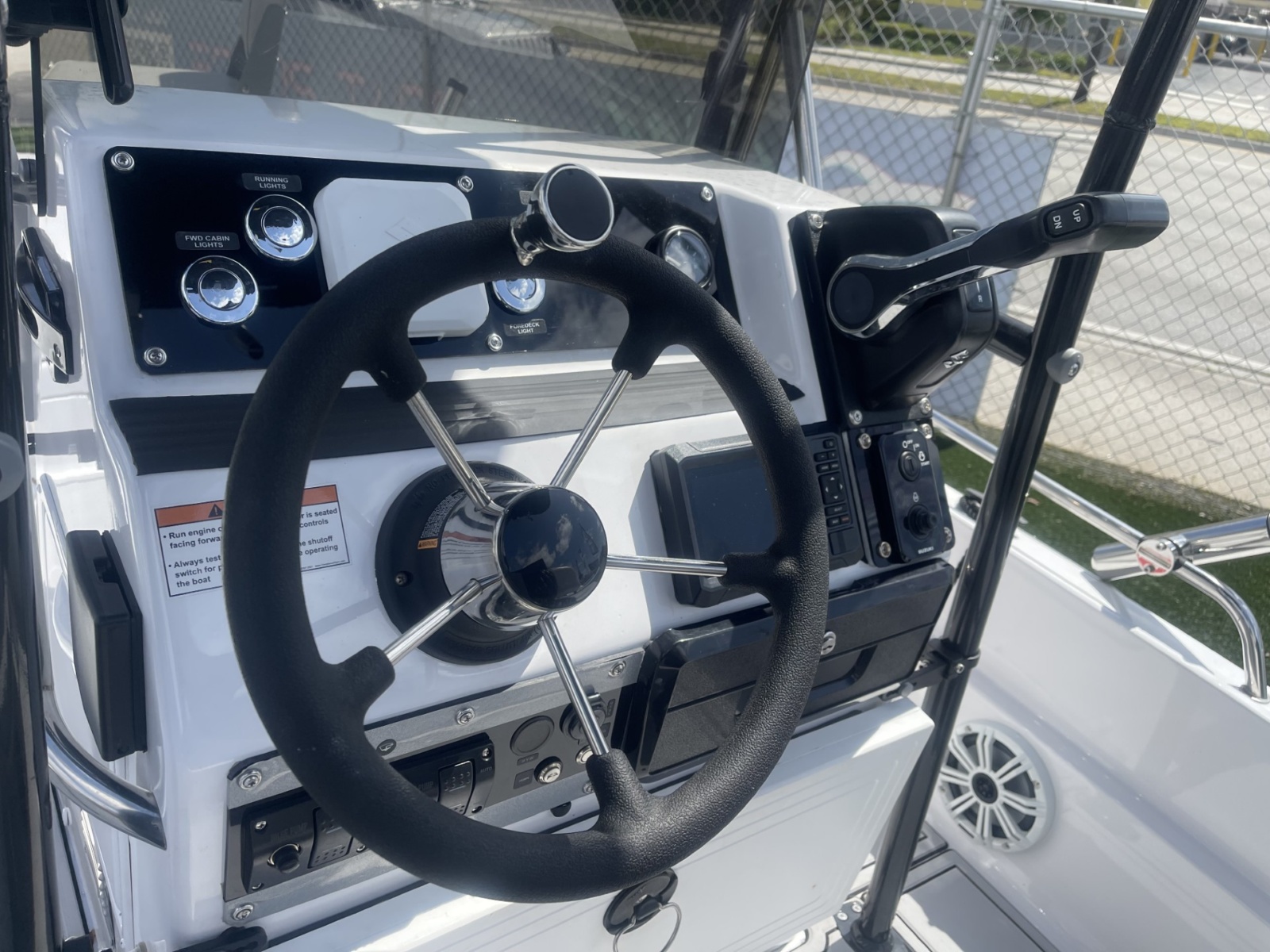 Fishfinder GPS, Phone base, 316 Stainless steel Anchor Bow roller with anchor tensional grabber, 11 Lbs. Delta anchor 316 stainless steel with 4 feet chain, 100 feet nylon rope 3/8", 2 fenders with a pair 3/8" Nylon 6 feet rope, 2 Dock nylon 3/8" lines x 15 feet each. Tackle compartment with 3 lure trays, Extinguisher compartment, first aid kit, 4 white LED interior lights and 2 on transom underwater rated. golve compartment with USB port, 2 Bilge pumps, midle and back, Washdown system with sea water pump and shower, Bluetooth stereo amplifier with 2 Marine Kicker speakers 100 watts, Marine Horn, integral 20 gallon tank with sender and gauge. Unique air pressure-electric relay switches 100% water proof, Custom EVA deck floor 2 colors. Black powder paited aluminum T-Top, 4 Flip up 316 stainless steel cleats and much more.