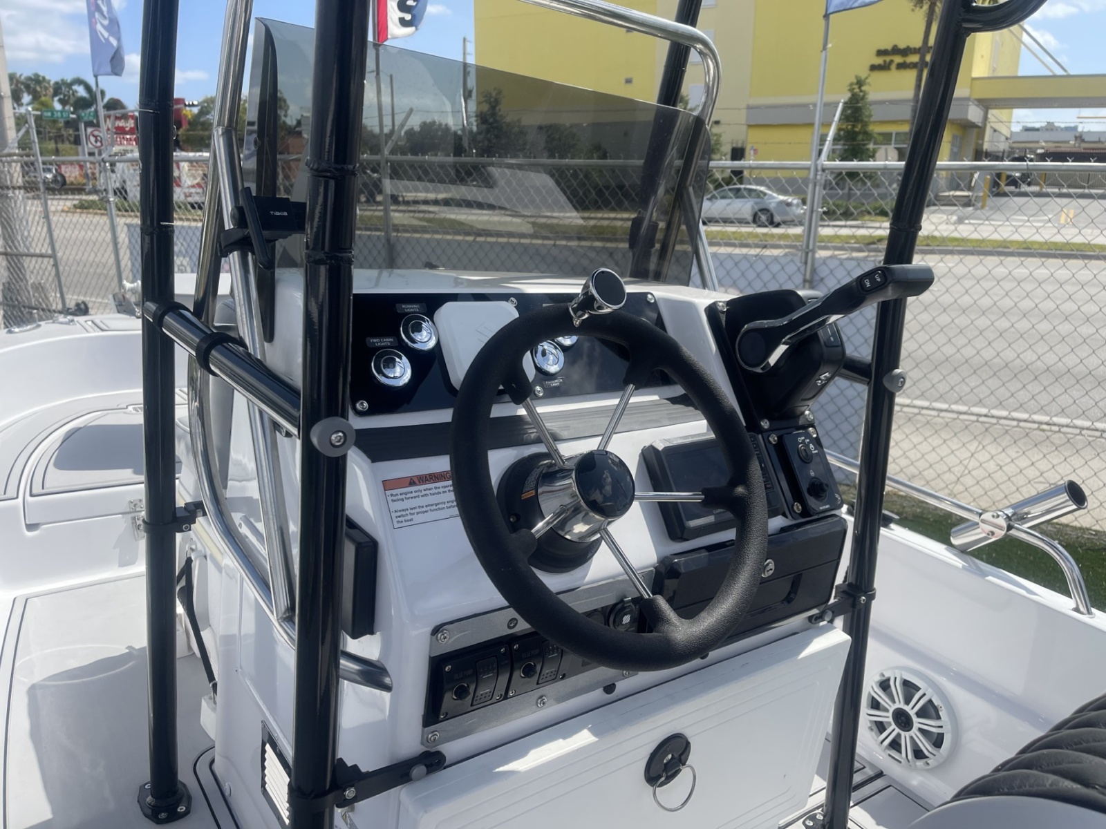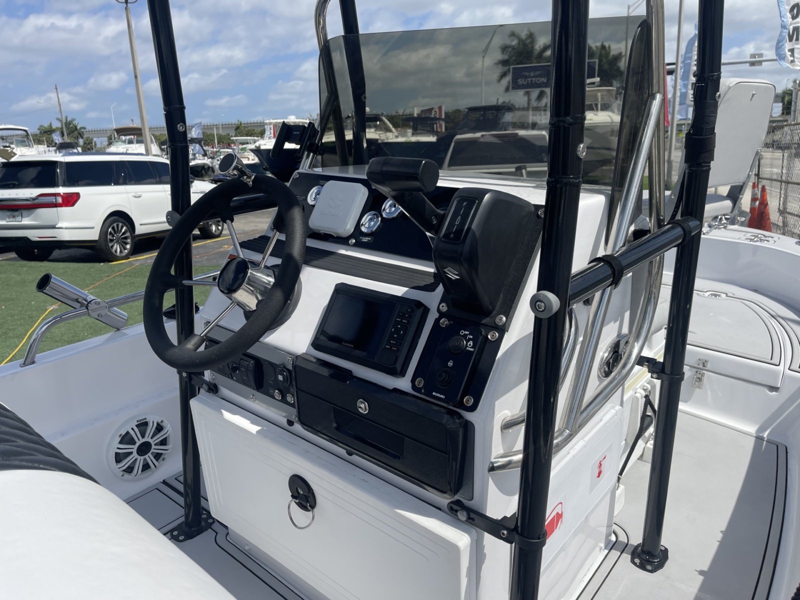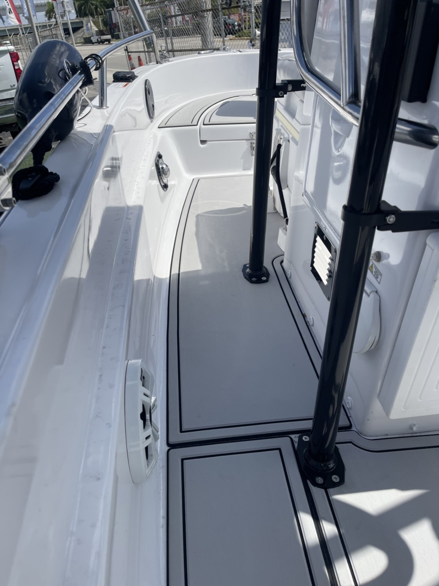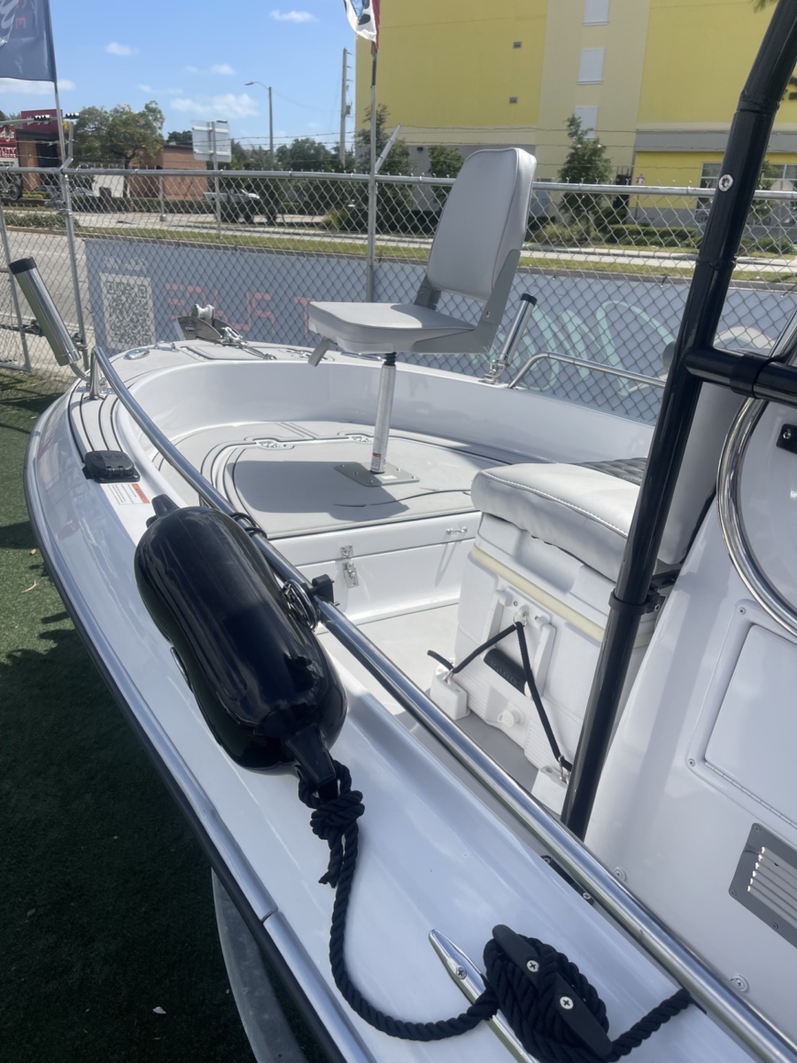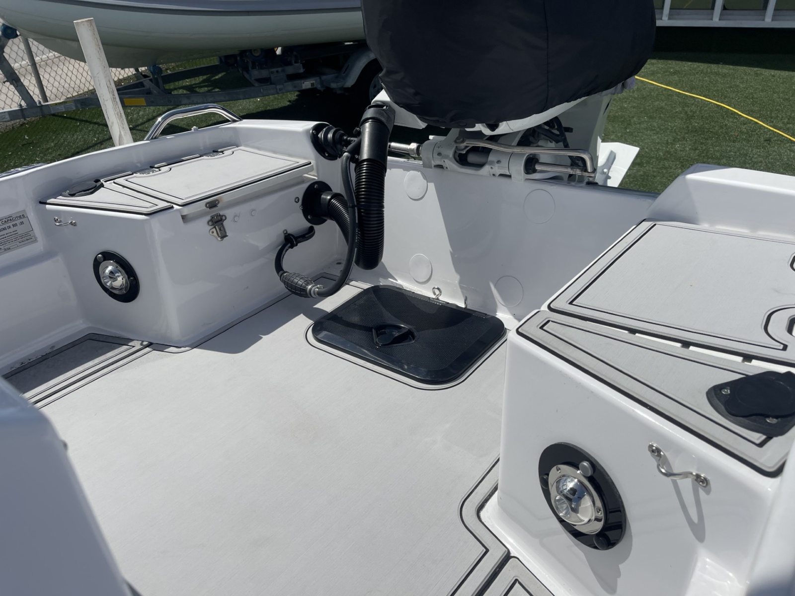 Fishfinder GPS, Phone base, 316 Stainless steel Anchor Bow roller with anchor tensional grabber, 11 Lbs. Delta anchor 316 stainless steel with 4 feet chain, 100 feet nylon rope 3/8", 2 fenders with a pair 3/8" Nylon 6 feet rope, 2 Dock nylon 3/8" lines x 15 feet each. Tackle compartment with 3 lure trays, Extinguisher compartment, first aid kit, 4 white LED interior lights and 2 on transom underwater rated. golve compartment with USB port, 2 Bilge pumps, midle and back, Washdown system with sea water pump and shower, Bluetooth stereo amplifier with 2 Marine Kicker speakers 100 watts, Marine Horn, integral 20 gallon tank with sender and gauge. Unique air pressure-electric relay switches 100% water proof, Custom EVA deck floor 2 colors. Black powder