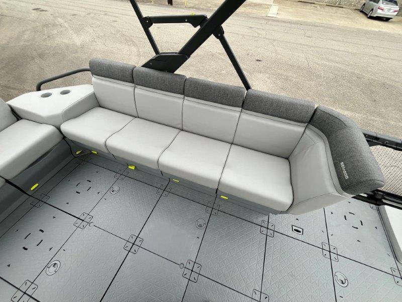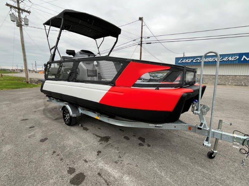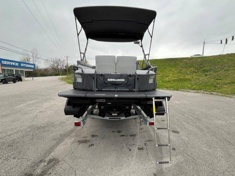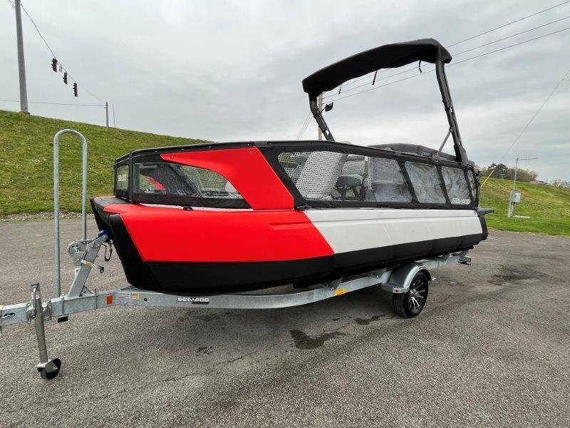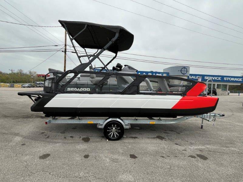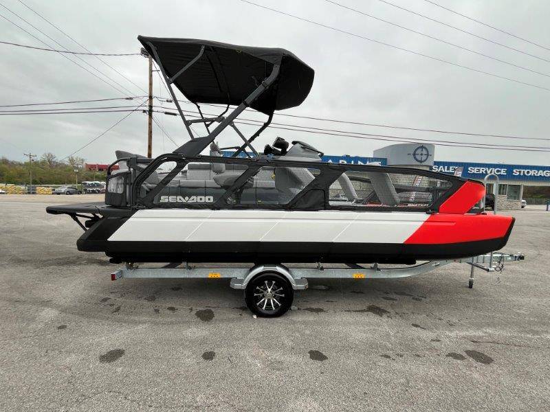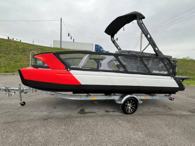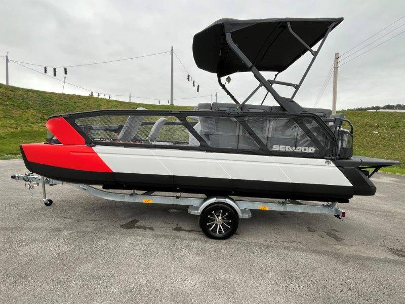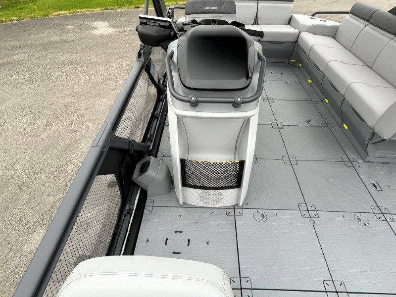 Love being in the water as much as on the water? The Switch Sport brings fast-paced fun to life. Readily equipped for watersports with ski mode, inflatable holder and rearview mirror, the fun never ends. The Switch Sport 21 is the perfect party deck for water lovers. With capacity for 10, there's plenty of room for friends and family to enjoy all the thrills and action out on the water together. Features may include: Trailer Included Ready to go All Switch boats come complete with high-quality, powder coated trailer included straight from the dealership. Galvanized trailer finish is also optional. Nothing Quite Like It Unmistakable style and handling There’s nothing quite like being seated behind the unique handlebar controls of the Switch. Intuitive control with Intelligent Brake and Reverse (iBR) stops the boat sooner and simplifies docking and handling. Fully Customized Fit A personalized entertainment zone Every inch of floor space is designed to meet your every need – even when they change. The innovative tile system lets you transform the onboard layout in seconds without tools for unparalleled adaptability. Feel the ride Full of excitement and confidence The Switch Tri-hull design creates a whole new feeling on a pontoon. The outer pontoons are set slightly higher in the water, adding confident stability and nimble performance. Rotax 1630 ACE™ Engine Power to play Every Switch Sport comes with high-thrill power thanks to a proven Rotax 1630 ACE engine. The jet propulsion system offers outsized excitement with a level of maneuverability never seen on a pontoon boat. Stay Cool Shade when you need it When the ride calls for a cool down this sturdy Bimini top deploys in seconds. The aluminum frame and high-grade marine canvas offer essential protection from sun and the elements. Equipped for Towing Sea-Doo exclusive tow sport features Ski Mode, rearview mirror and quick-attach inflatable holder have you ready for whenever the wake beckons. Sprawling floor space Soak in the Sea-Doo Life Sit, stretch out or sunbathe in ultimate comfort with the sun pads and backrests in the front lounge area. Clear-view side panels let you take in the action with a unique proximity to the water. Garmin ECHOMAP™ GPS Navigation Never lose your way Wander new waters with confidence. Top-of-the-line Garmin navigation system and chartplotter with optional fish-finder capability keep you on top of everything under the surface.