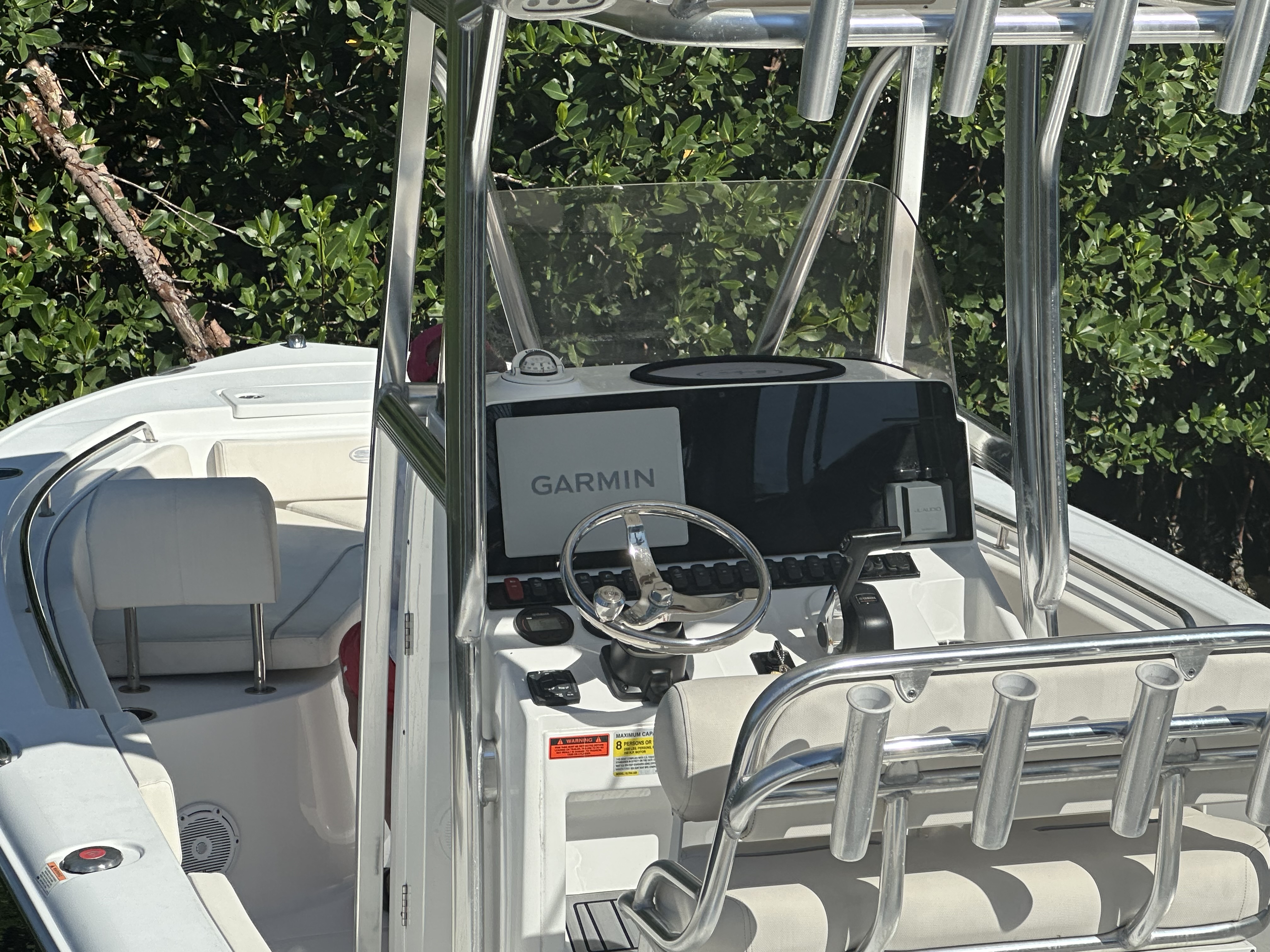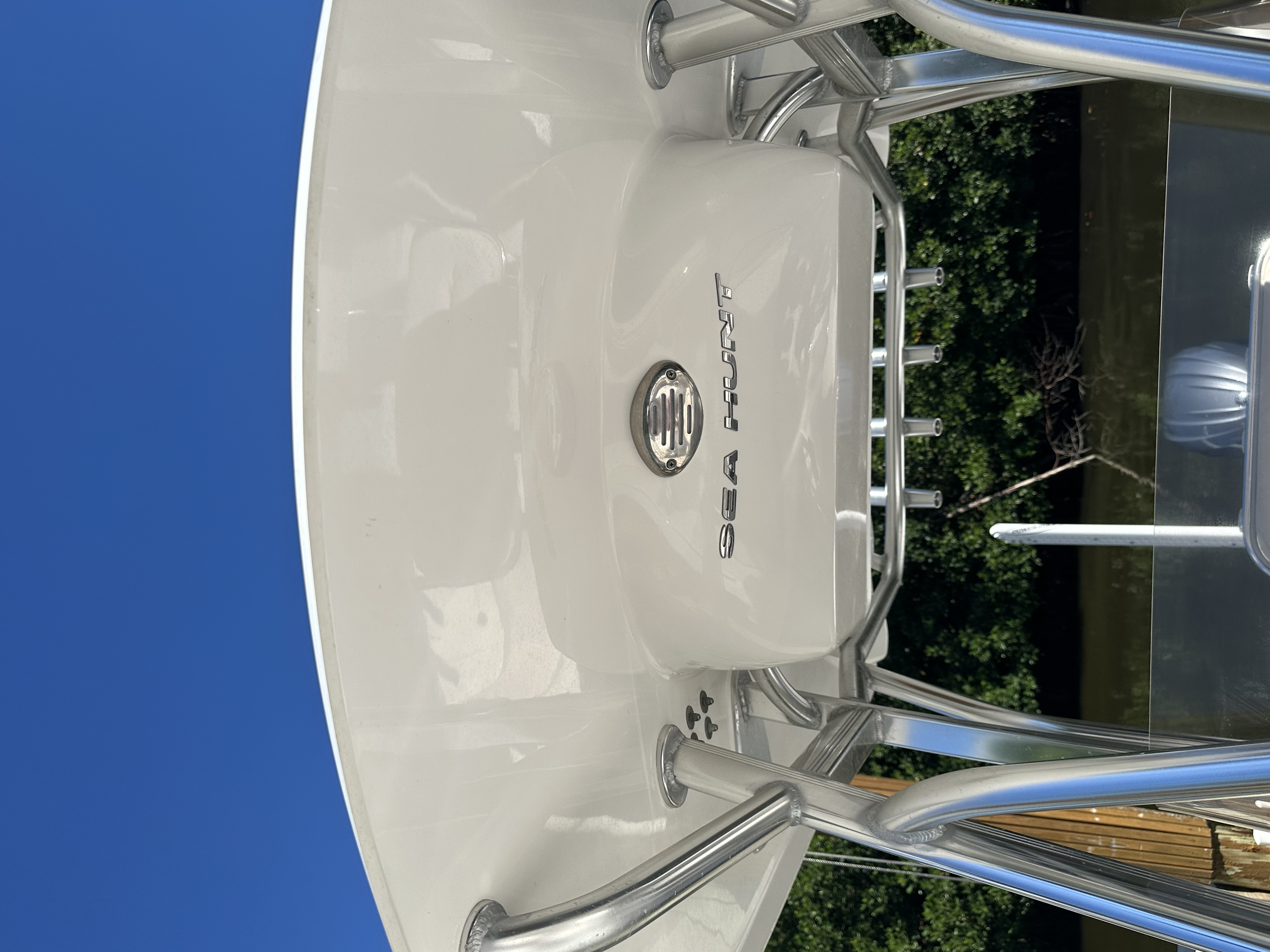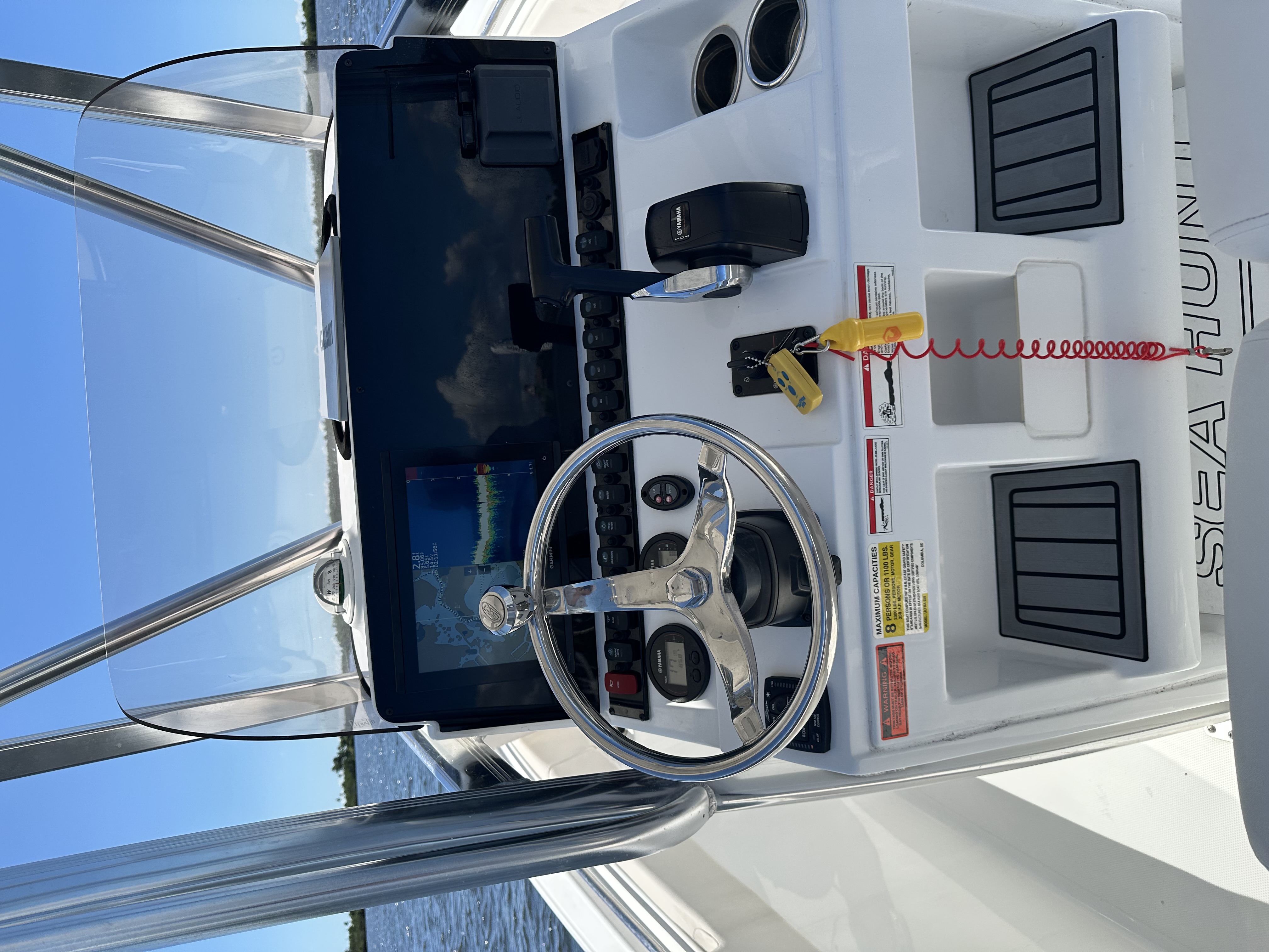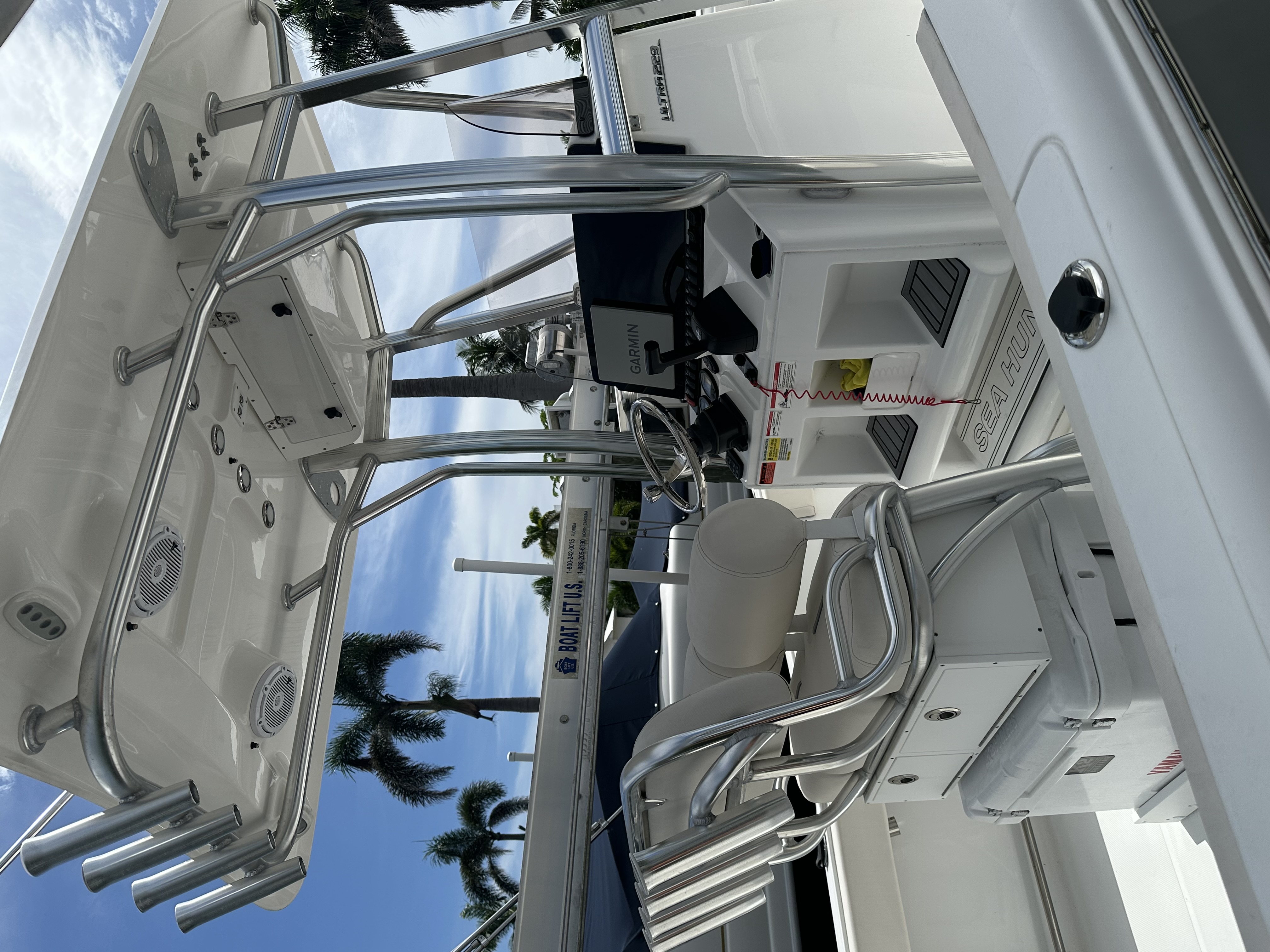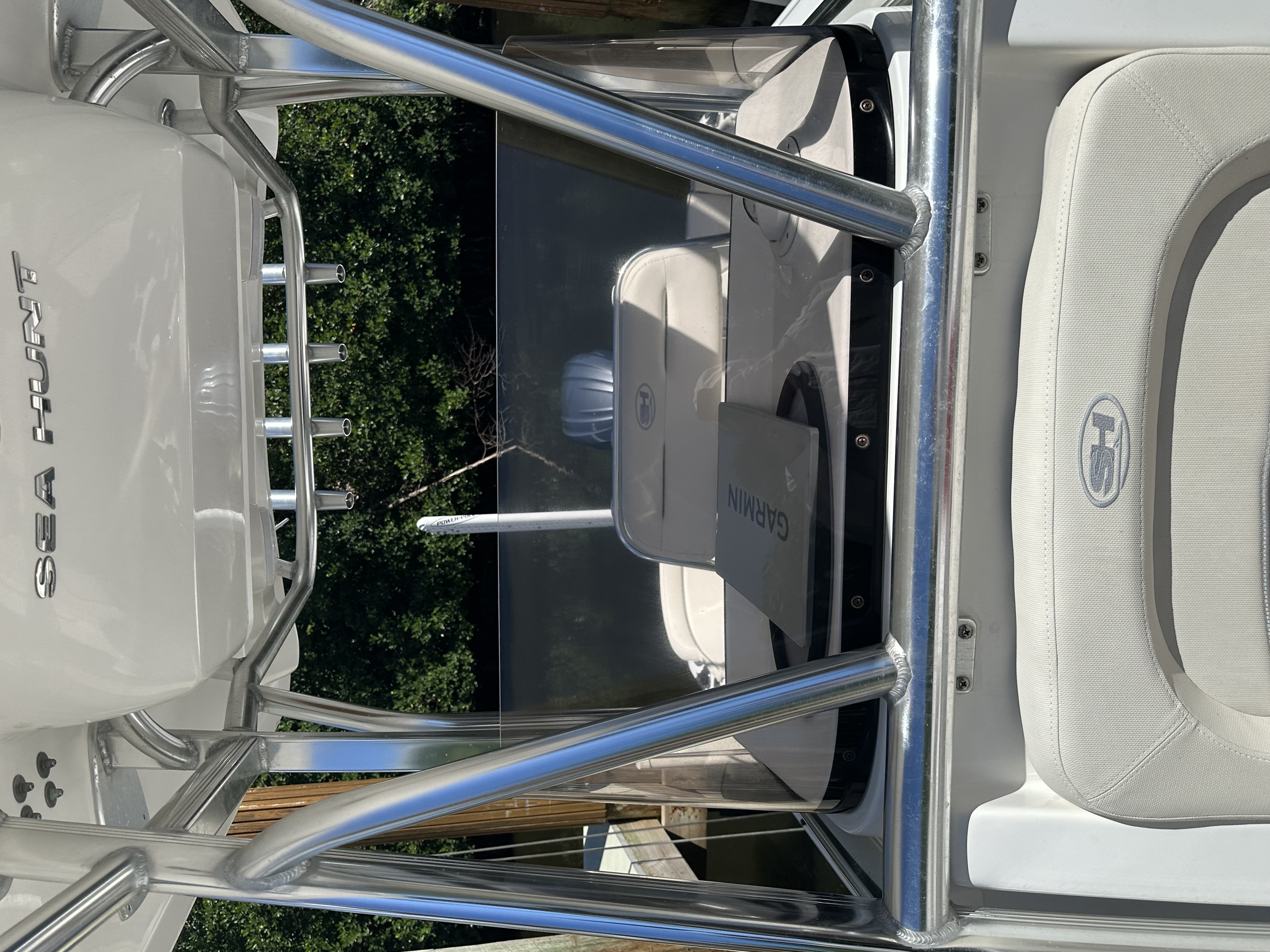 2024 Sea Hunt 239 Ultra Wuth 200 HP Yamaha 12 Garmin Touch Screen VHF Radio 20 Foot Power Pole Fiberglass T Top with Misters Spreader Lights Extended Warranty Blue /Grey Colored Hull Only 87 Hours Just serviced