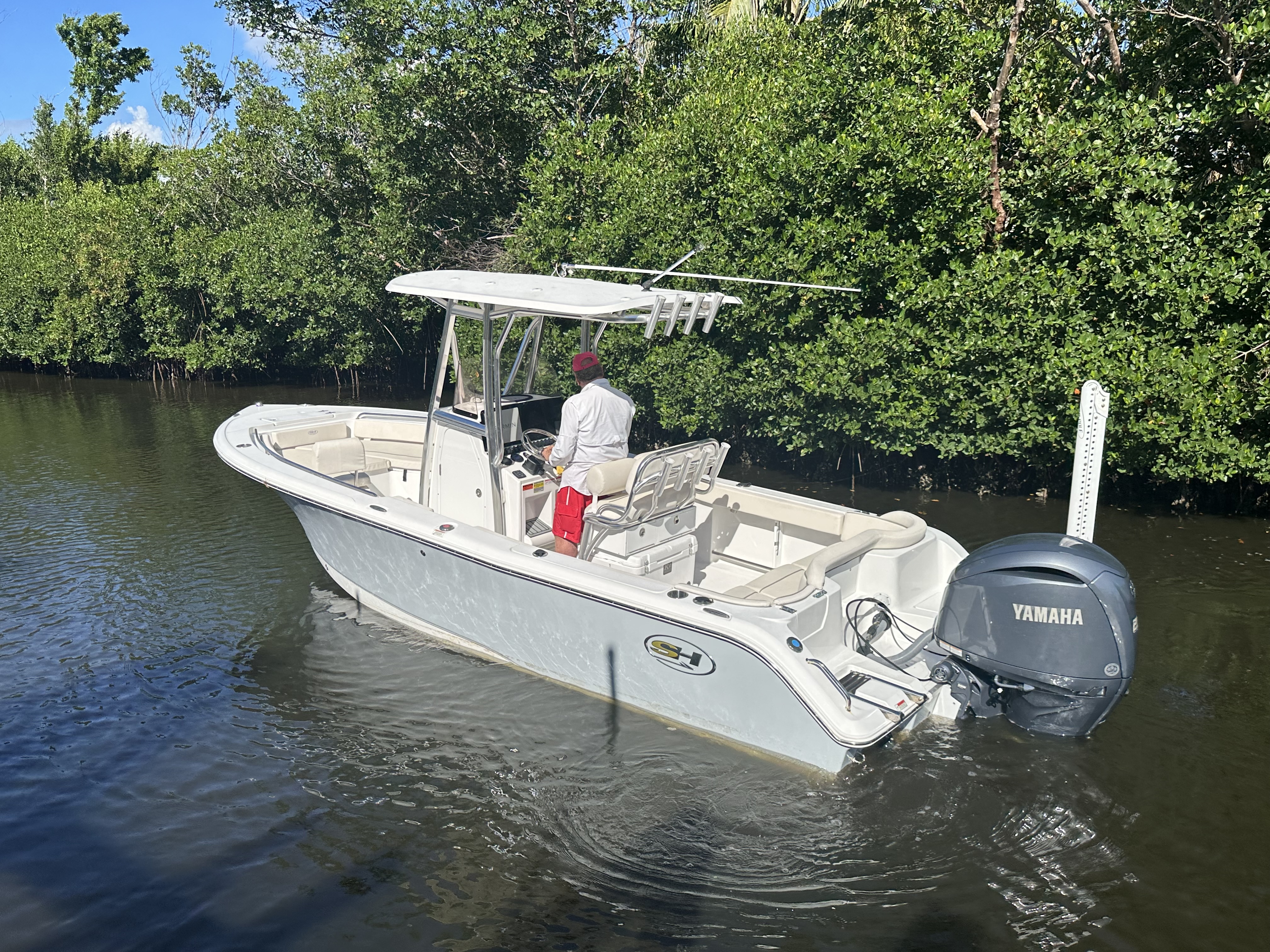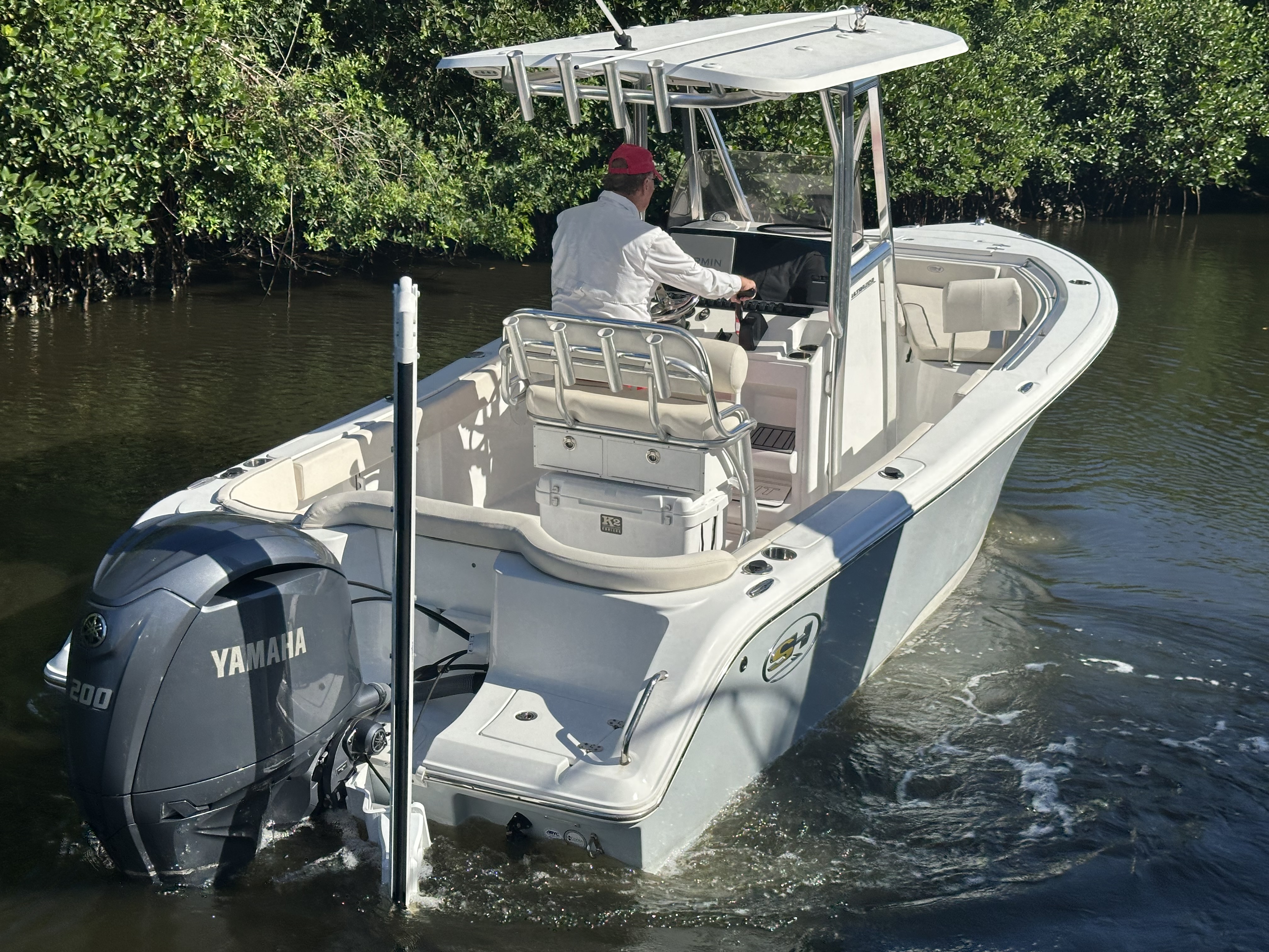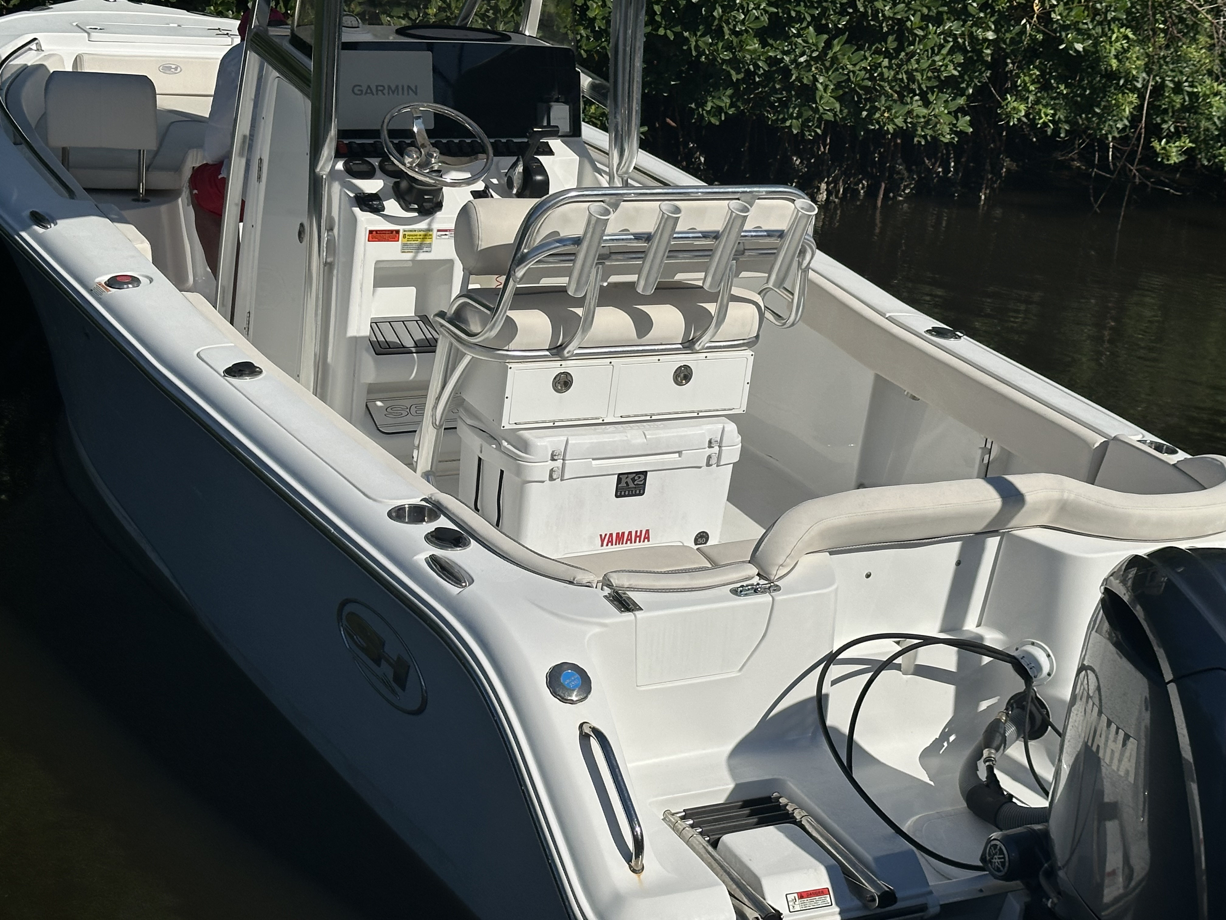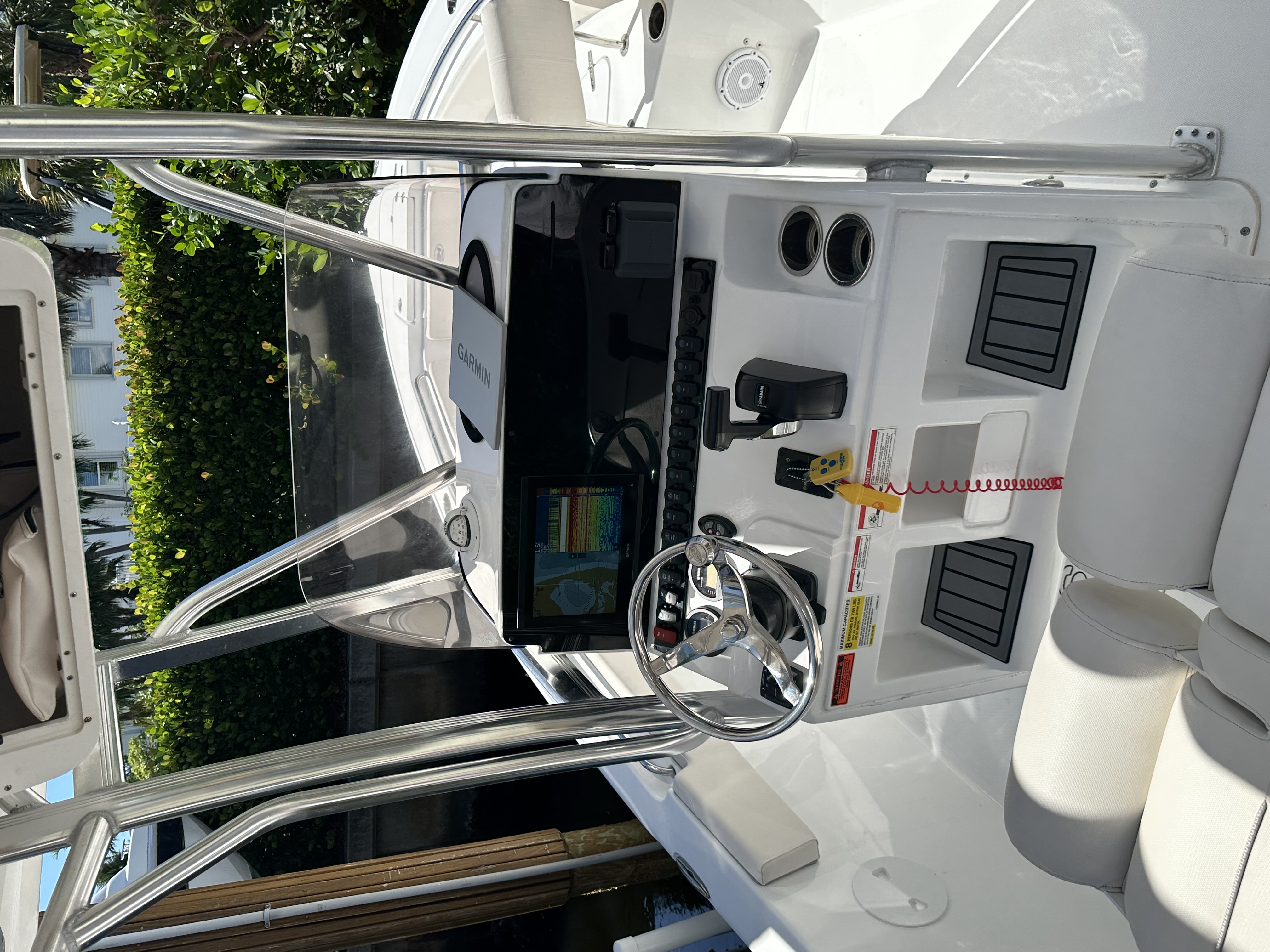 2024 Sea Hunt 239 Ultra Wuth 200 HP Yamaha 12 Garmin Touch Screen VHF Radio 20 Foot Power Pole Fiberglass T Top with Misters Spreader Lights Extended Warranty Blue /Grey Colored Hull Only 87 Hours Just serviced