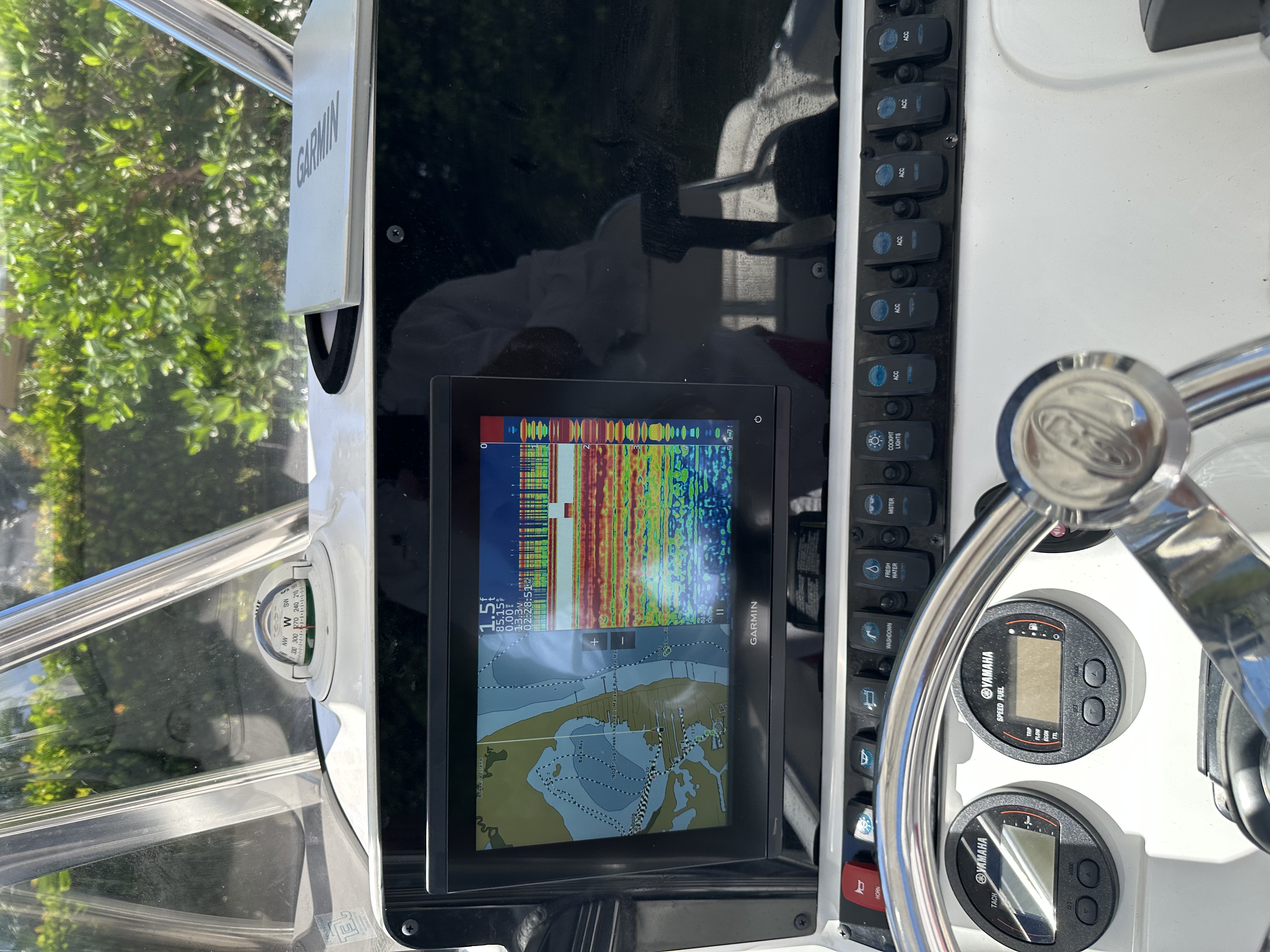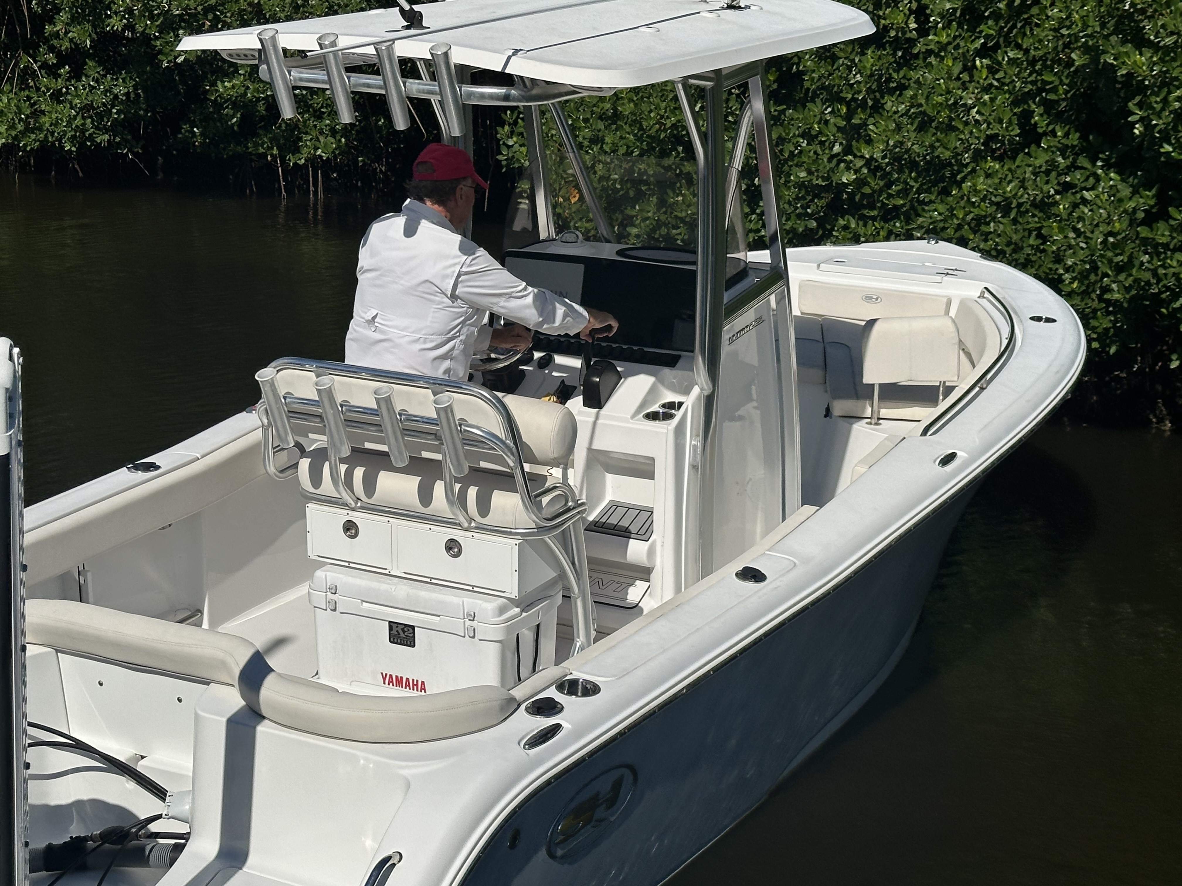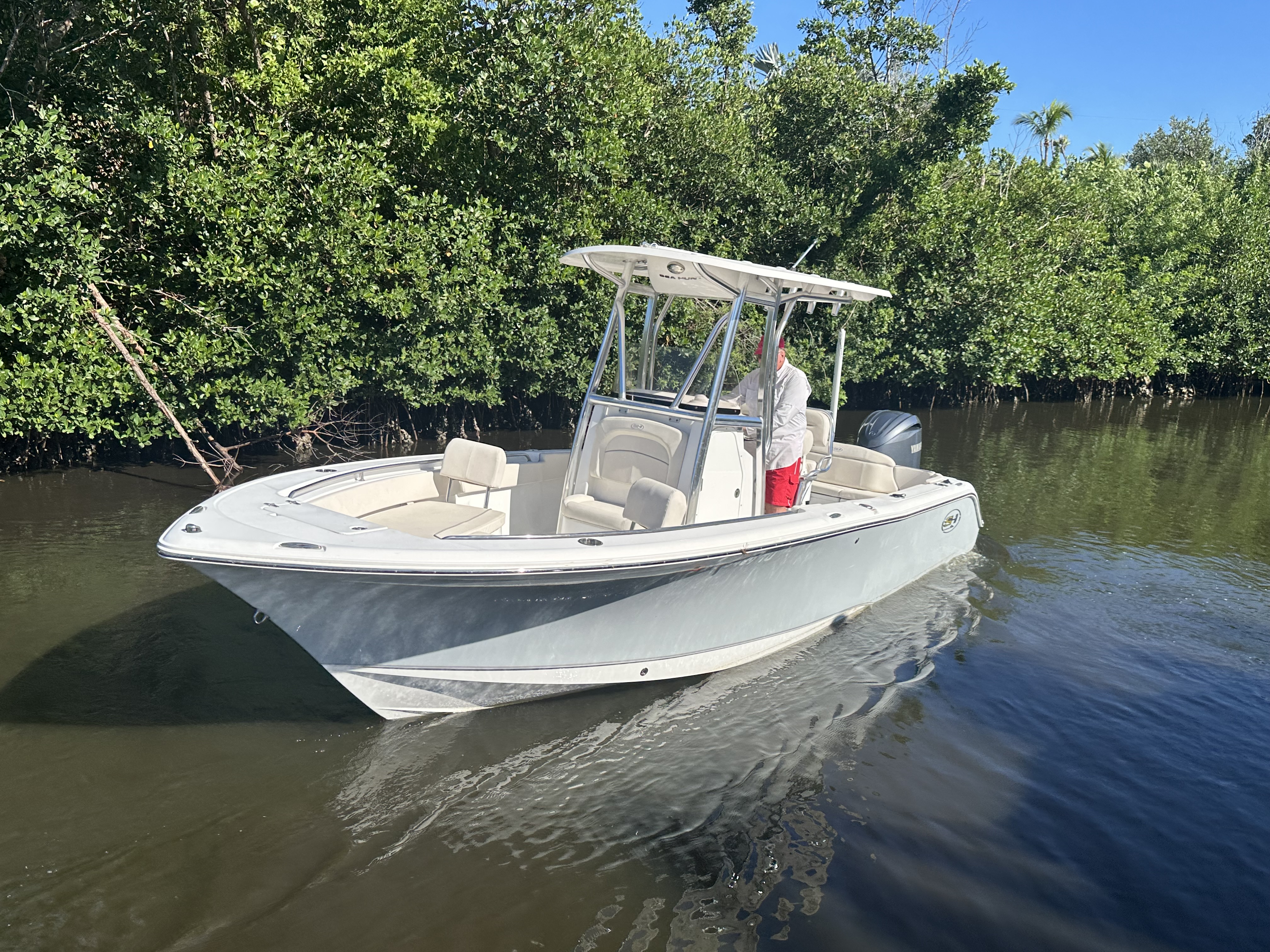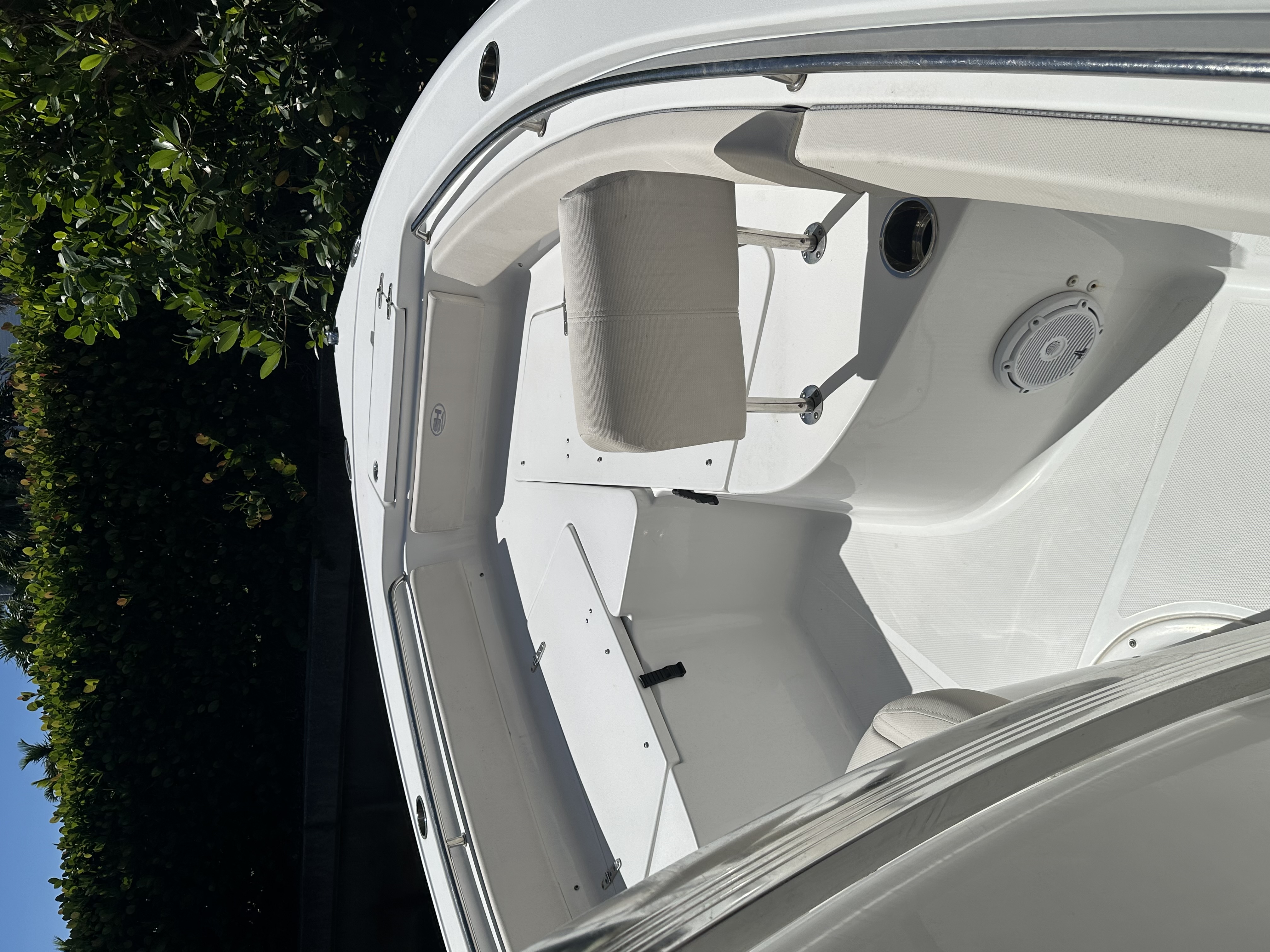 2024 Sea Hunt 239 Ultra Wuth 200 HP Yamaha 12 Garmin Touch Screen VHF Radio 20 Foot Power Pole Fiberglass T Top with Misters Spreader Lights Extended Warranty Blue /Grey Colored Hull Only 87 Hours Just serviced