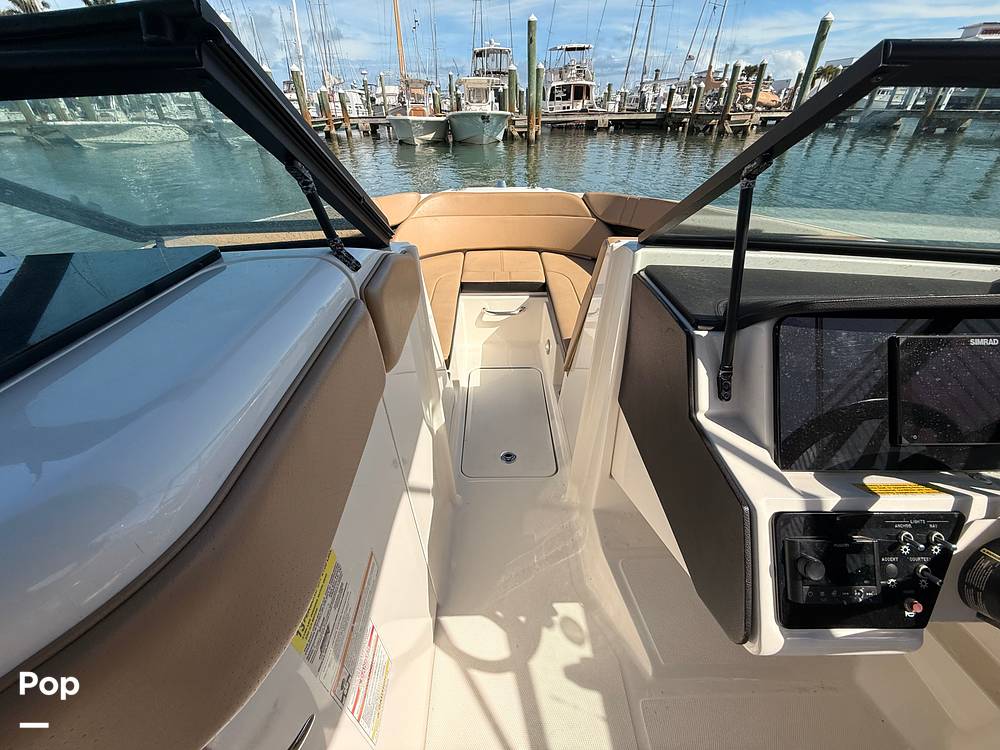 All key functions are within easy reach, with a Simrad display for navigation and a Fusion Bluetooth stereo system delivering clear audio through marine-grade speakers. A private changing room/head compartment provides comfort and convenience, and ample storage keeps your gear neatly organized.