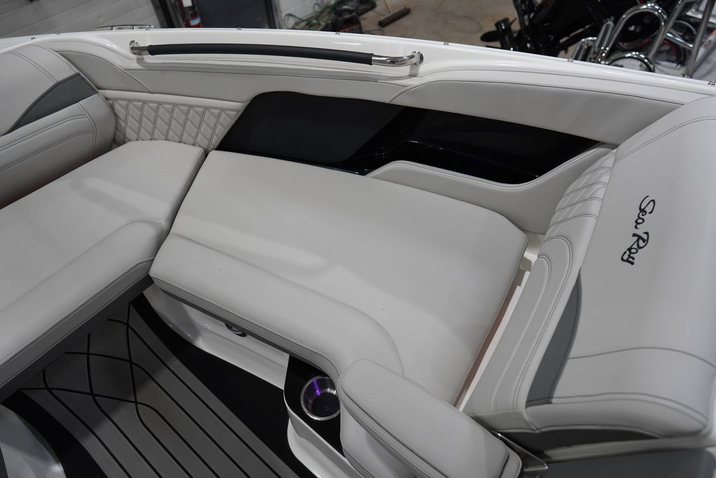 COMFORTS ON THE WAVESFor maximum comfort while cruising, the cockpit features an updated layout and deeper seats to promote ergonomics. At the transom, the luxurious expanded sunpad encourages lounging next to the water. The swim platform with a manual submersible step provides easy access to the water and facilitates reboarding. Convenient storage has been incorporated throughout the boat, including an integrated cooler or dry storage spot under the sunpad and a transom locker for stowing gear, floating water mats and inflatables.