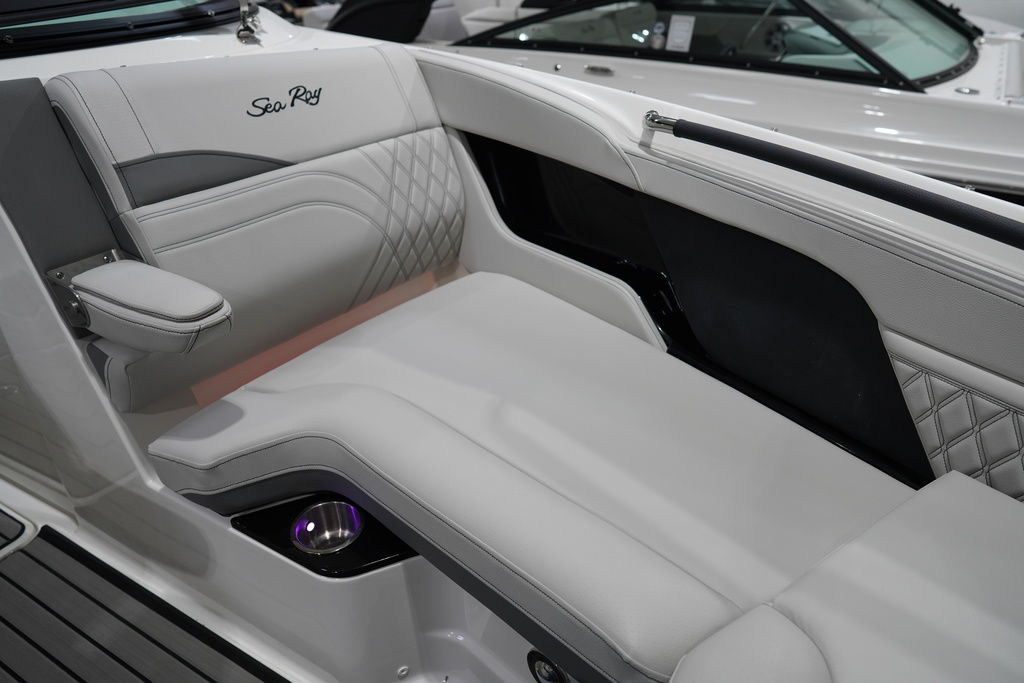 BRIGHT NIGHTSThere’s no need to rush back to the dock when the sun starts to set. The SLX 260 Surf is equipped with LED lights and courtesy lighting to keep the fun going after dark. To further enhance nighttime entertaining, LED RGB-W color-changing lighting and a Sea Ray logo light projection that shines on the cockpit floor are available with the Lighting bundle.