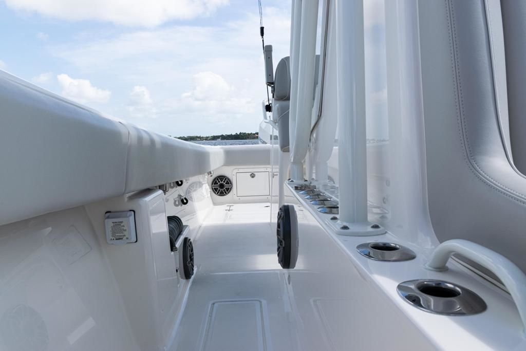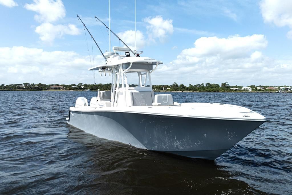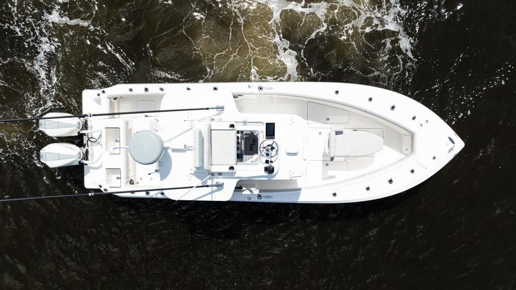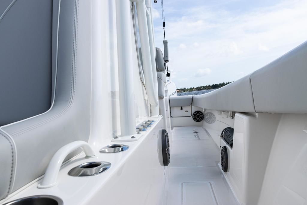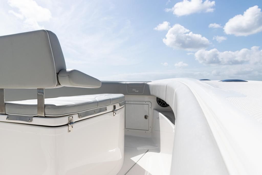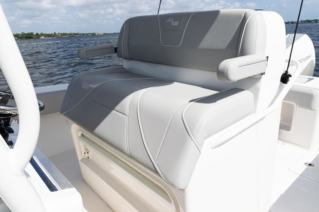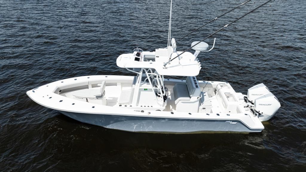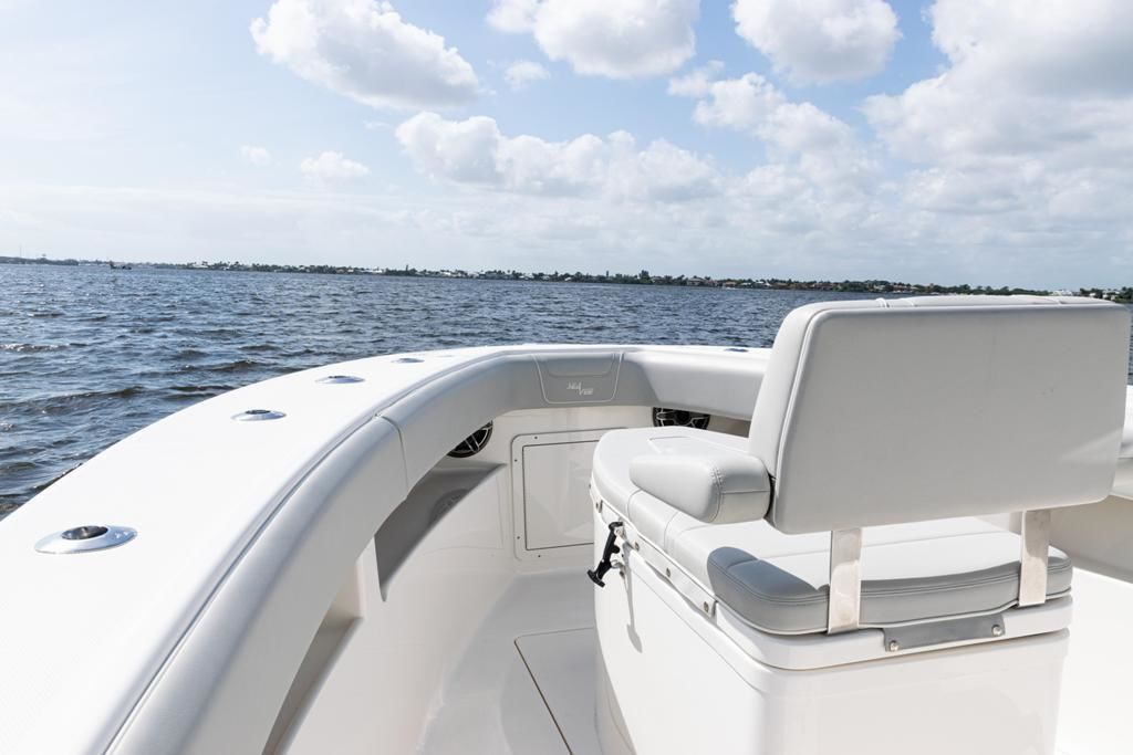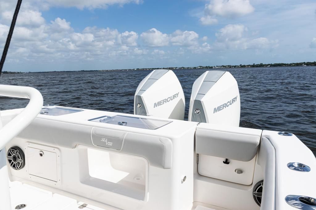 This SeaVee 290B Powered by twin Mercury 300 V8 FourStroke Verados in Warm Fusion White. This boat features a rare low-profile second station, an extensive Furuno electronics package, JL Audio sound system, and custom Gemlux outriggers.
