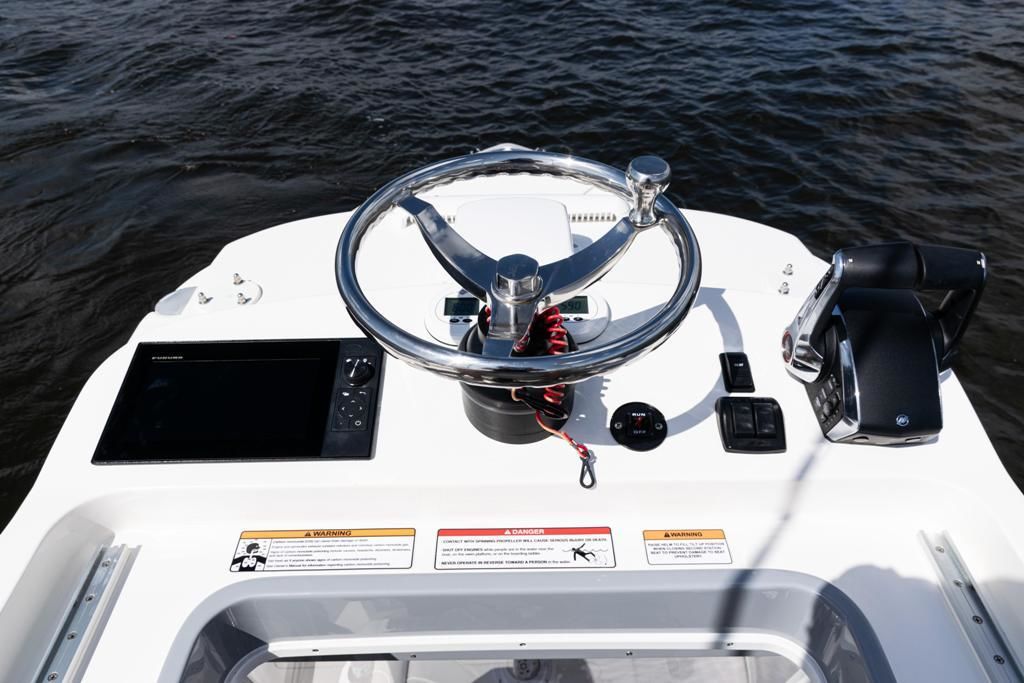 -Full Mercury throttle, steering, and gauges at second station