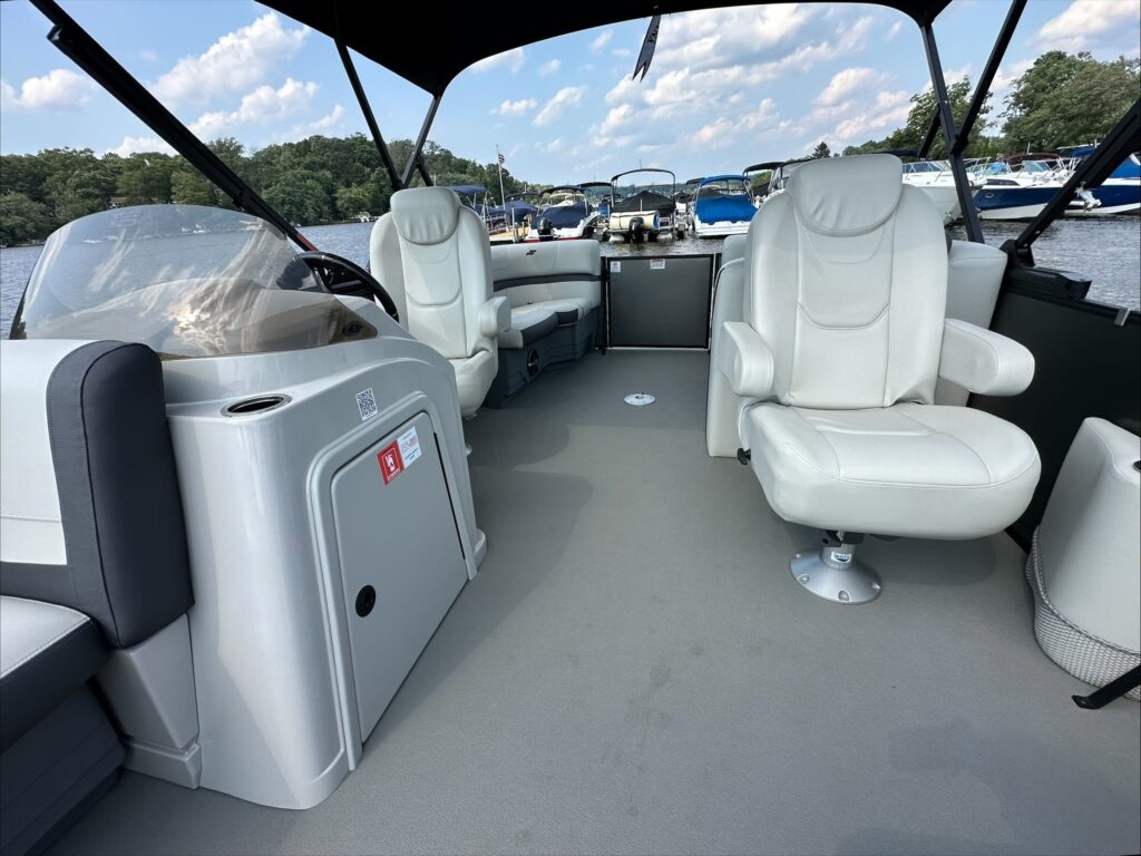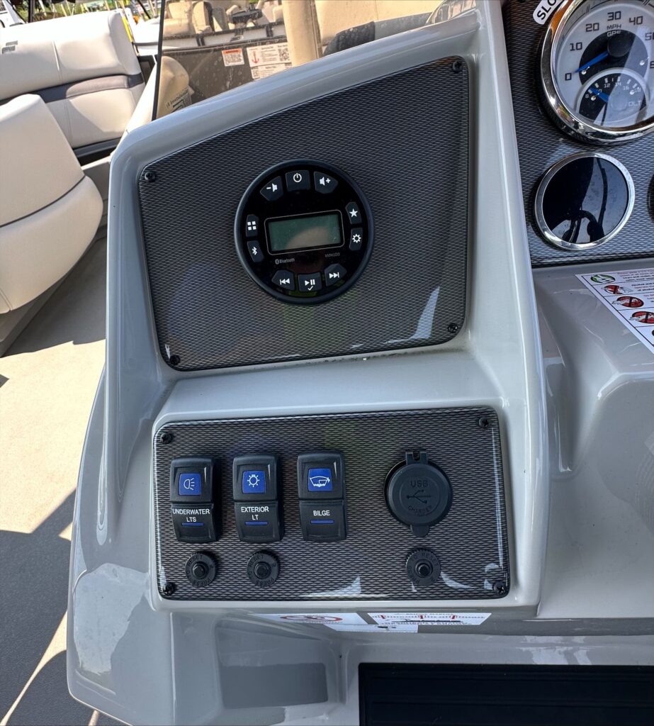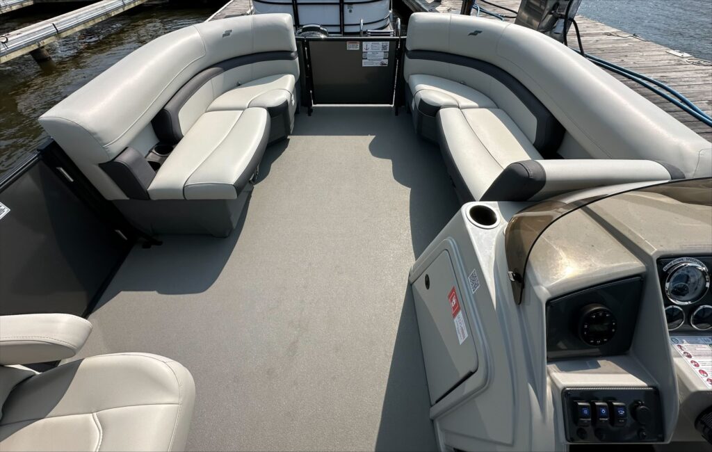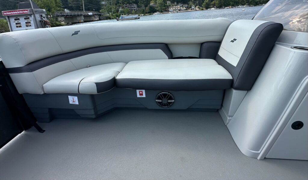 Features include, Stereo with Bluetooth, GPS, black powered bimini top and playpen cover, full vinyl flooring in gray, extended deck, pylon ski tow, and more!