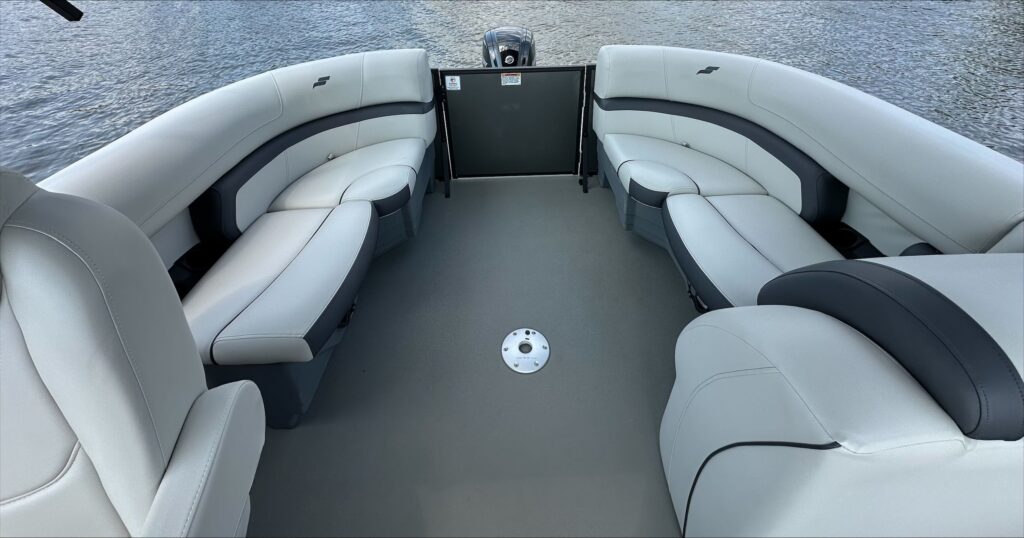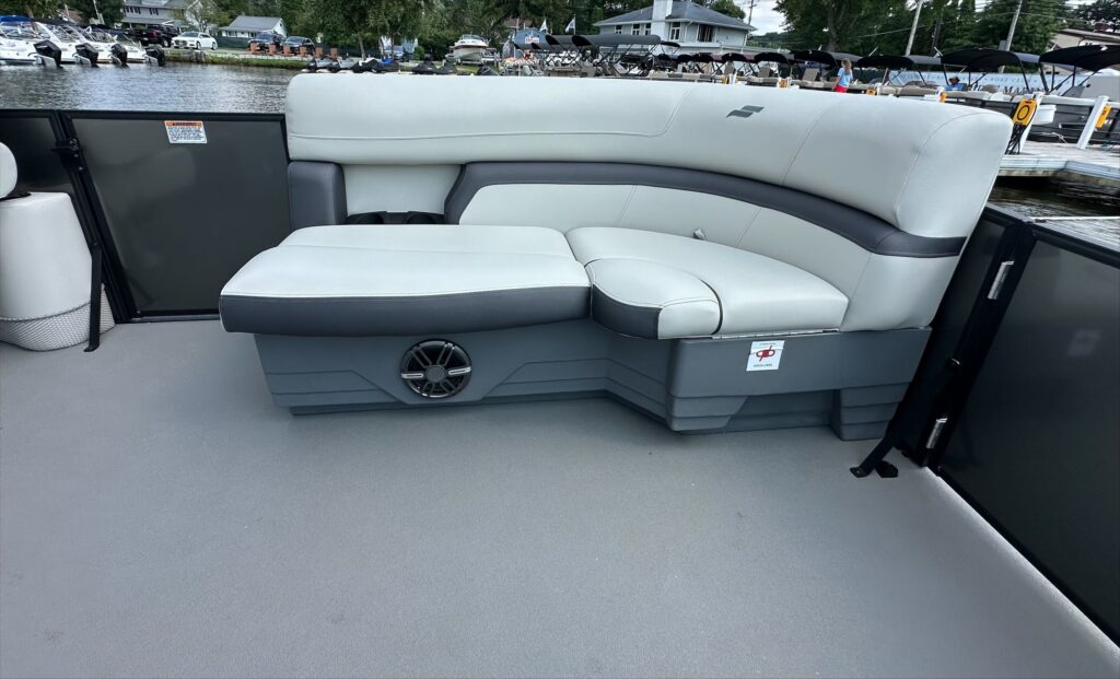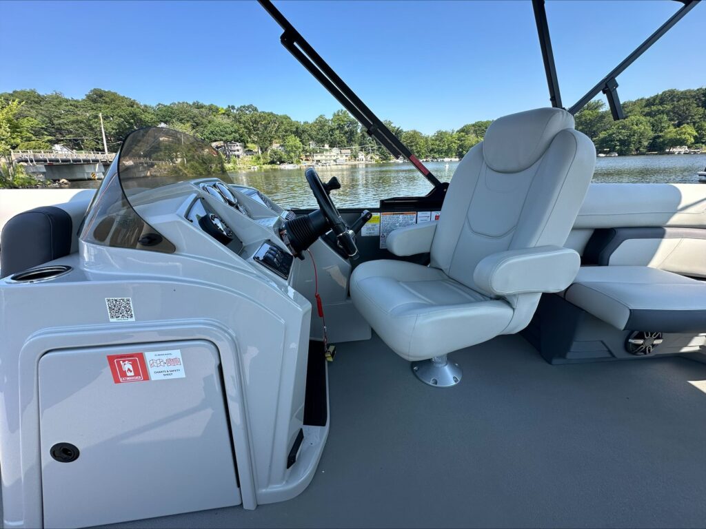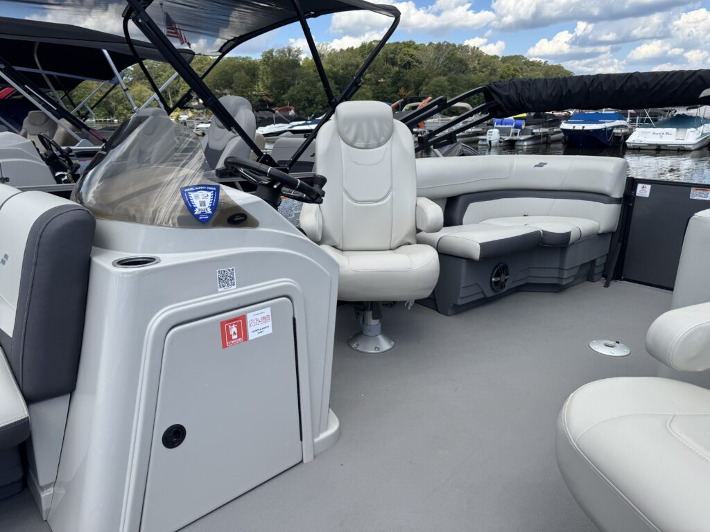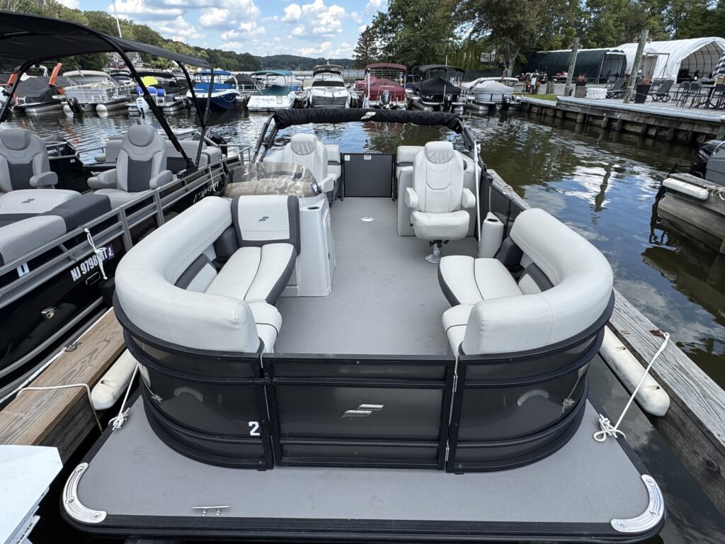 Features include, Stereo with Bluetooth, GPS, black powered bimini top and playpen cover, full vinyl flooring in gray, extended deck, pylon ski tow, and more!