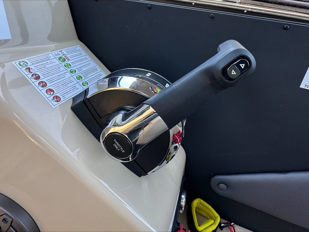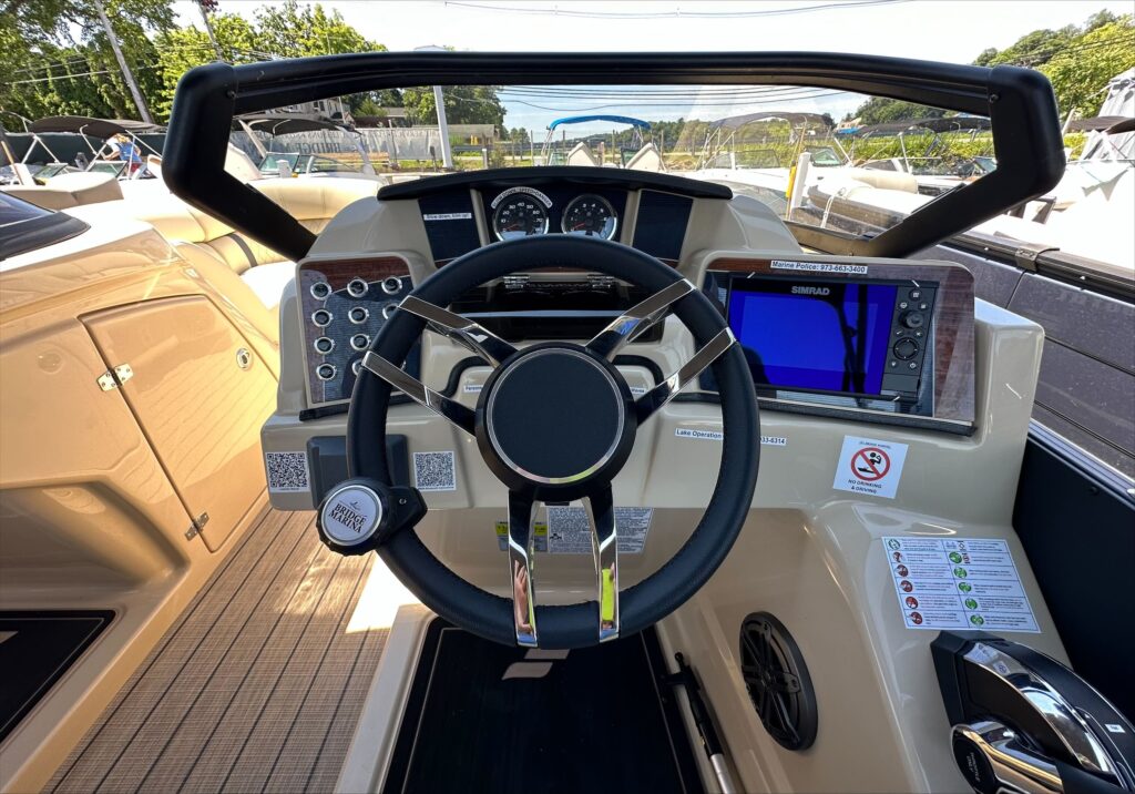 Features include black power bimini top and playpen cover, full teak weave flooring in brown, stylish black panels, changing room, extended deck, remote switch panel with backup ignition, power assist steering, dual battery with switch, lighted cupholders, Graph Simrad chart plotter and fish finder, and more!
