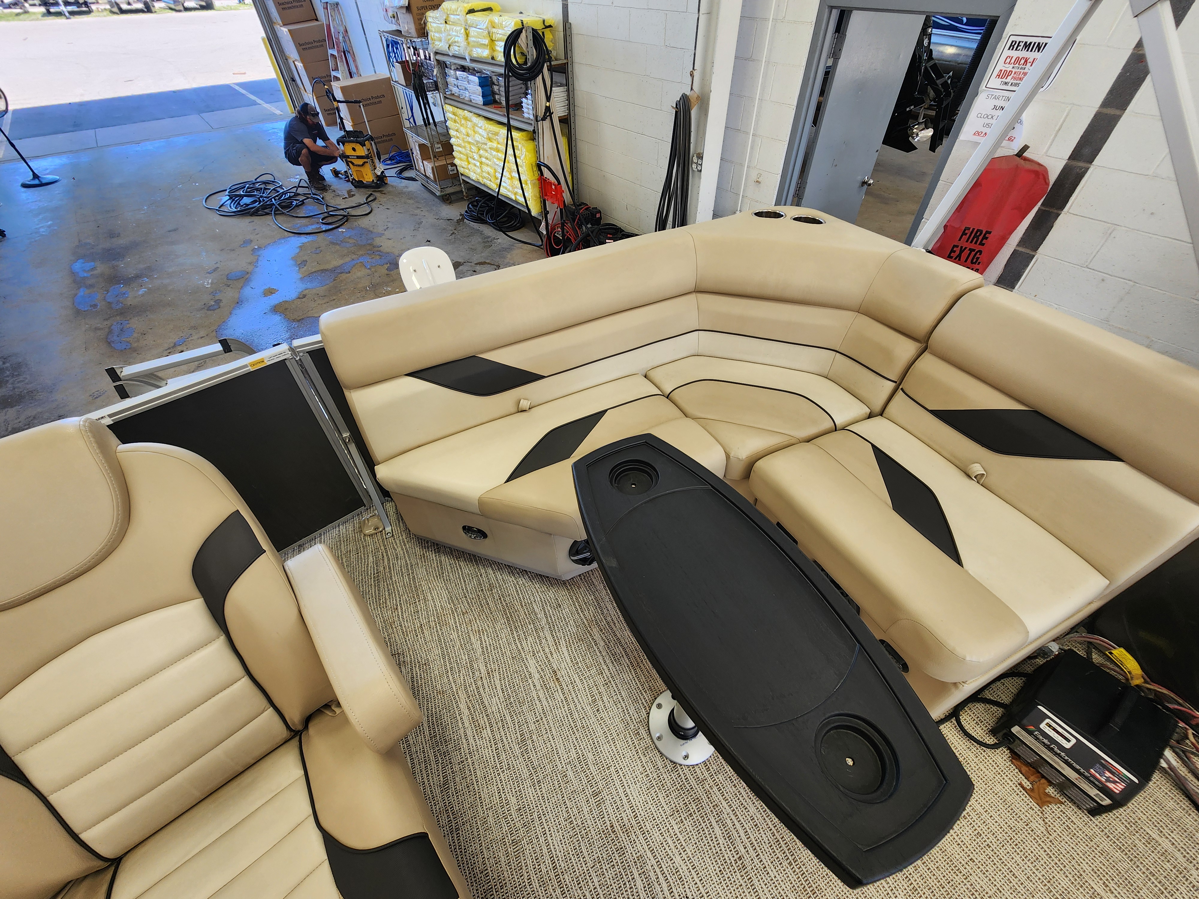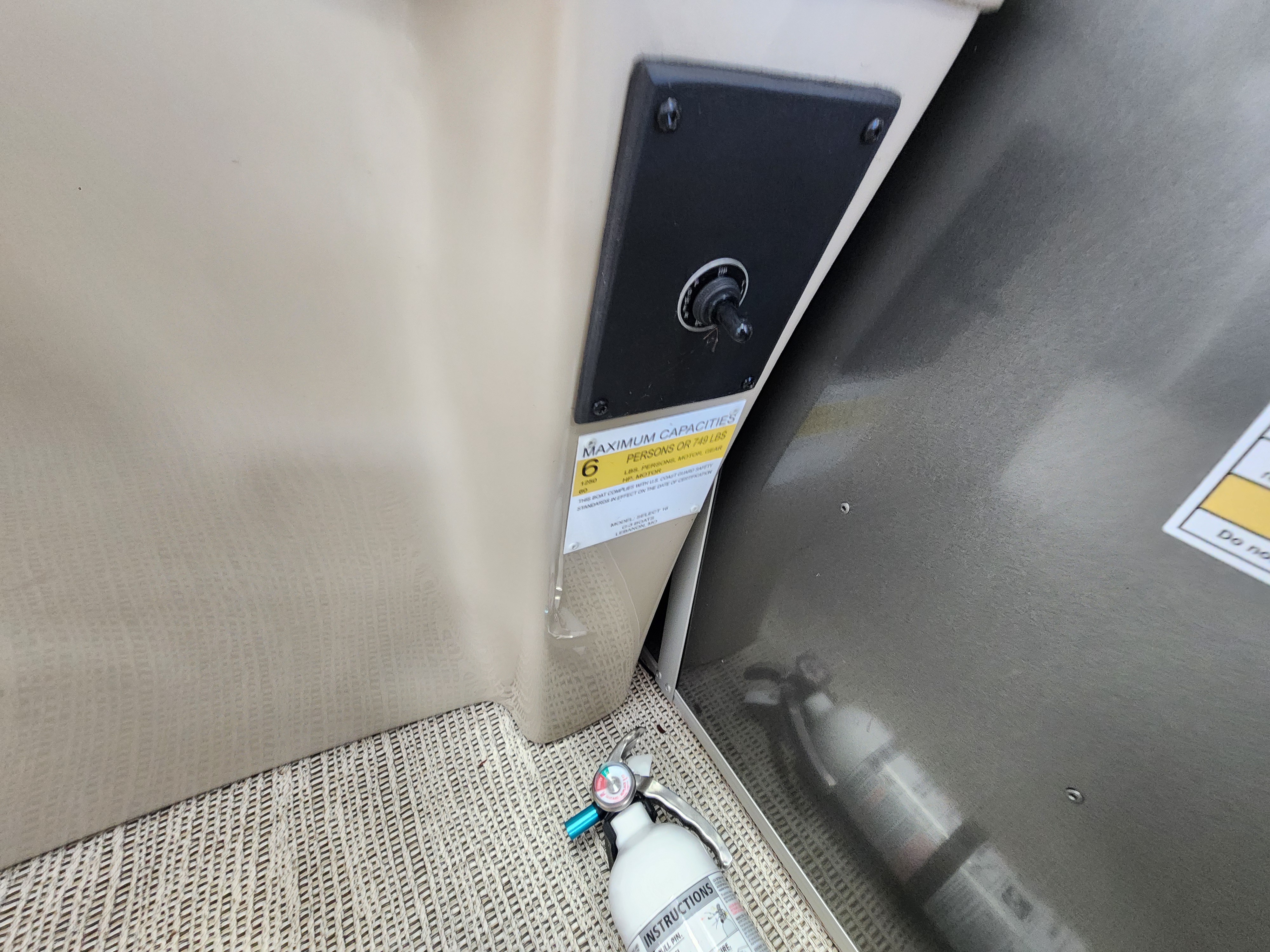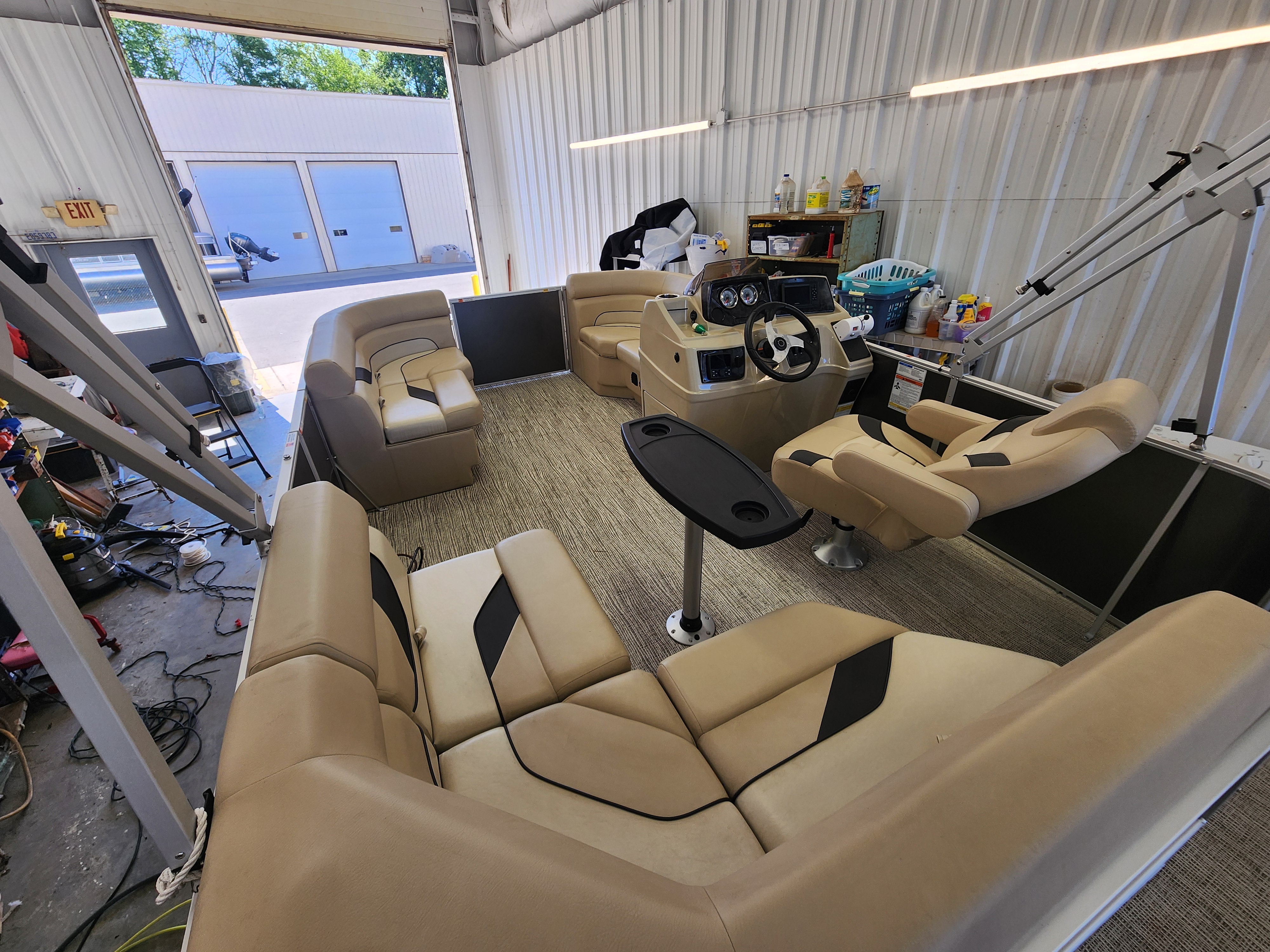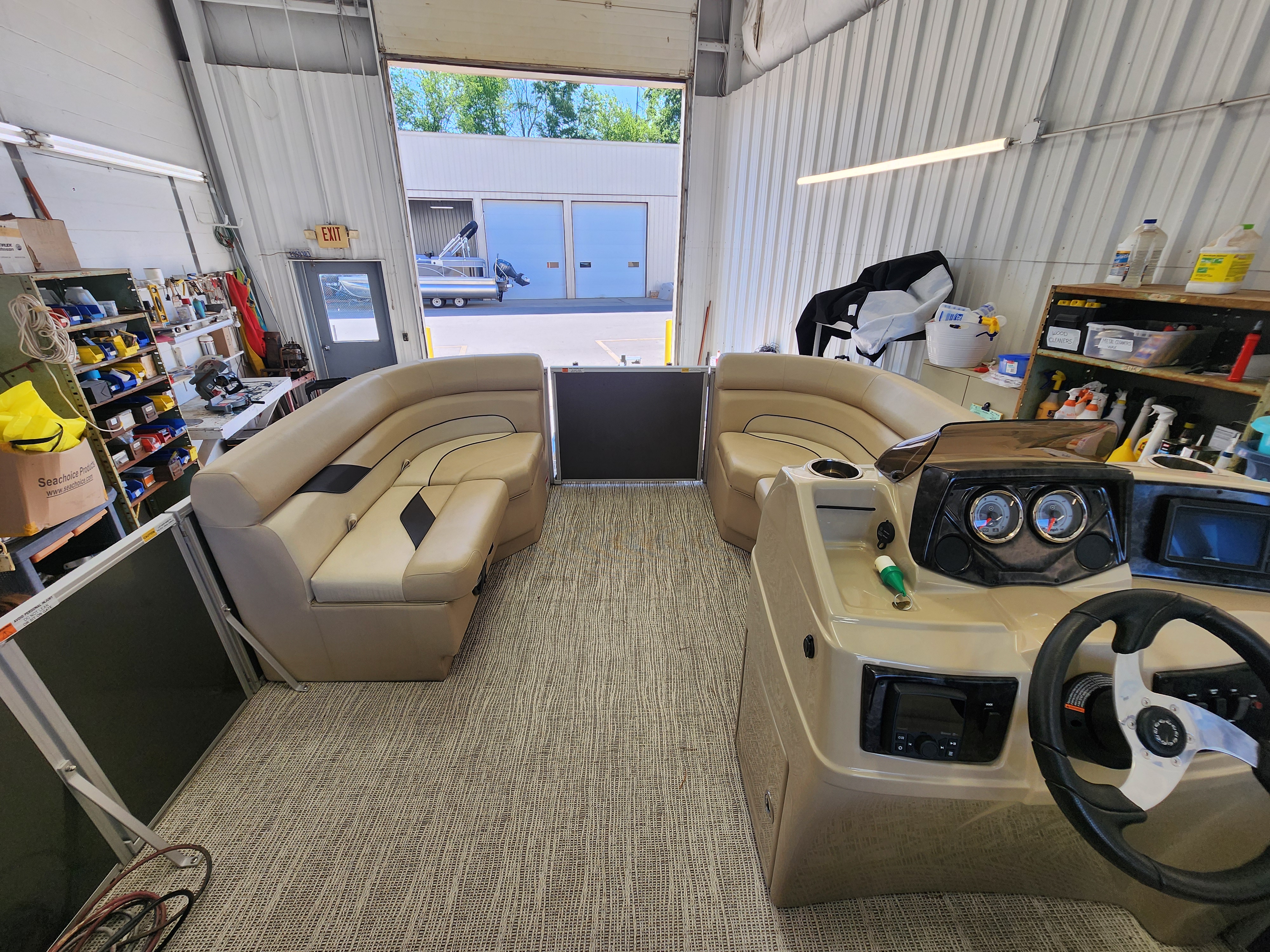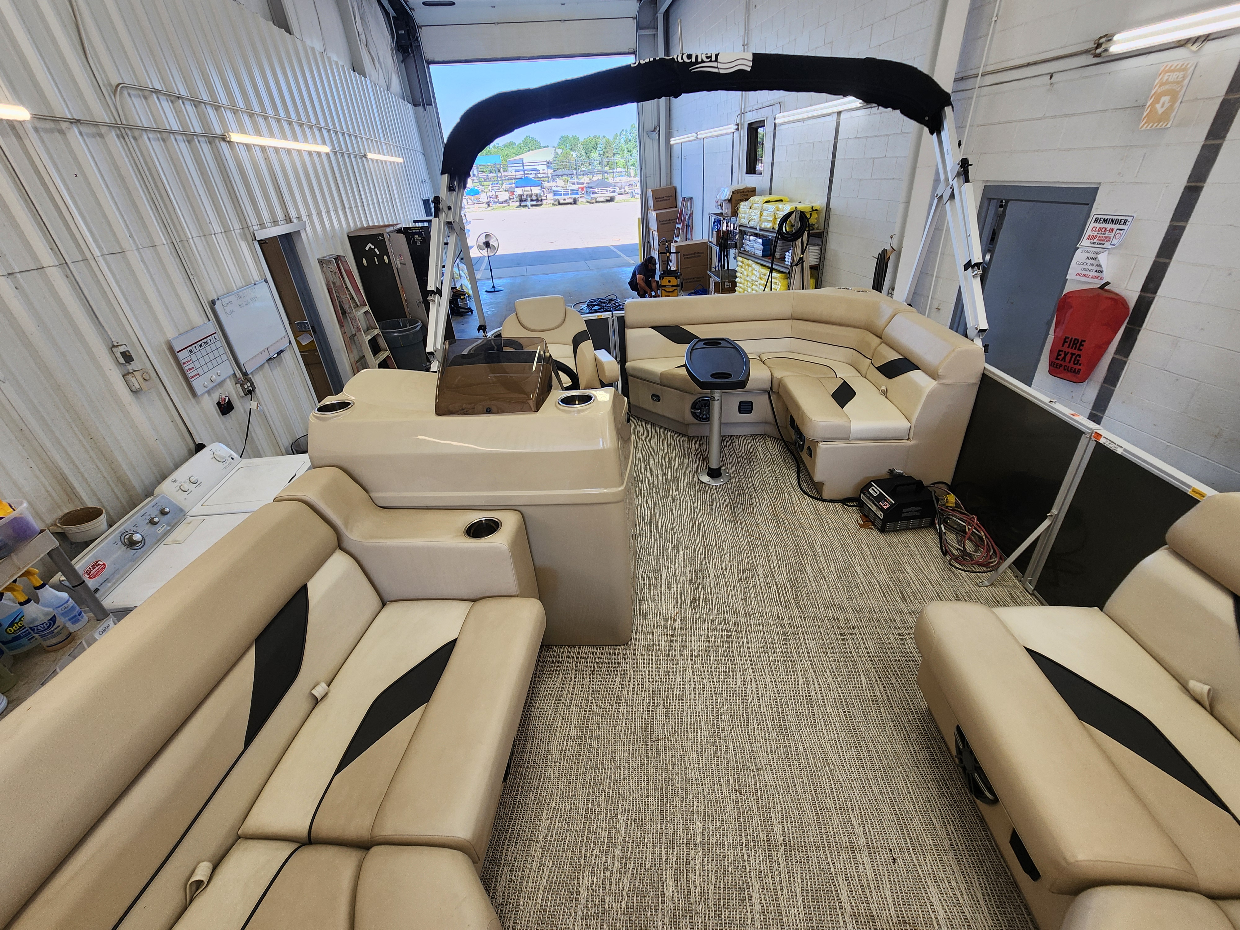 Boat comes with LED acid batteries and charger, bimini top, full boat cover, docking lights, full vinyl flooring, rear boarding ladder, table, fish finder at console, stereo with speakers and more!