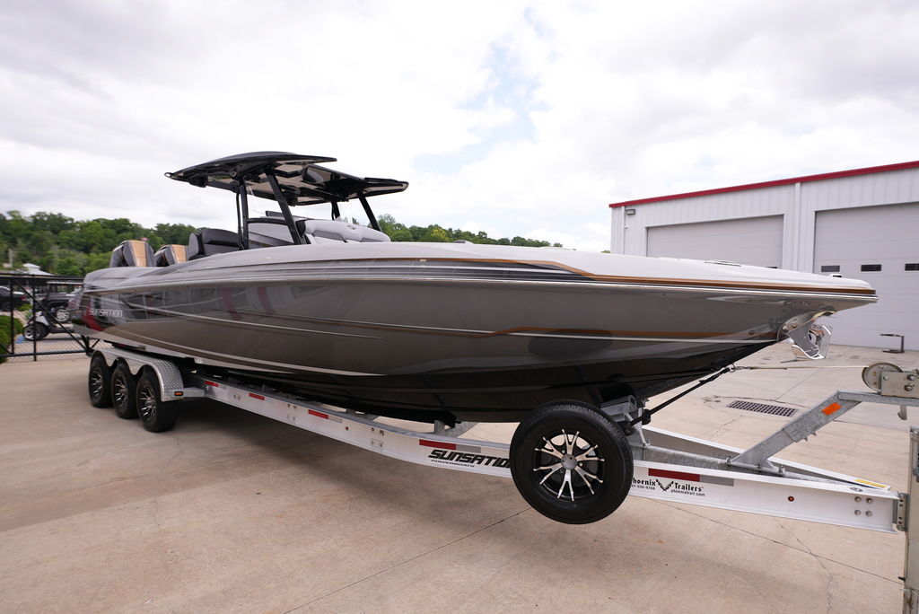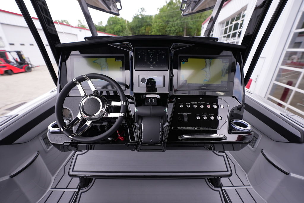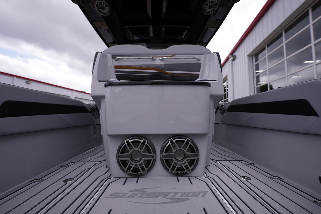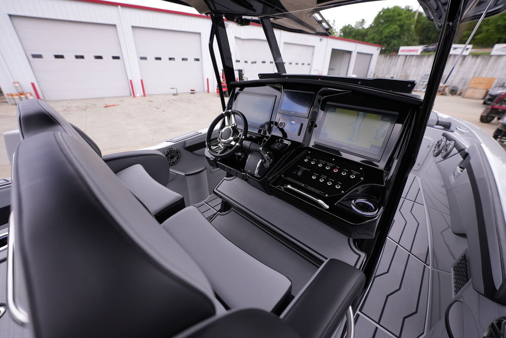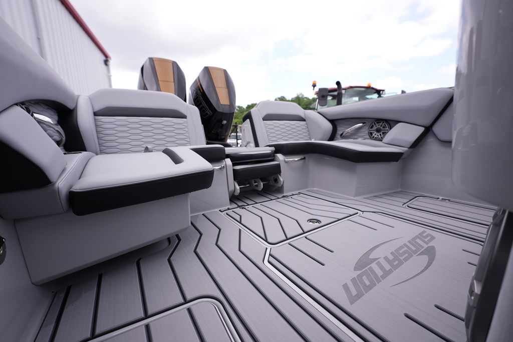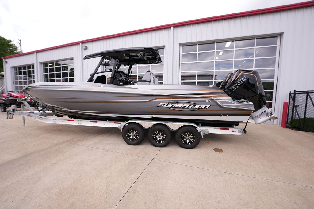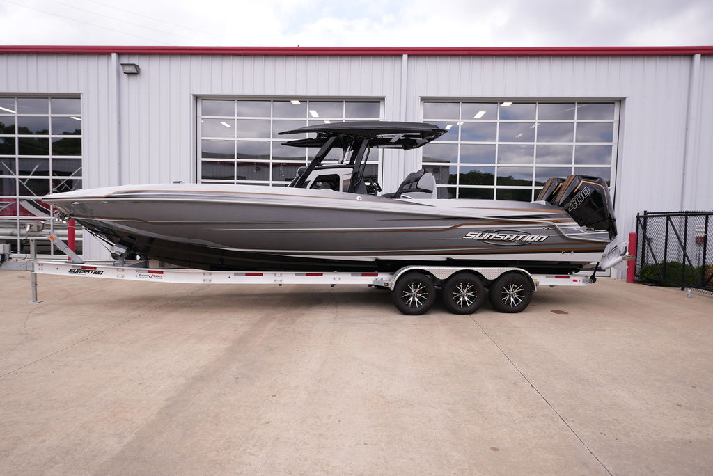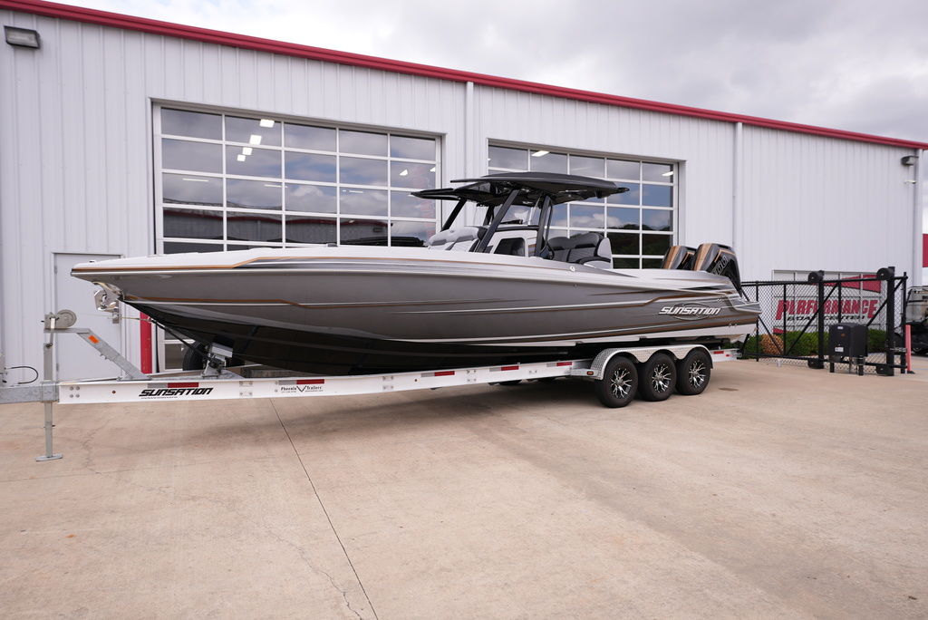2024 Sunsation 32CCX powered by twin Mercury Racing V10 400R Verado. STANDARD EQUIPMENT; Additional battery with onboard charger and electric switch on dash, dual Garmin 8616s. JL Audio stereo upgrade with remote in bow, depth sounder, LED RGB color changing cockpit lights, Sea Deck flooring, Isotta steering wheel with tilt, LED trim tab indicators, Mercury Vessel View Garmin, pump out porta potty, and windlass anchor. OPTIONAL EQUIPMENT: Stage 2 stereo upgrade. Grey gelcoat on deck and modules, black dash, black hard top, Mitcher T custom paint, canvas package; includes TTop cover, rear manual sunshade, and high pressure washdown, Stage 1 Motor paint.