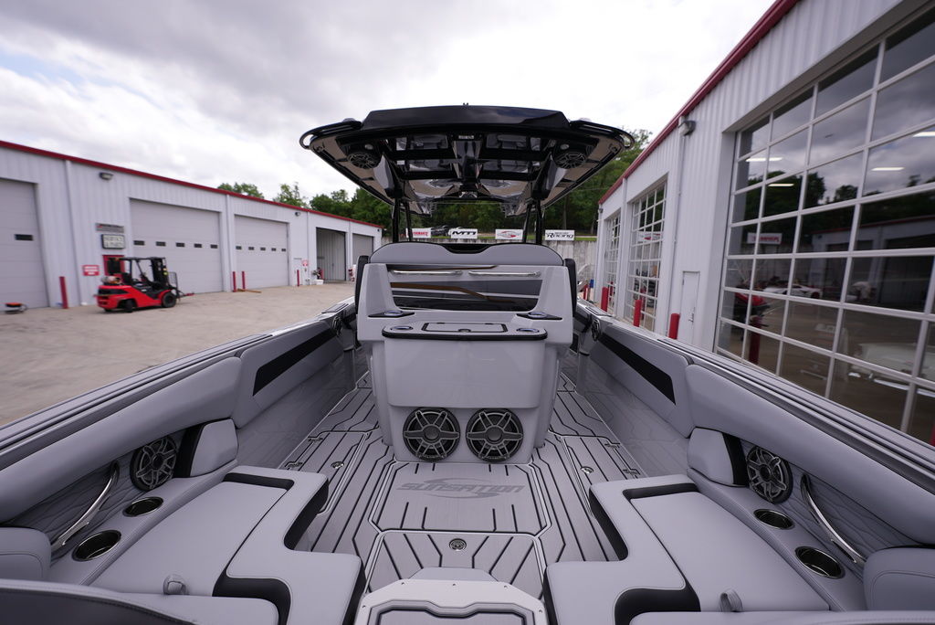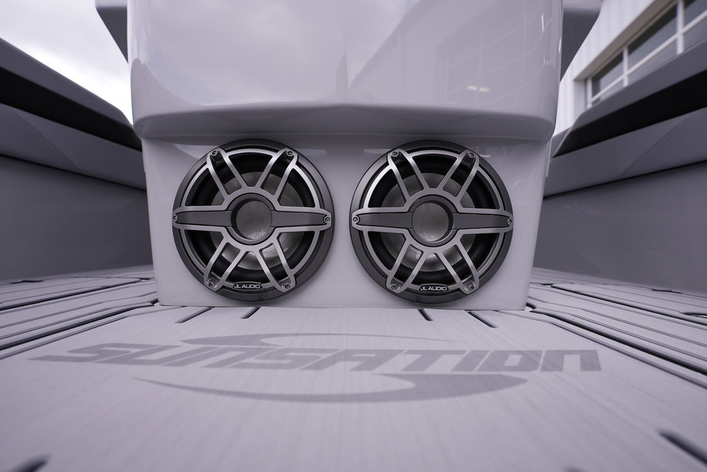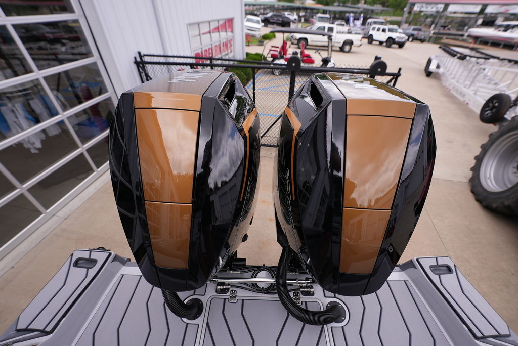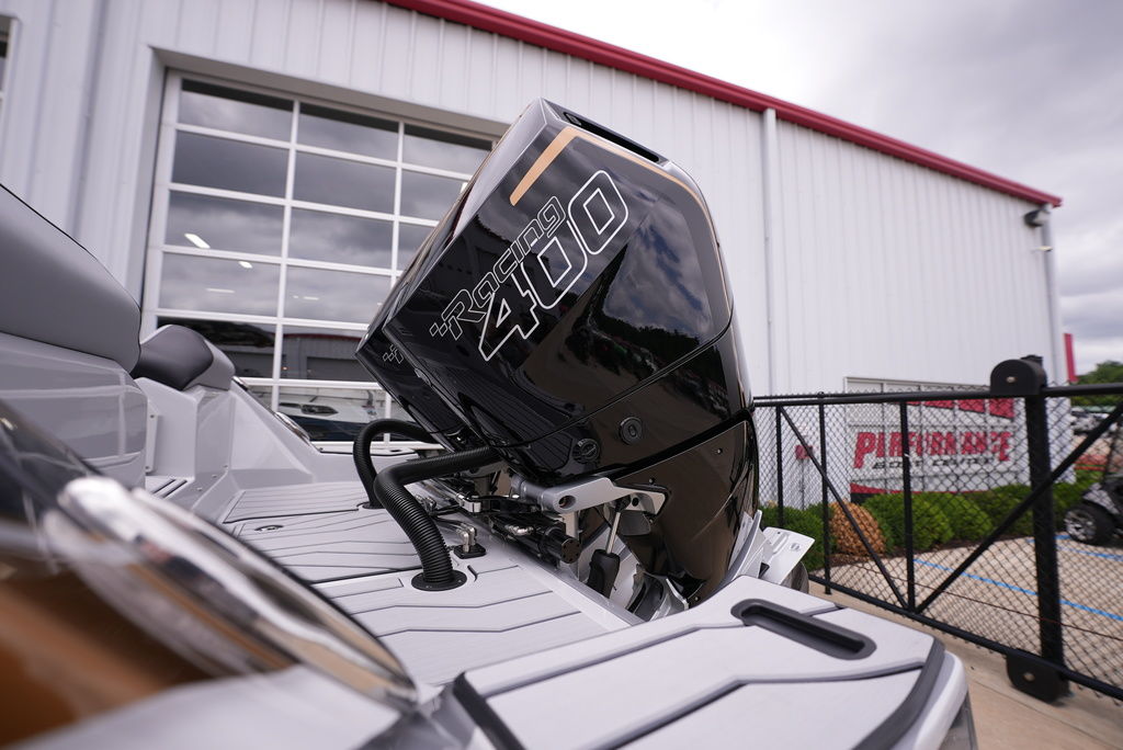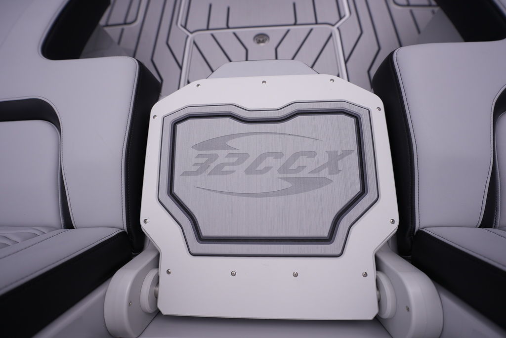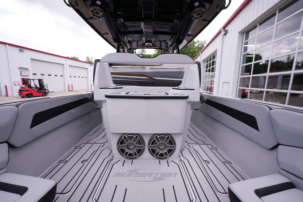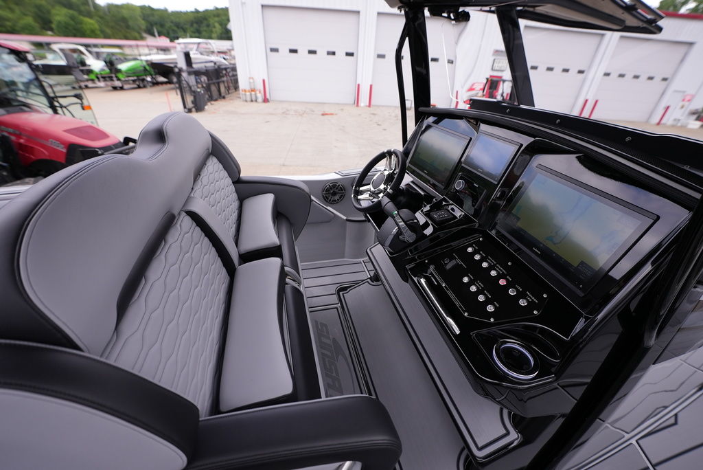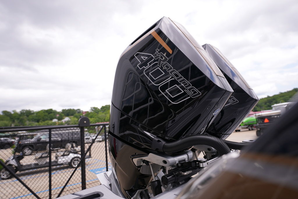2024 Sunsation 32CCX powered by twin Mercury Racing V10 400R Verado. STANDARD EQUIPMENT; Additional battery with onboard charger and electric switch on dash, dual Garmin 8616s. JL Audio stereo upgrade with remote in bow, depth sounder, LED RGB color changing cockpit lights, Sea Deck flooring, Isotta steering wheel with tilt, LED trim tab indicators, Mercury Vessel View Garmin, pump out porta potty, and windlass anchor. OPTIONAL EQUIPMENT: Stage 2 stereo upgrade. Grey gelcoat on deck and modules, black dash, black hard top, Mitcher T custom paint, canvas package; includes TTop cover, rear manual sunshade, and high pressure washdown, Stage 1 Motor paint.