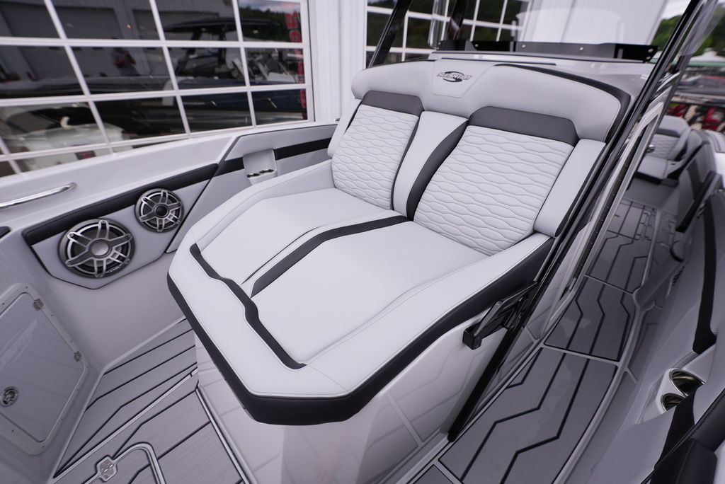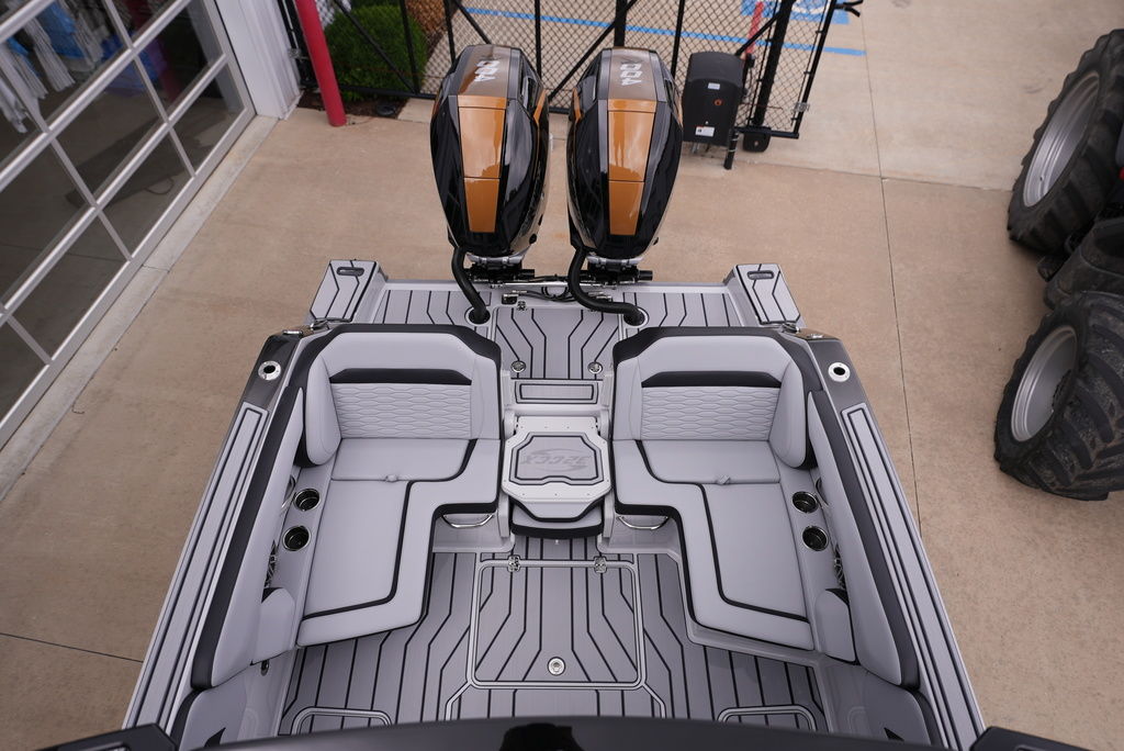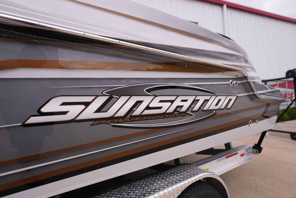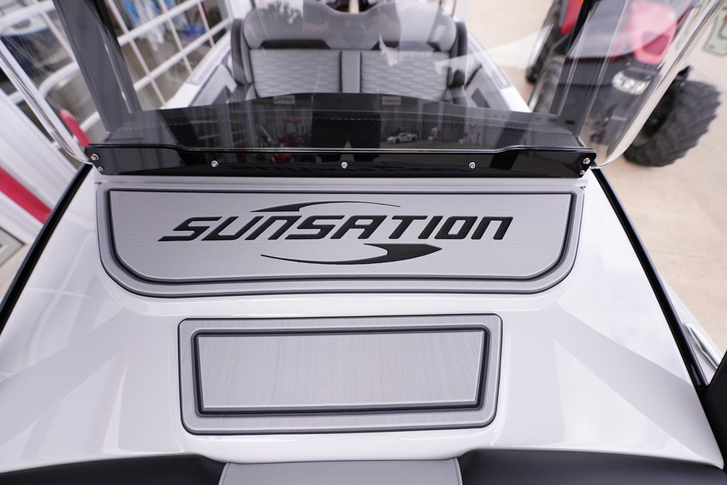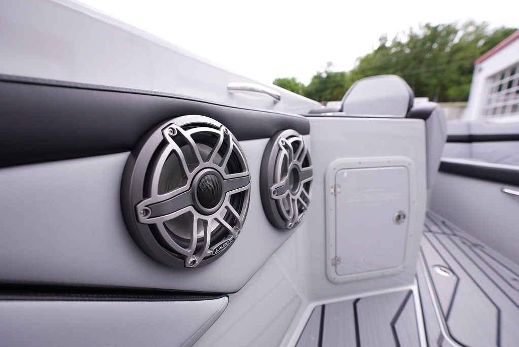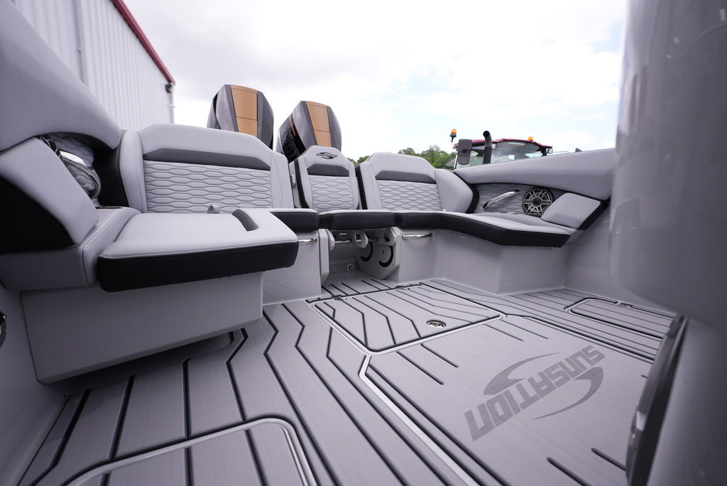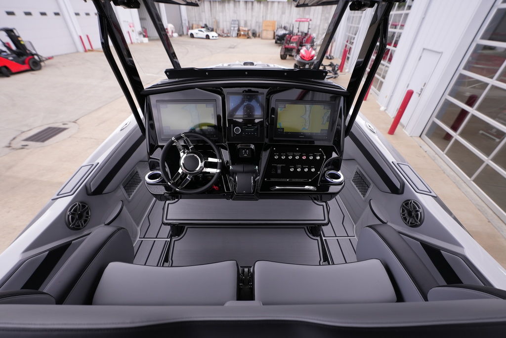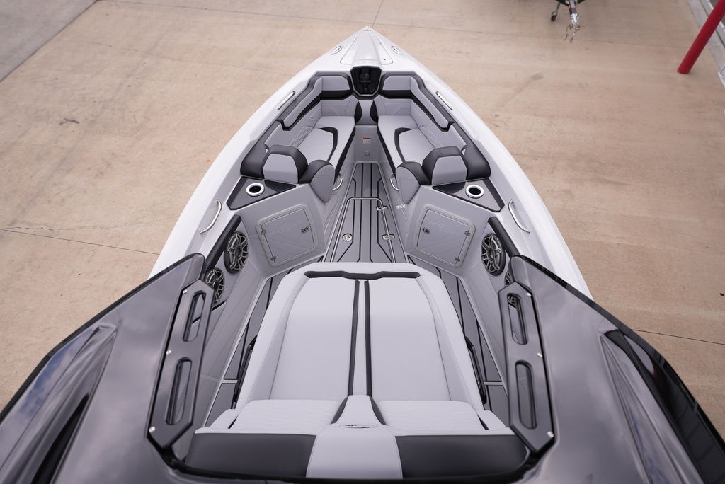 2024 Sunsation 32CCX powered by twin Mercury Racing V10 400R Verado. STANDARD EQUIPMENT; Additional battery with onboard charger and electric switch on dash, dual Garmin 8616s. JL Audio stereo upgrade with remote in bow, depth sounder, LED RGB color changing cockpit lights, Sea Deck flooring, Isotta steering wheel with tilt, LED trim tab indicators, Mercury Vessel View Garmin, pump out porta potty, and windlass anchor. OPTIONAL EQUIPMENT: Stage 2 stereo upgrade. Grey gelcoat on deck and modules, black dash, black hard top, Mitcher T custom paint, canvas package; includes TTop cover, rear manual sunshade, and high pressure washdown, Stage 1 Motor paint.