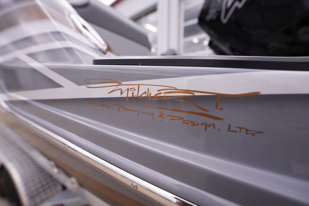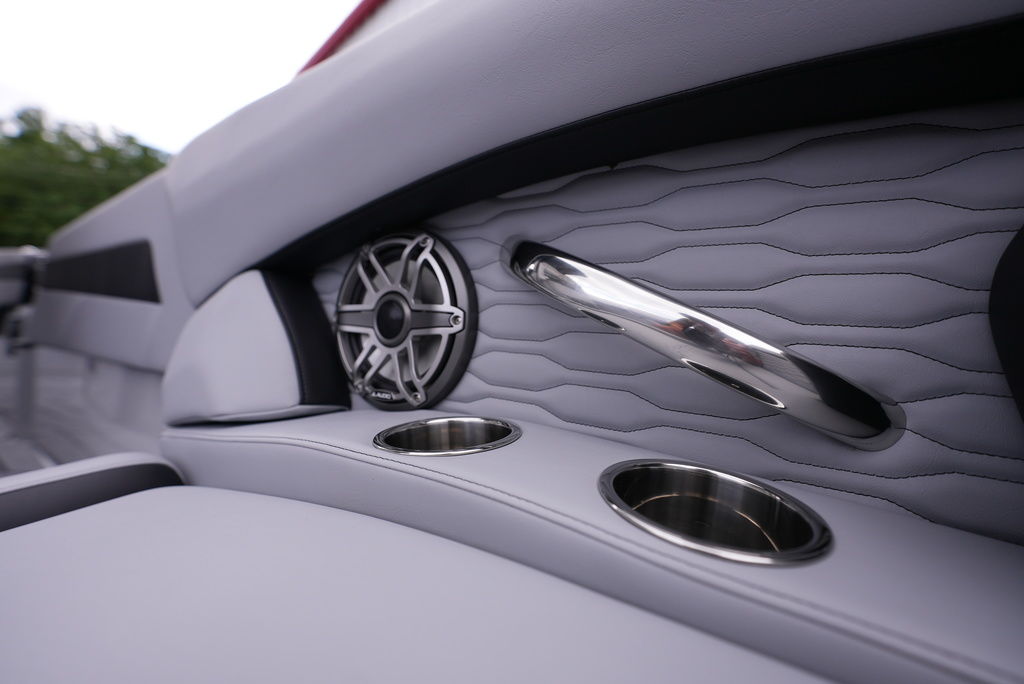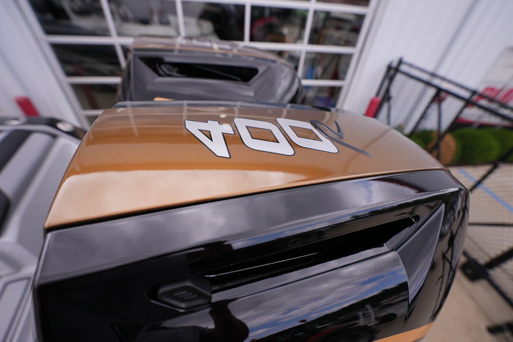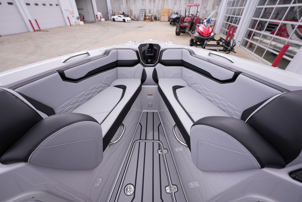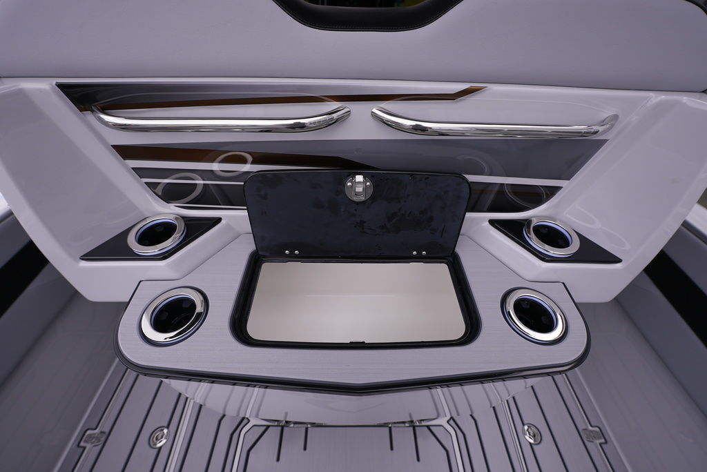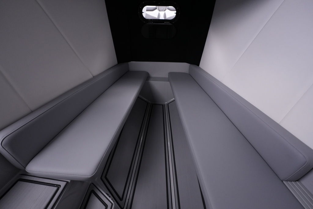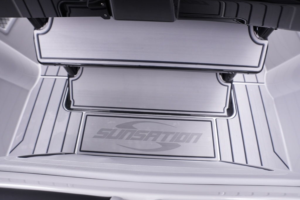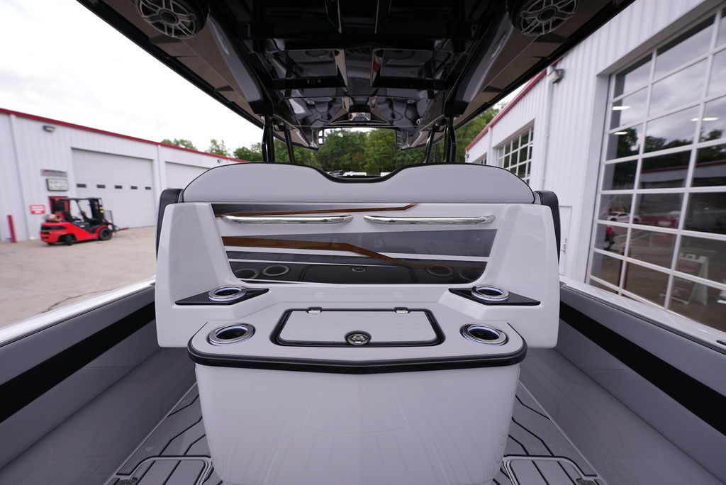 2024 Sunsation 32CCX powered by twin Mercury Racing V10 400R Verado. STANDARD EQUIPMENT; Additional battery with onboard charger and electric switch on dash, dual Garmin 8616s. JL Audio stereo upgrade with remote in bow, depth sounder, LED RGB color changing cockpit lights, Sea Deck flooring, Isotta steering wheel with tilt, LED trim tab indicators, Mercury Vessel View Garmin, pump out porta potty, and windlass anchor. OPTIONAL EQUIPMENT: Stage 2 stereo upgrade. Grey gelcoat on deck and modules, black dash, black hard top, Mitcher T custom paint, canvas package; includes TTop cover, rear manual sunshade, and high pressure washdown, Stage 1 Motor paint.