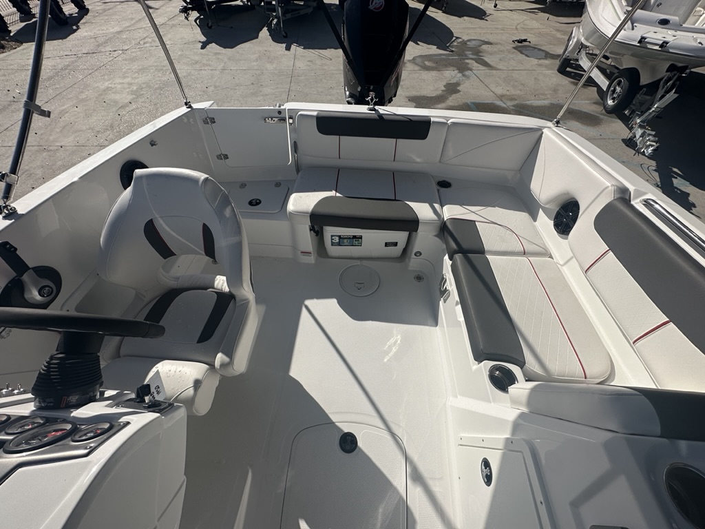 Let your crew spread out on the ample lounges and benches, conveniently stowing all manner of gear throughout. At the helm you’ll find simple, reliable switching and gauges that keep you in the know at all times. A 36-qt. portable chest cooler keep things icy cold but when it’s time to fire it up, stout outboard power is a shove of the throttle away.