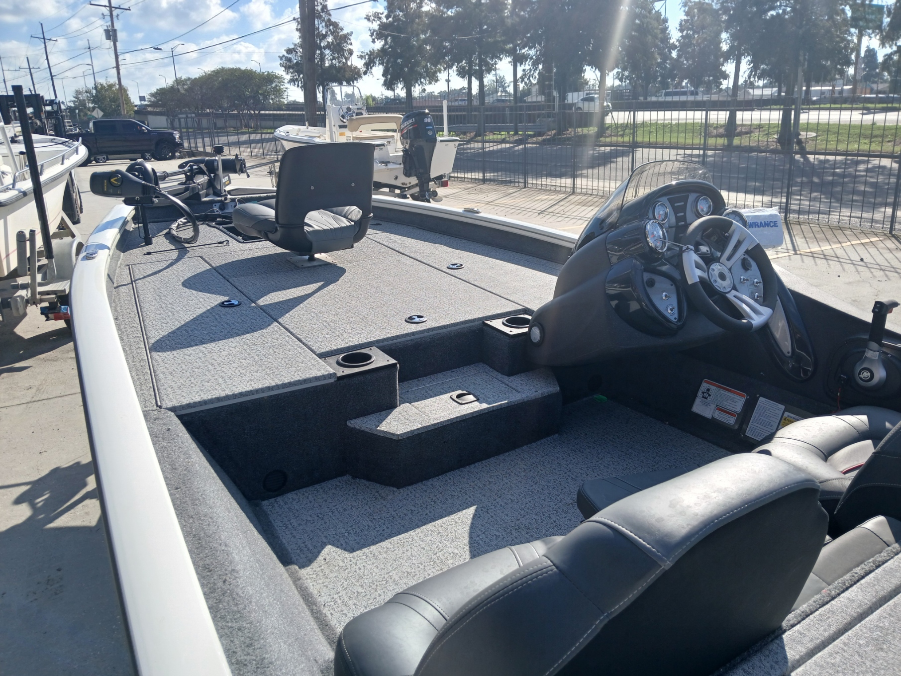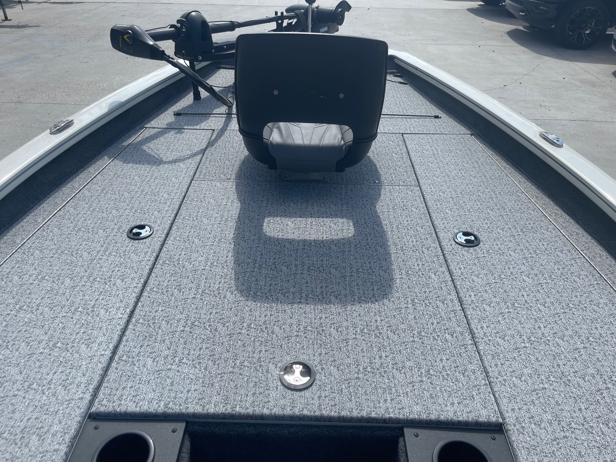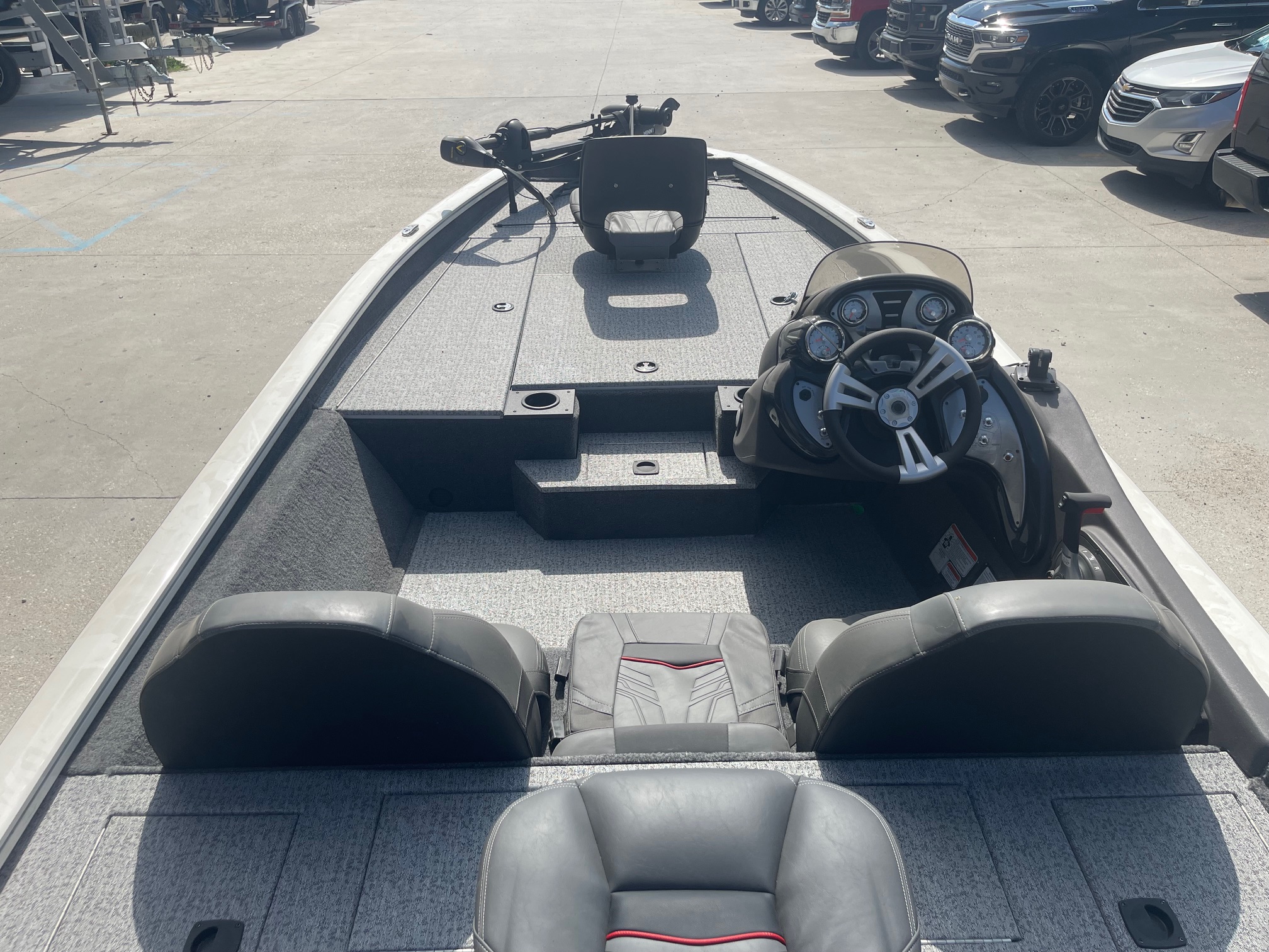 Inside, you’ll find a spacious, carpeted casting deck, ample rod and gear storage, an aerated livewell, and Lowrance electronics at the console to keep you on the fish. Add in the Minn Kota trolling motor and custom Tracker trailer, and you’ve got a complete, ready-to-roll fishing setup.
