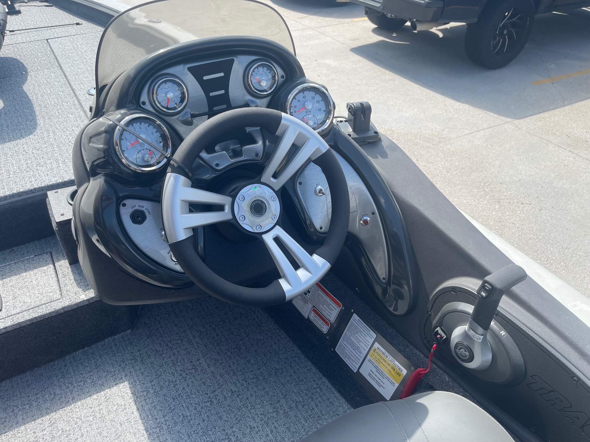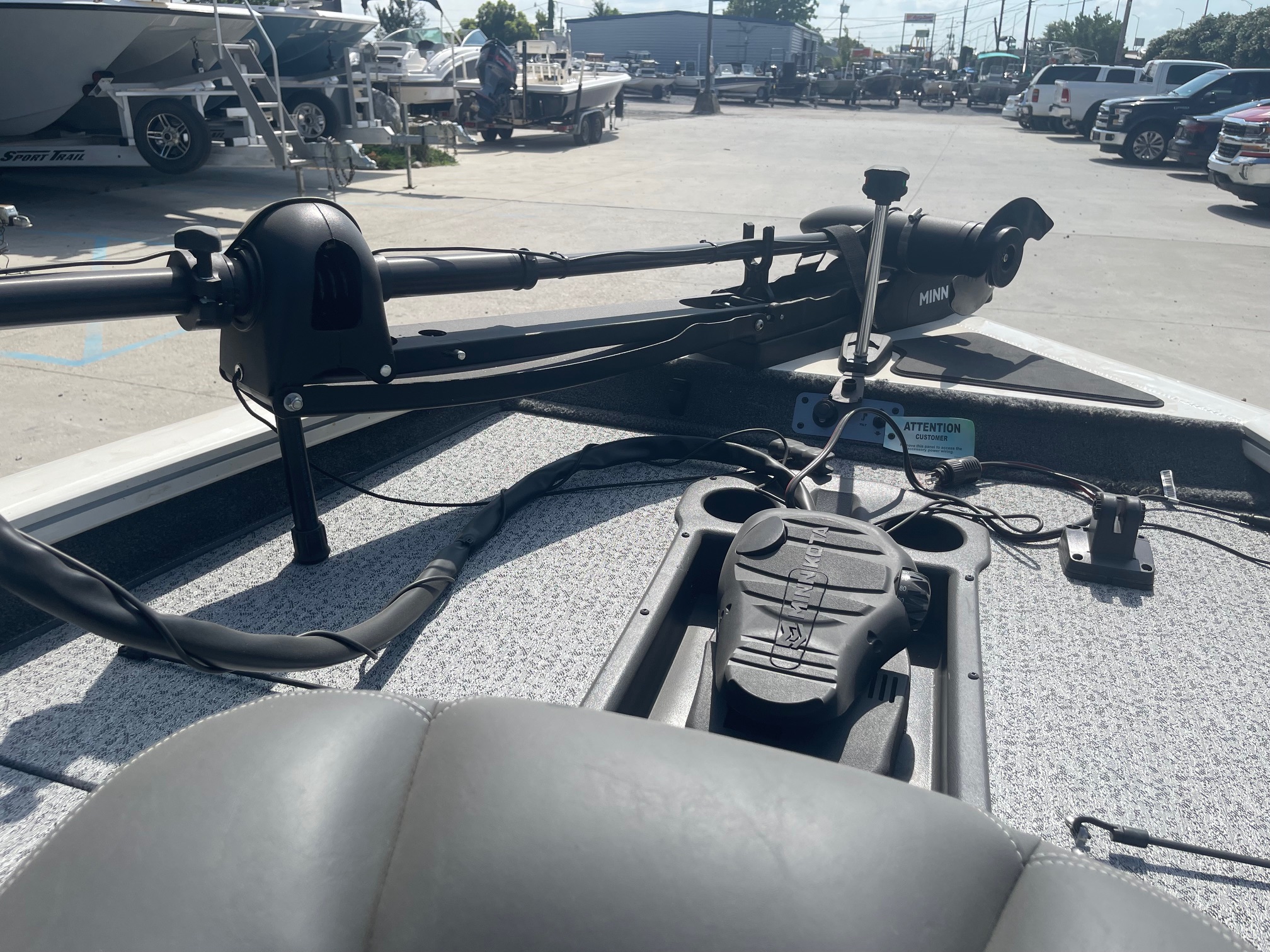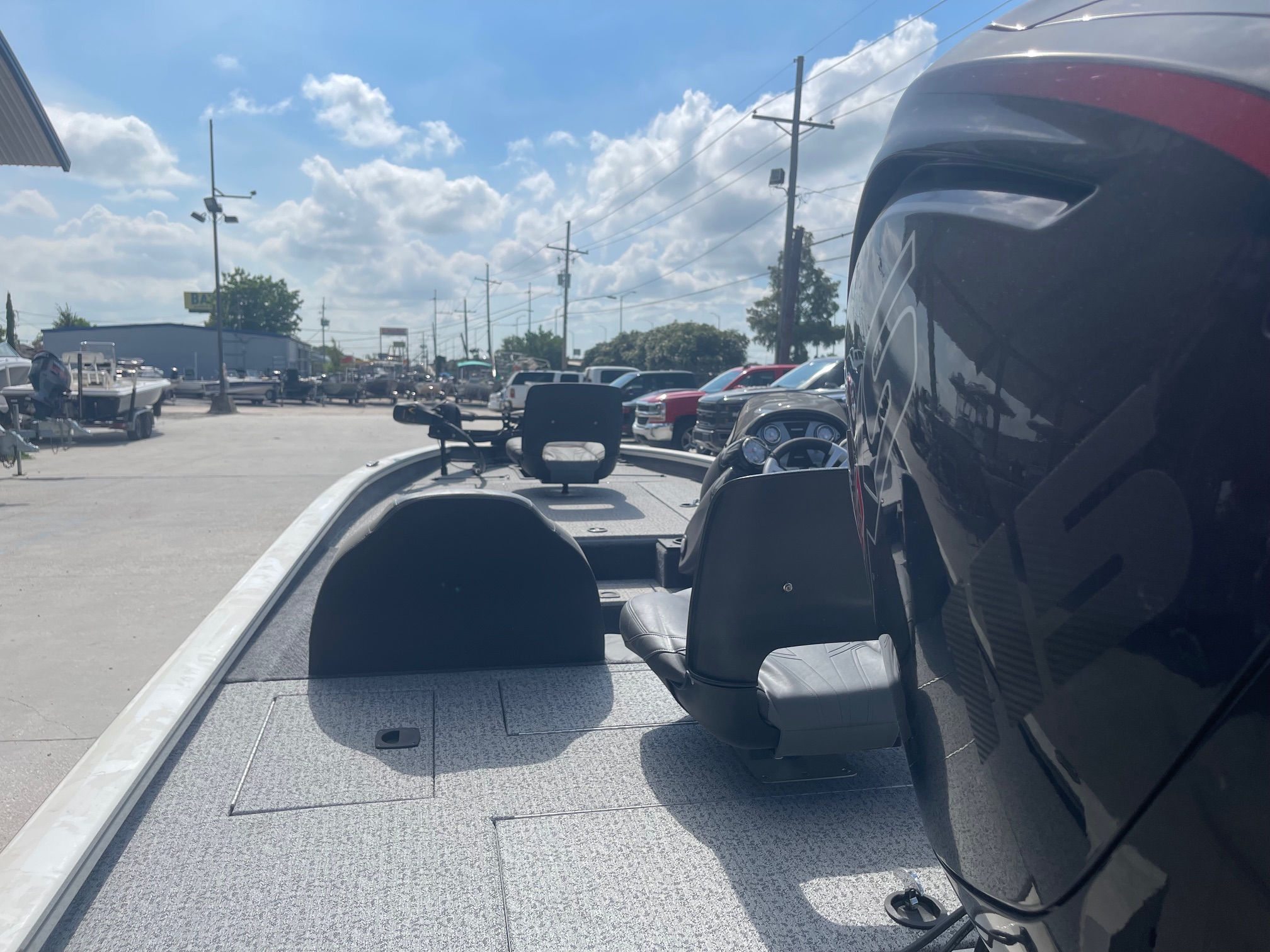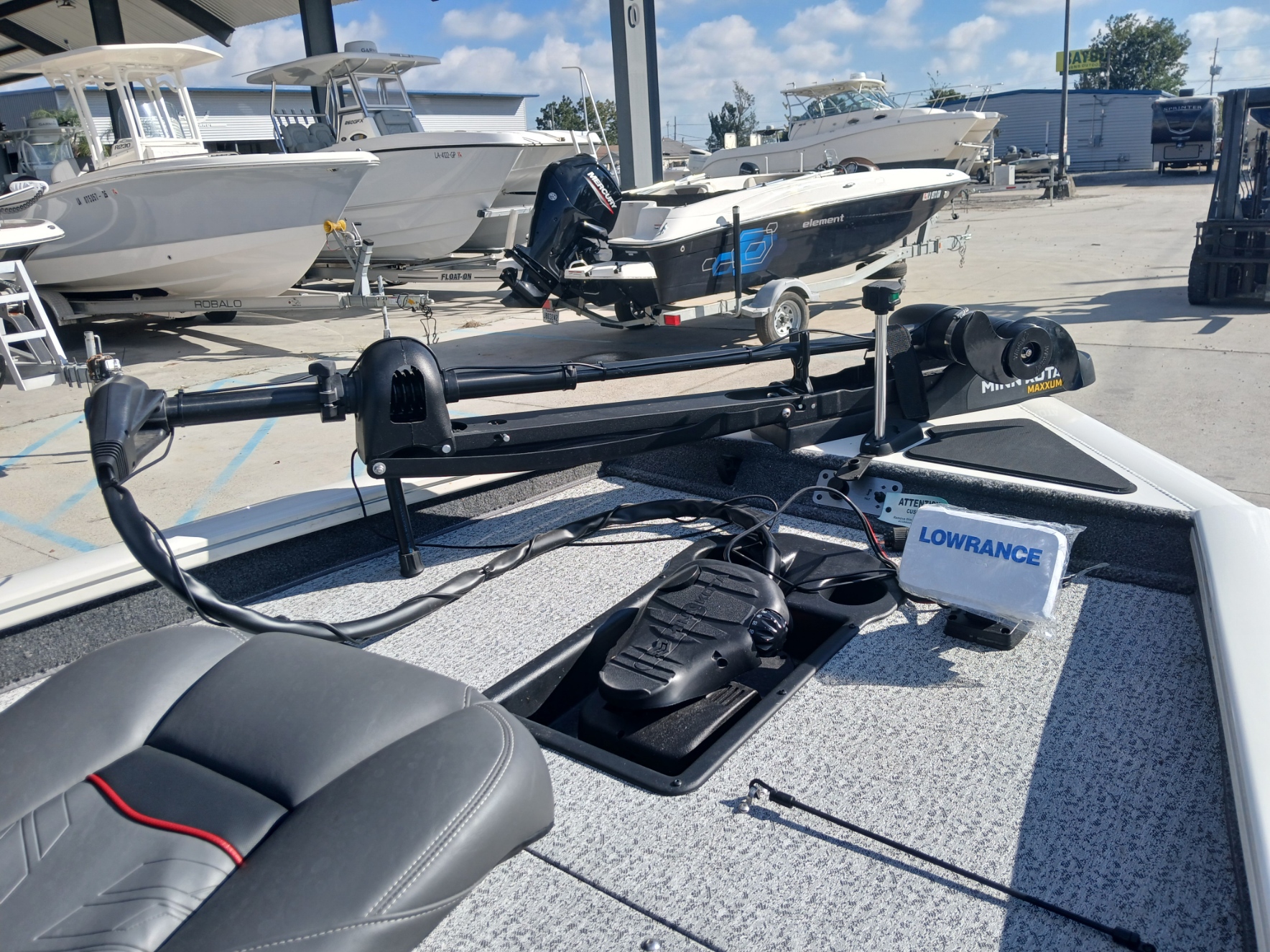 Inside, you’ll find a spacious, carpeted casting deck, ample rod and gear storage, an aerated livewell, and Lowrance electronics at the console to keep you on the fish. Add in the Minn Kota trolling motor and custom Tracker trailer, and you’ve got a complete, ready-to-roll fishing setup.