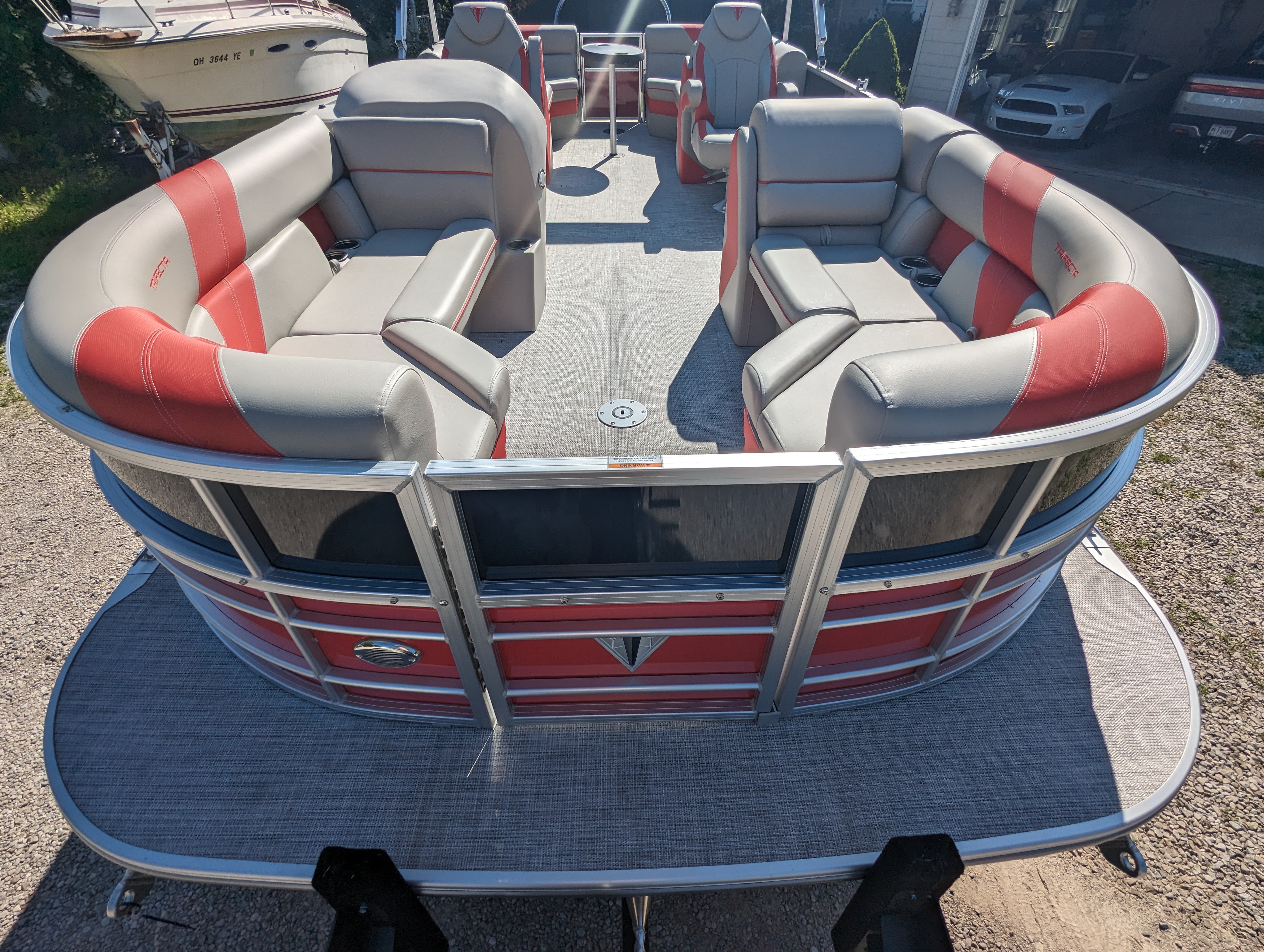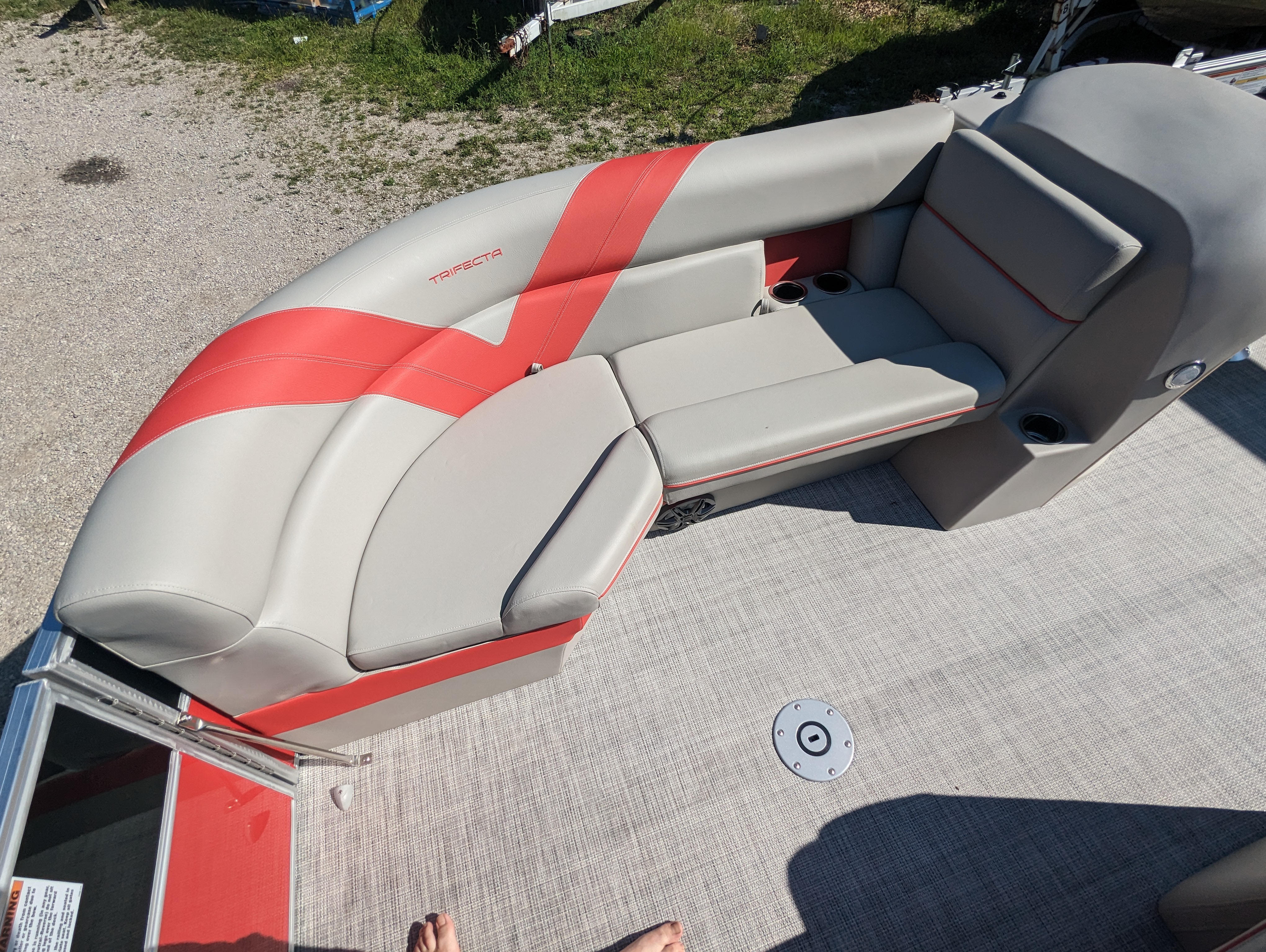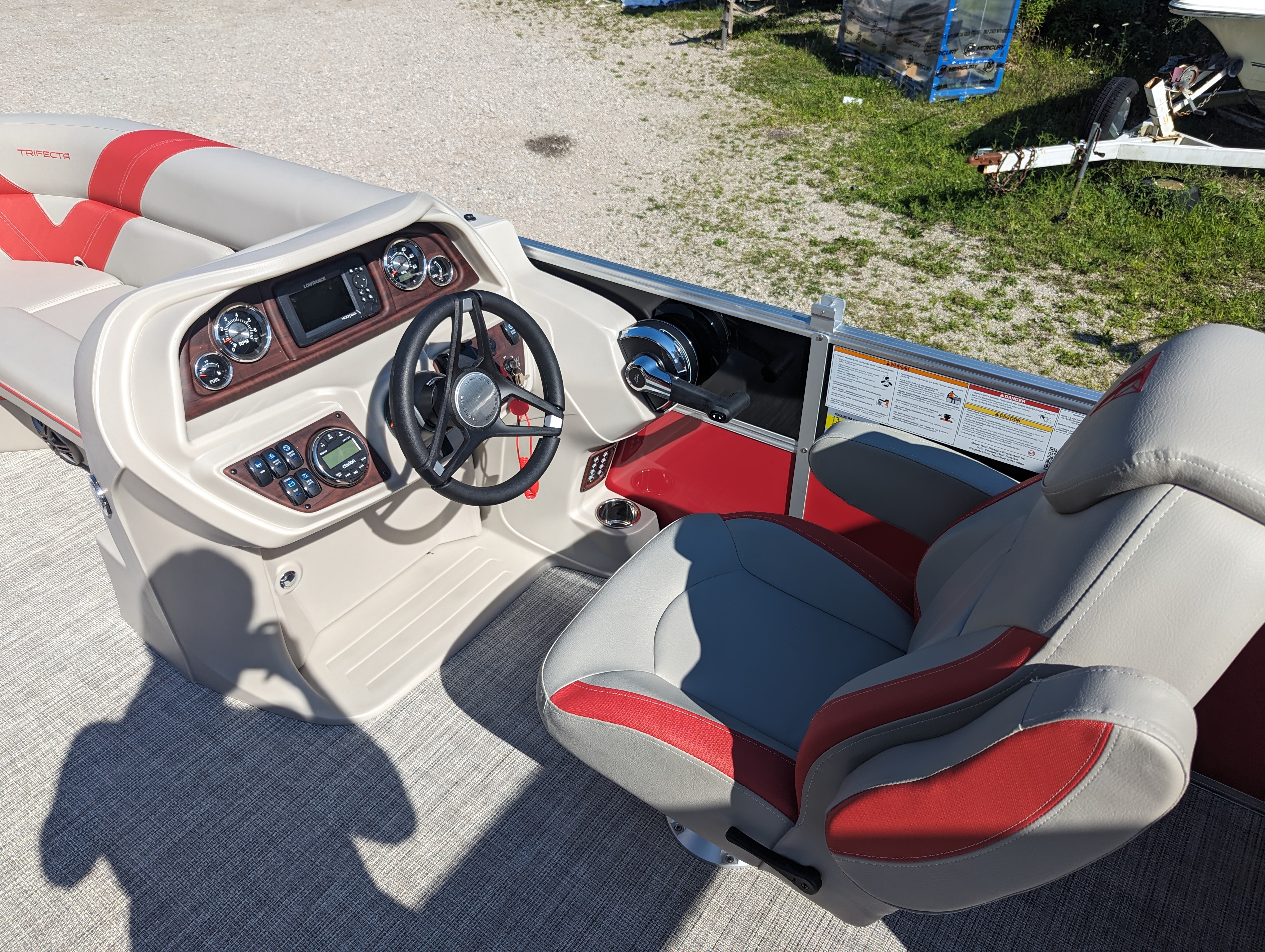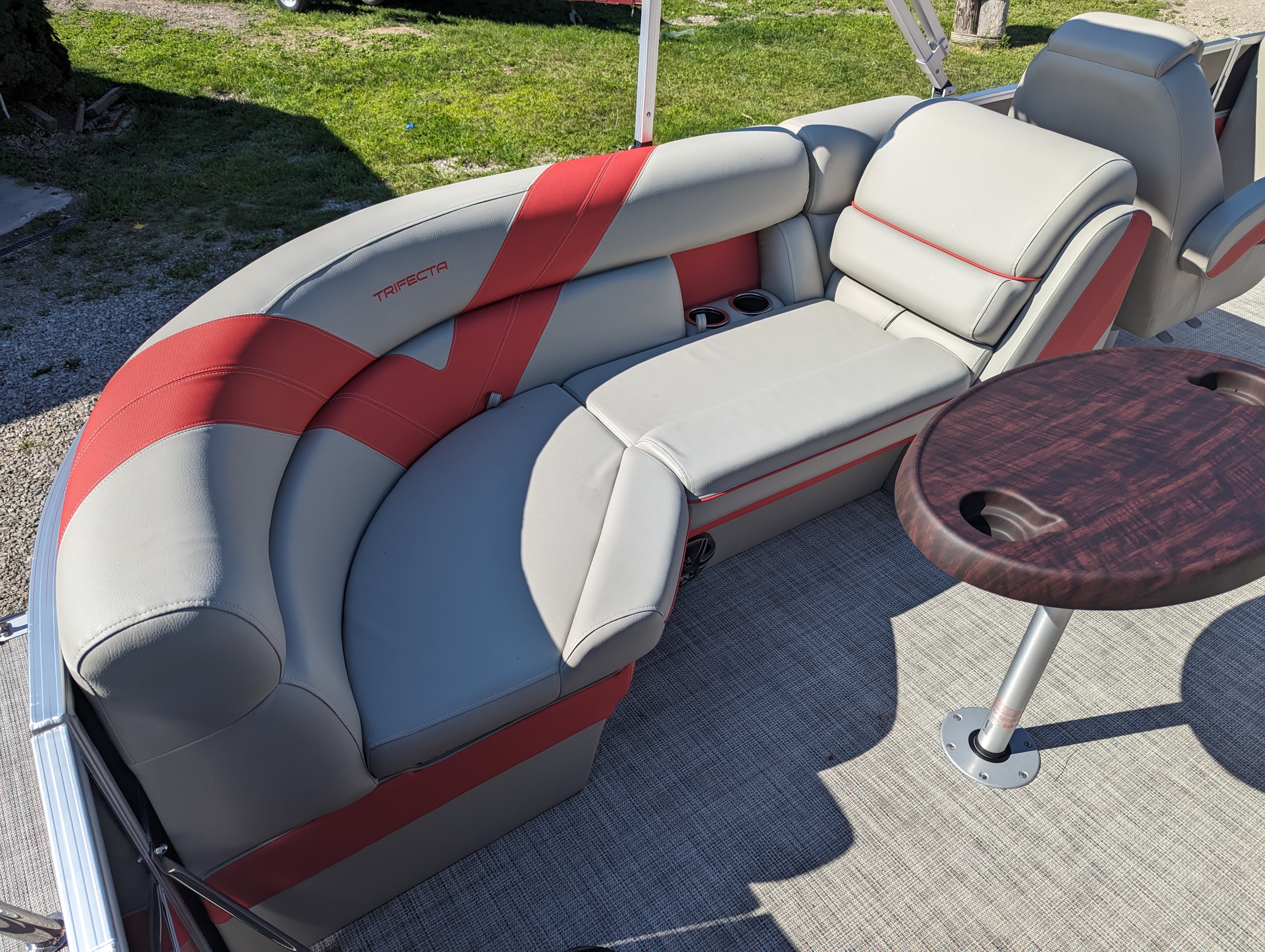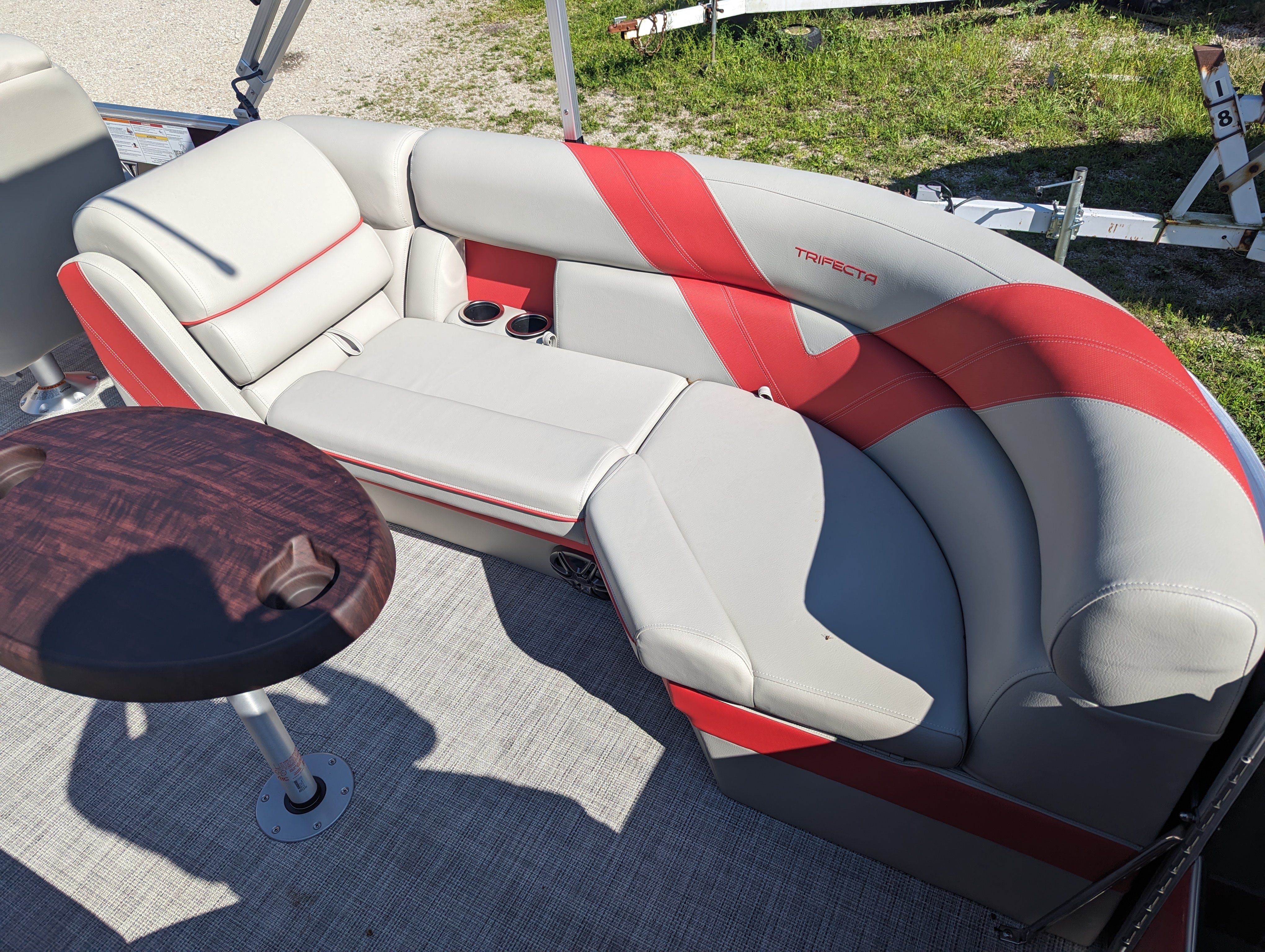 The Red and Black Trifecta is equipped with a Mercury 150 HP outboard. It comes with twin Captain Chairs, Color Lowrance GPS & Depth Finder, Scanstrut phone charger, Clarion speaker system and Bluetooth audio. There is ample storage and a master power switch on the helm. Includes LED lit Clarion, and removable table with built in cup holders. There are also 11 other cup holders aboard. This boat will comfortably seat at least 10 people. It is rated for 13! It rides like a dream.