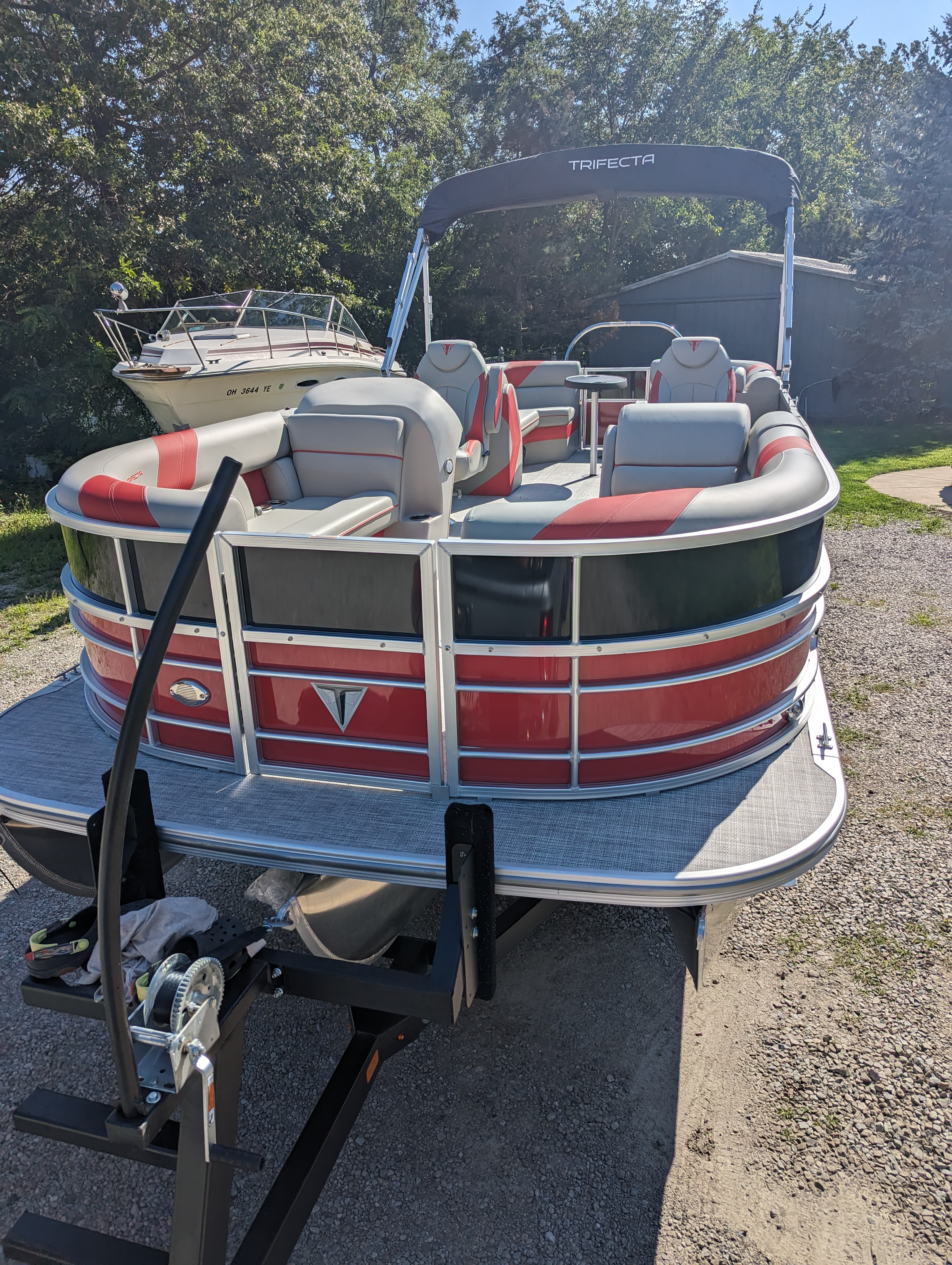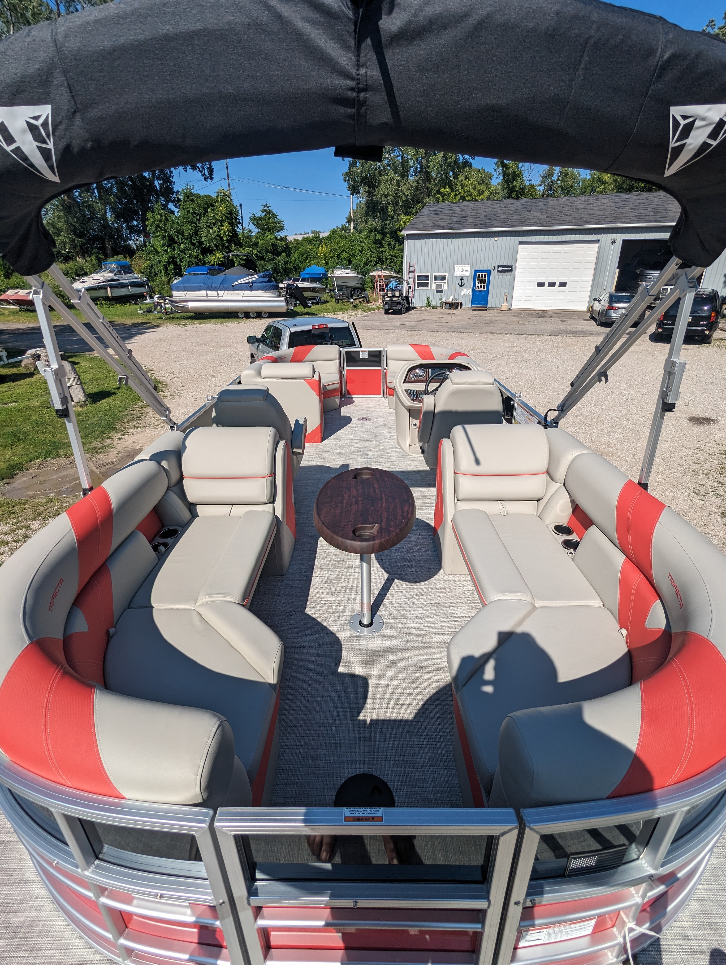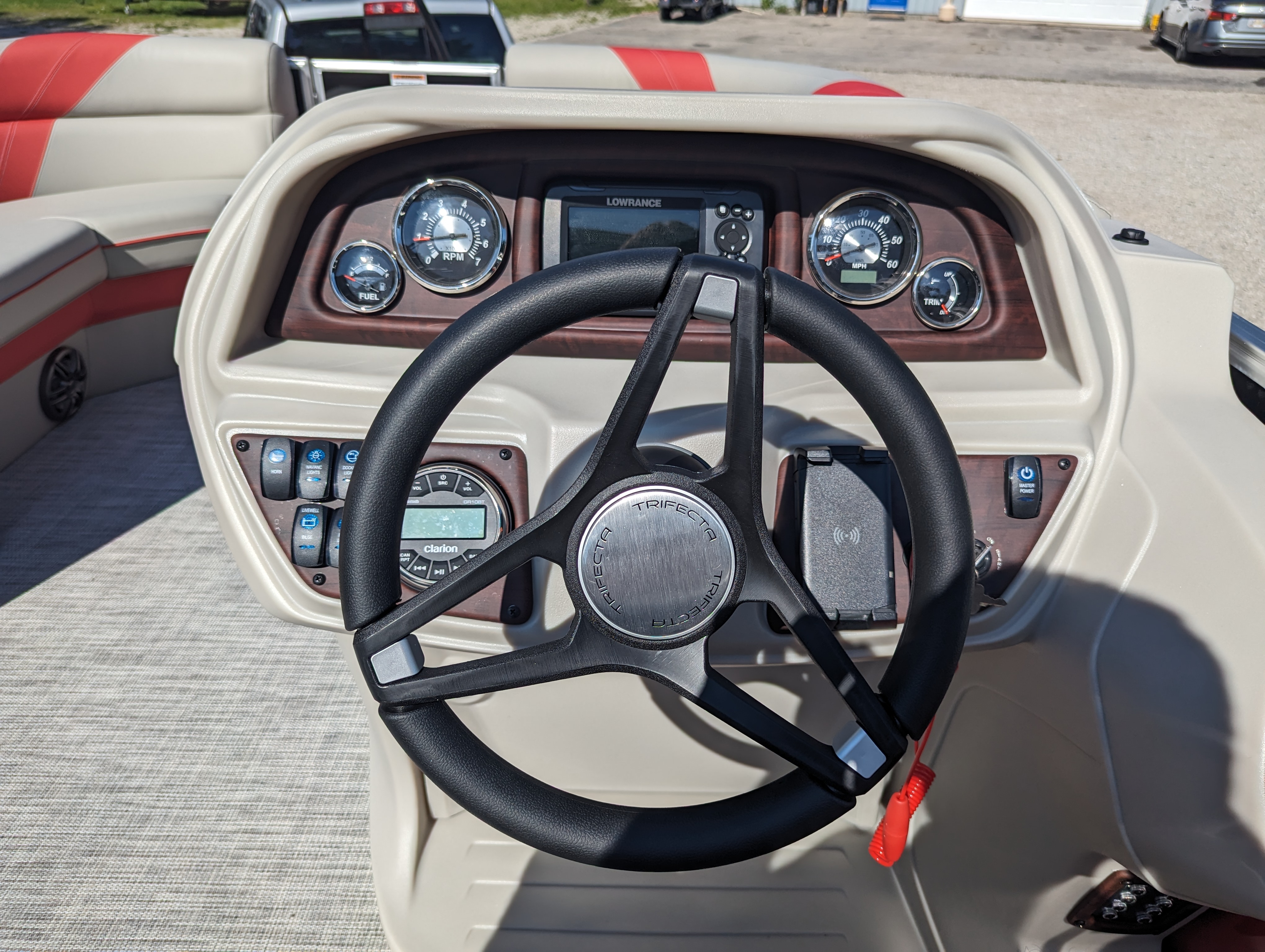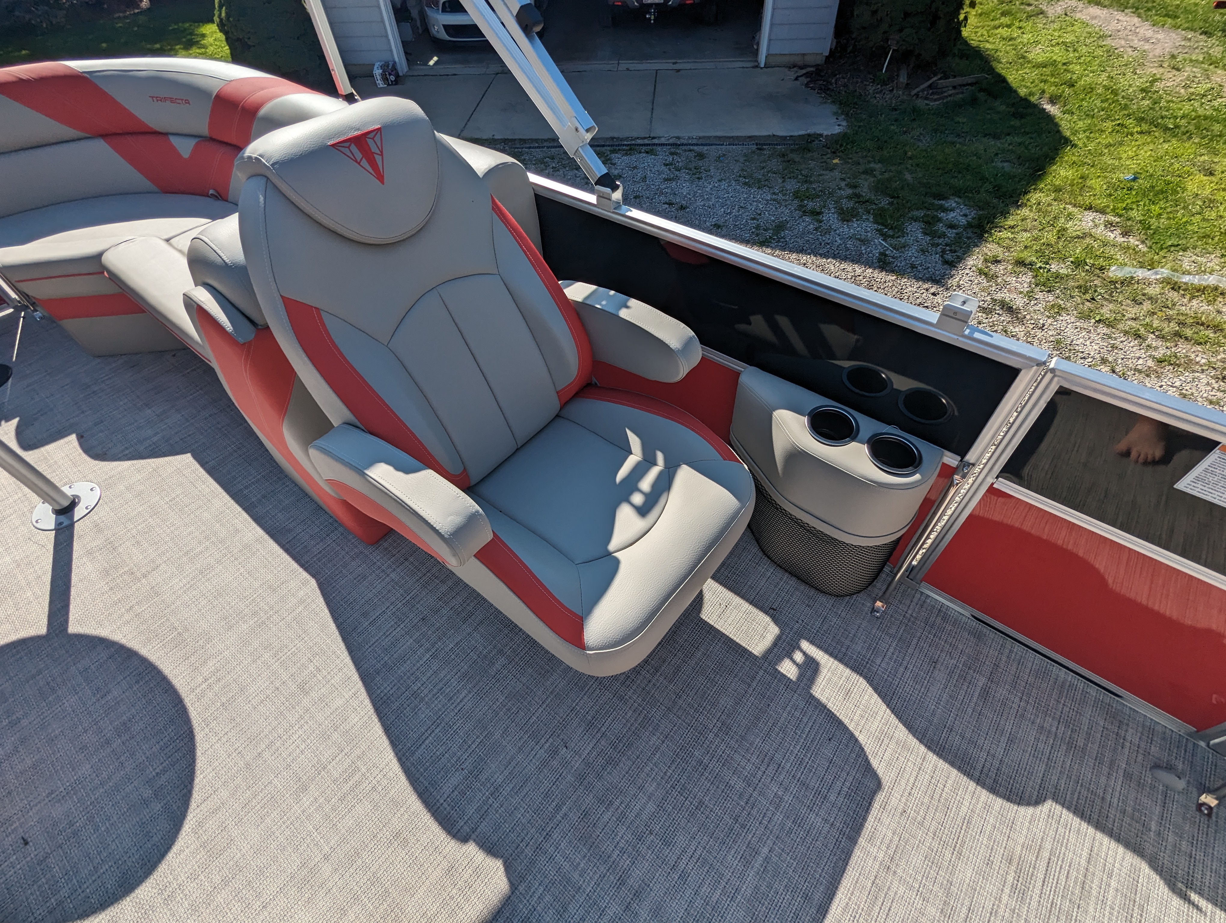 The Red and Black Trifecta is equipped with a Mercury 150 HP outboard. It comes with twin Captain Chairs, Color Lowrance GPS & Depth Finder, Scanstrut phone charger, Clarion speaker system and Bluetooth audio. There is ample storage and a master power switch on the helm. Includes LED lit Clarion, and removable table with built in cup holders. There are also 11 other cup holders aboard. This boat will comfortably seat at least 10 people. It is rated for 13! It rides like a dream.