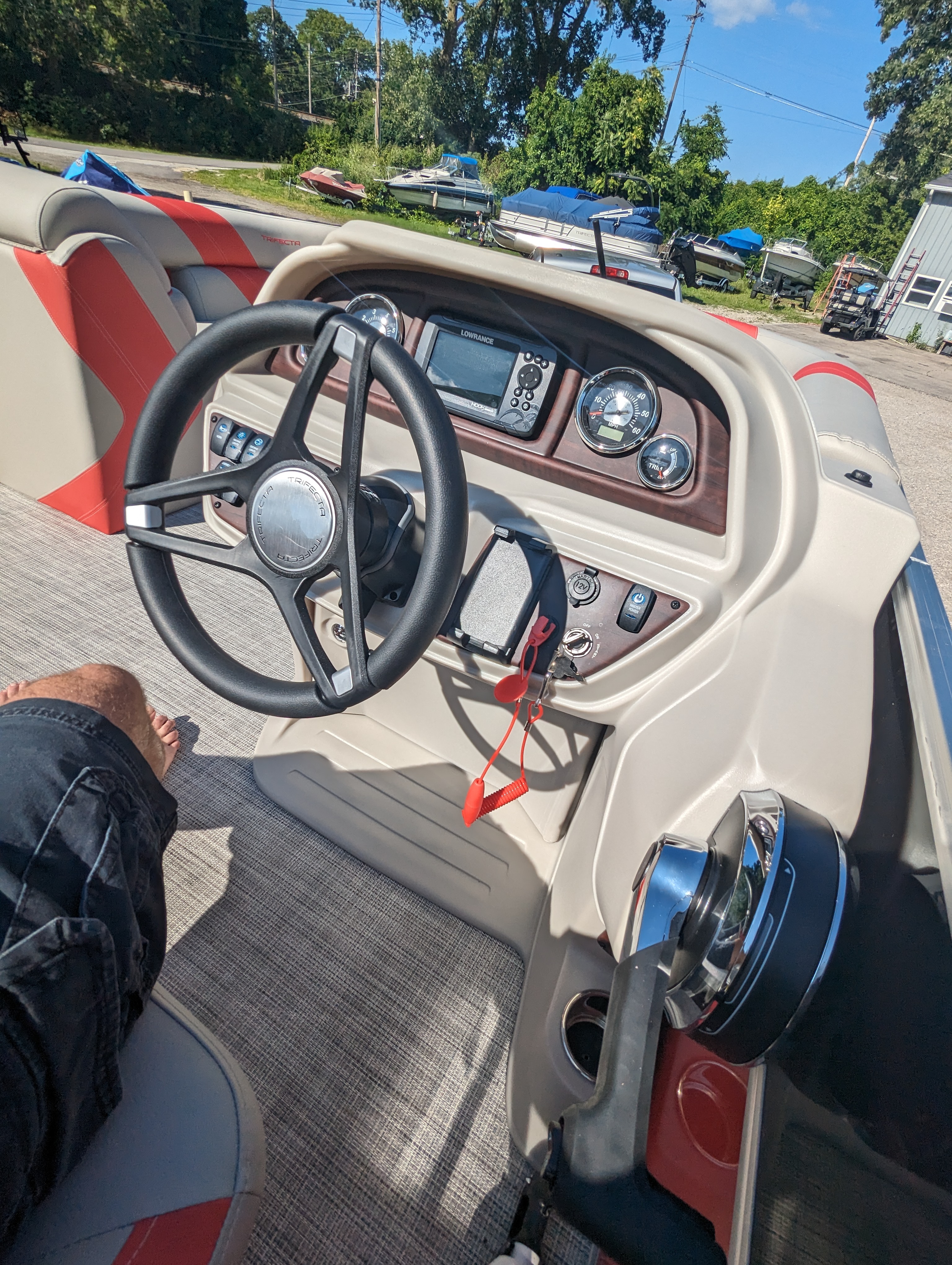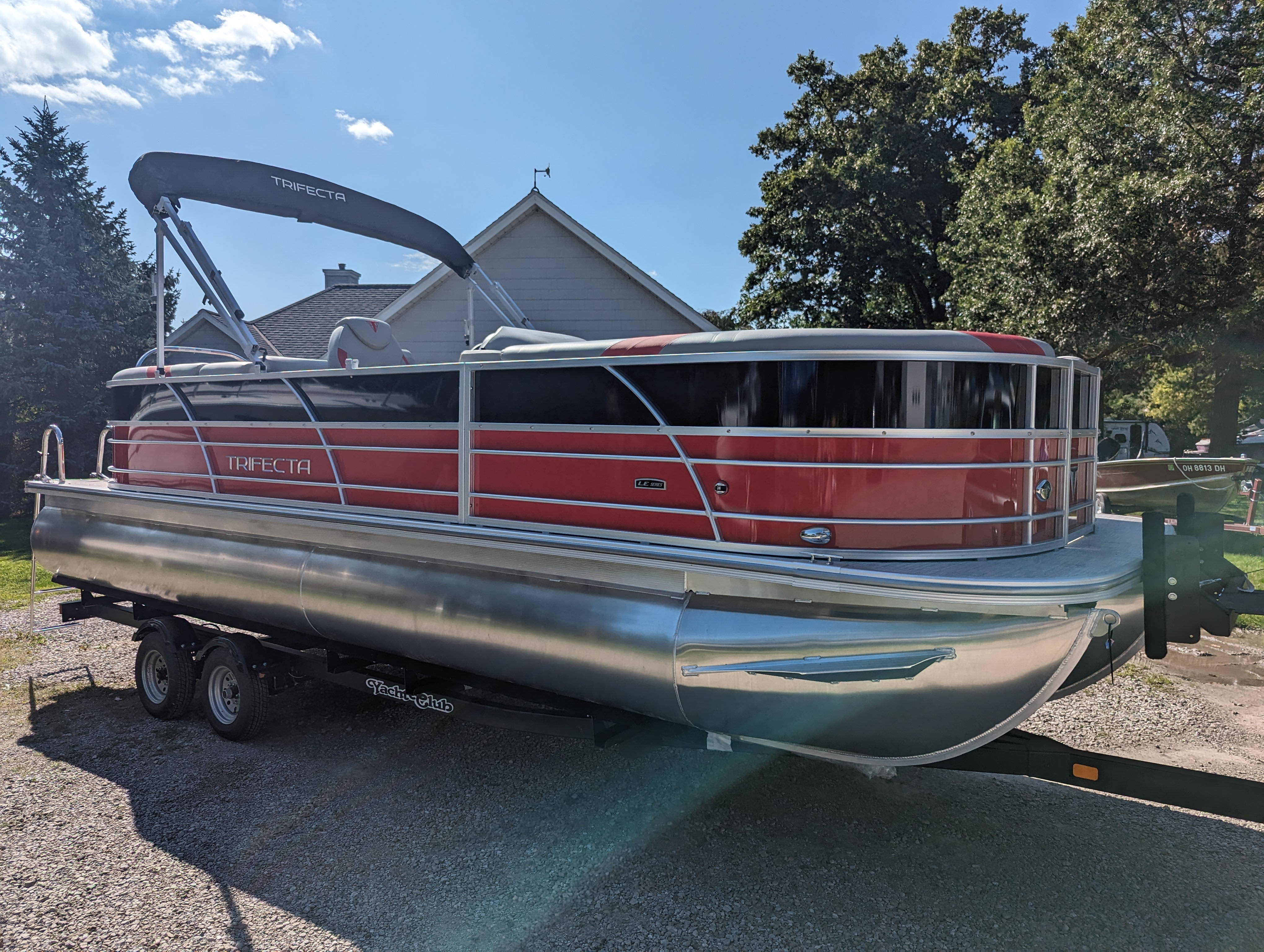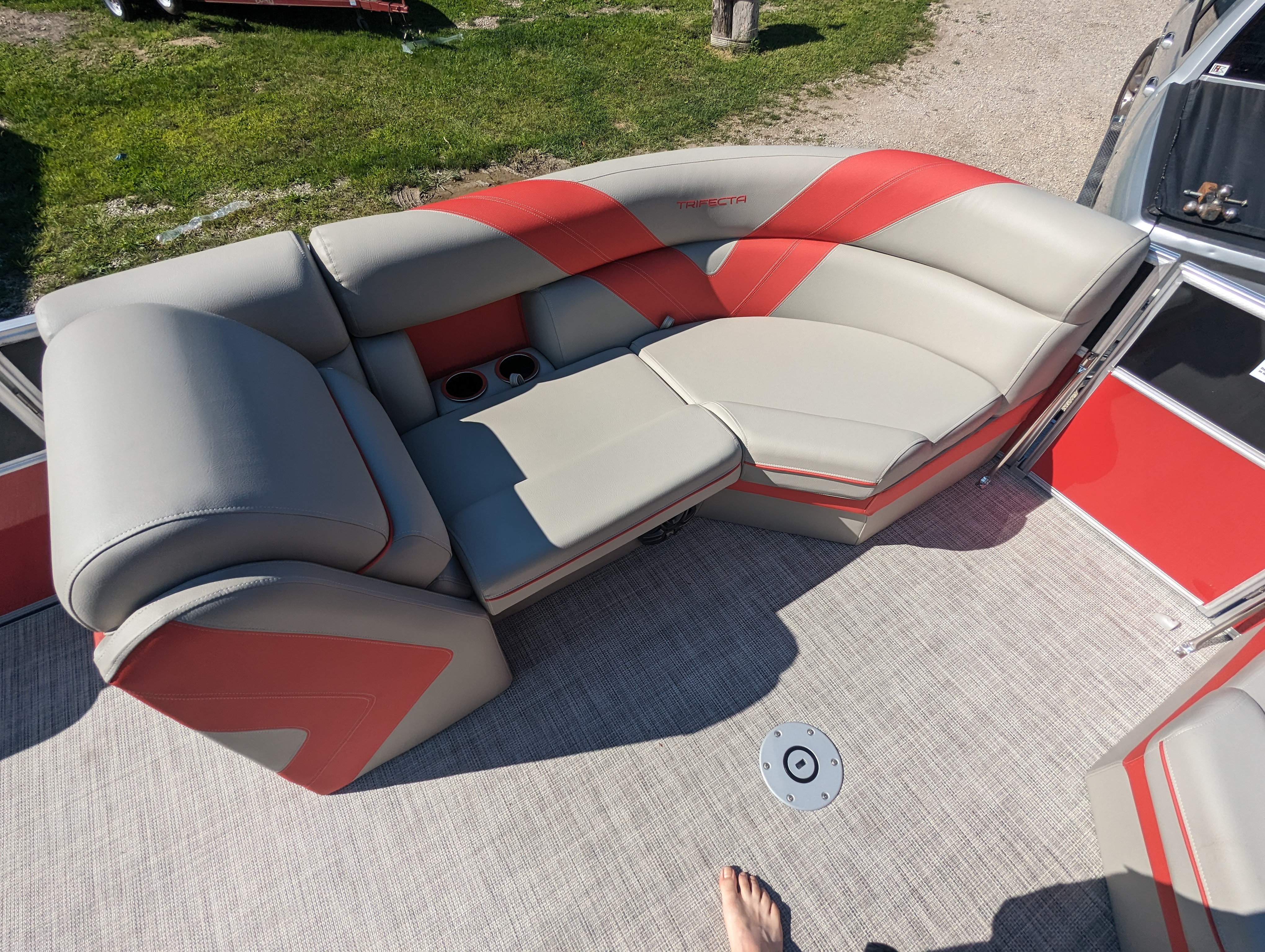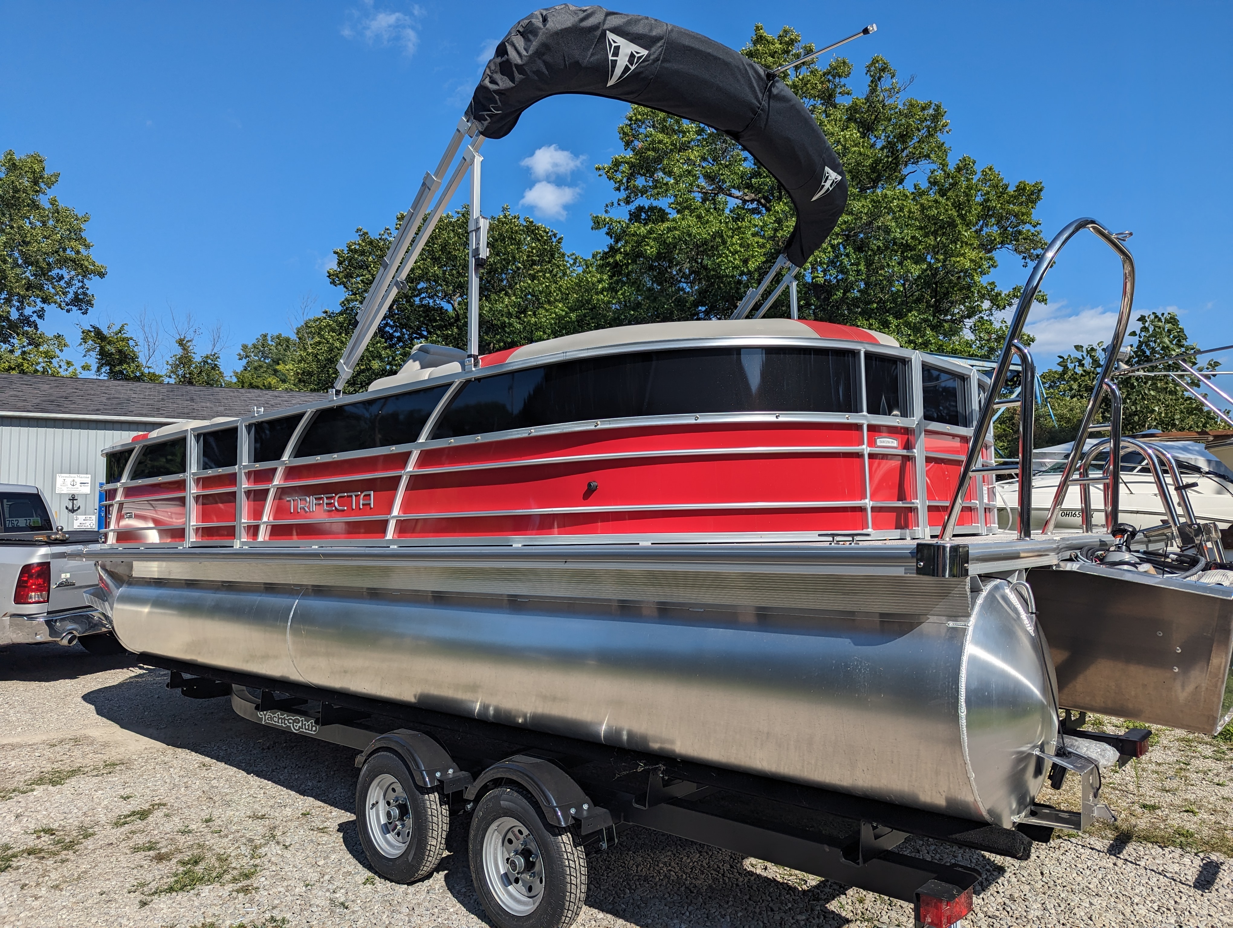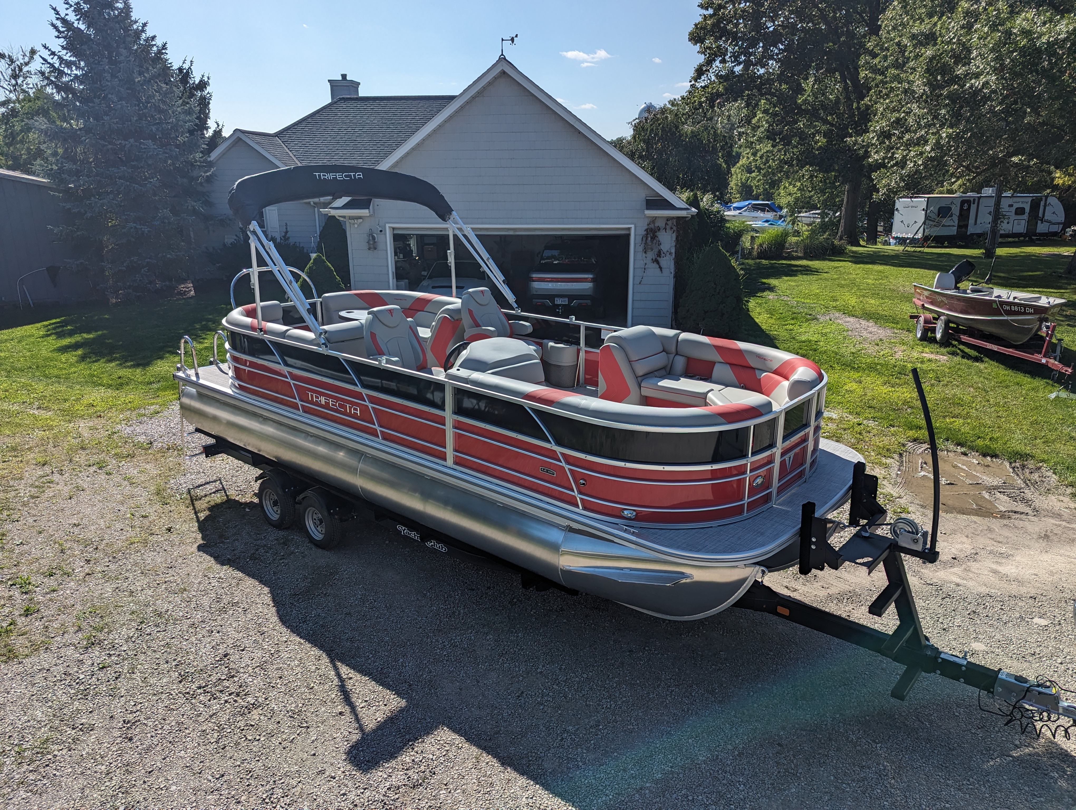 The Red and Black Trifecta is equipped with a Mercury 150 HP outboard. It comes with twin Captain Chairs, Color Lowrance GPS & Depth Finder, Scanstrut phone charger, Clarion speaker system and Bluetooth audio. There is ample storage and a master power switch on the helm. Includes LED lit Clarion, and removable table with built in cup holders. There are also 11 other cup holders aboard. This boat will comfortably seat at least 10 people. It is rated for 13! It rides like a dream.