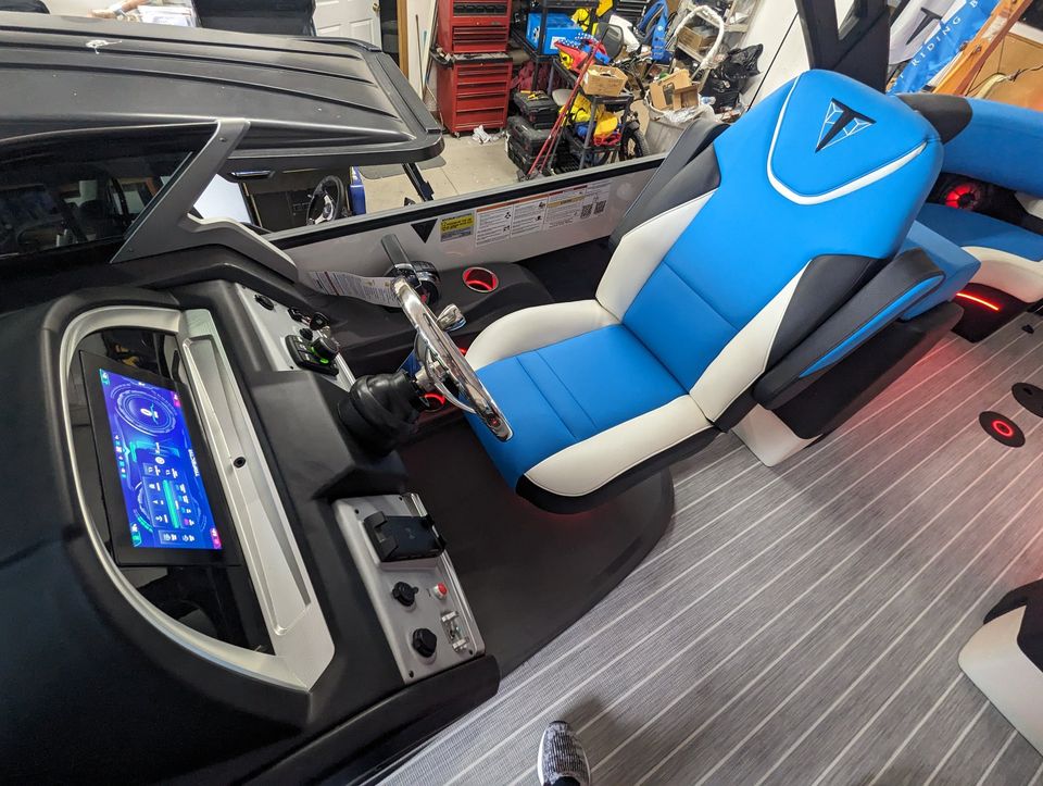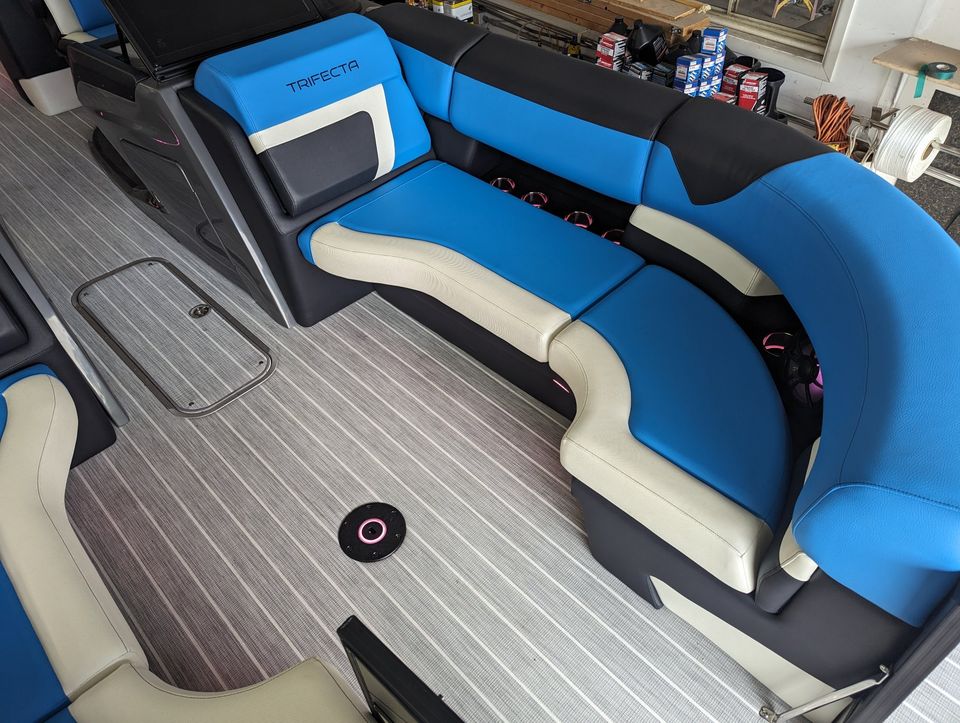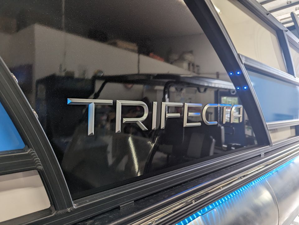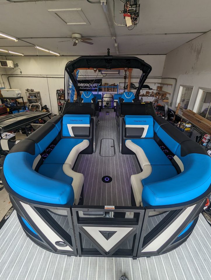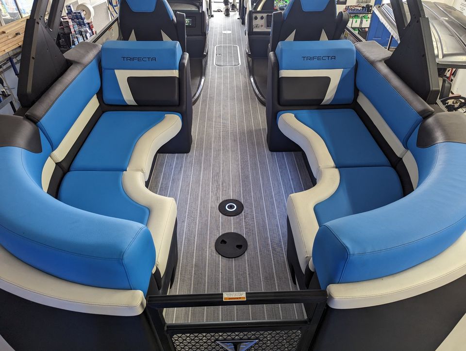 WE COULDN'T WAIT TO SHOW THIS ONE! JUST ARRIVED AND GOT UNWRAPPED. THIS BOAT IS A HEAD TURNER!!! A stunning electric blue, white & black color scheme on this Trifecta S Series with the new Arch and Dual Console for 2024. This boat is sure to turn some heads and capable of 50+. With its industry leading 3.0+ hull giving it the most efficient ride on the market - this boat is perfect for any outings, whether that is on inland lakes or larger bodies of water like our own Lake Erie. A fully customizable RGB LED system throughout the boat gives you unprecedented control of your boat's look at the click of a button. Folding color matched arch makes the boat very easy for storage. Twin touch screen displays allow easy access to all boat features, settings, and GPS navigation. Easy access storage throughout all the boat's seating and in the center toon. Two table mounts with led lighting. 22 RGB LED cupholders. Docking lights. Sink on passenger helm. Three phone USB & USB C charging ports. Scanstrut phone charger on dash. Transom remote for speaker system. And much more... Feel free to call with any additional questions or to schedule a test drive.