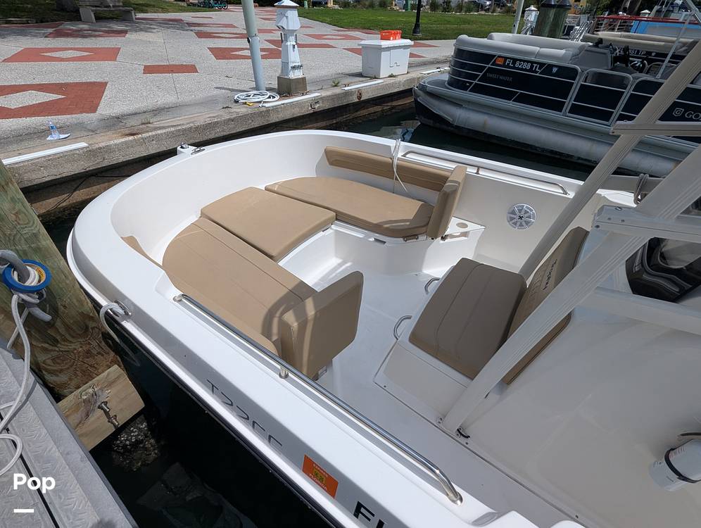 A sturdy T-top provides essential shade and protection, while the spacious center console offers versatility as a changing area or potential porta-potty location. Practical details include bottom anti-fouling paint, dual batteries for reliable performance, low-profile bow rails, and flush-mounted cleats that maintain a clean, streamlined deck layout.