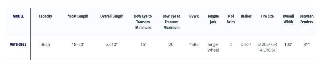 3625 18'-20' 22'10'' 16' 20' 4585 Single Wheel 2 Disc-1 ST205/75R 14 LRC 5H 100" 81" Carrying Capacity: 3625 lb.