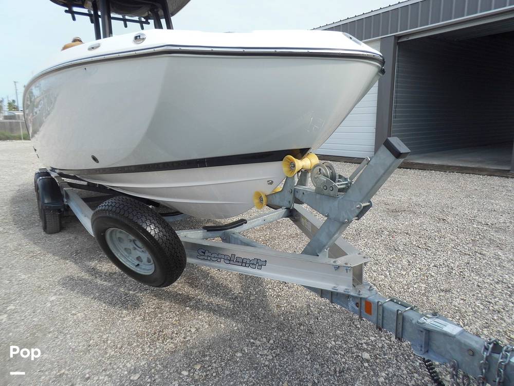 Fishing Features of the boat include dual livewells (30-gal stern, 18-gal forward), multiple rod holders and racks on console and hardtop, insulated fish box under bow seat, 12" Simrad touchscreen GPS-fishfinder, tackle storage, bucket compartment, and raw water washdown.