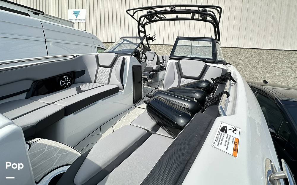 At the helm of this boat you will find it packed with innovative technology features like an integrated SurfPointe wake surf system with push-button-controlled custom wakes, integrated Yamaha Wake Enhancer, a triple ballast system to create a clean, surfable wake, Yamaha's E-Series drive-by-wire functionality, and a 12.3-inch Connext touchscreen display that displays all both functions even controlled with Bluetooth. You have a folding wakeboard tower with wakeboard racks and 2 super large Base speakers blasting your favorite tunes while blasting through the water. There is a full Bimini top. In the bow, you have seating for four plus an anchor with a locker.