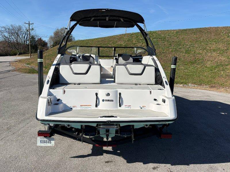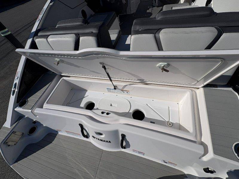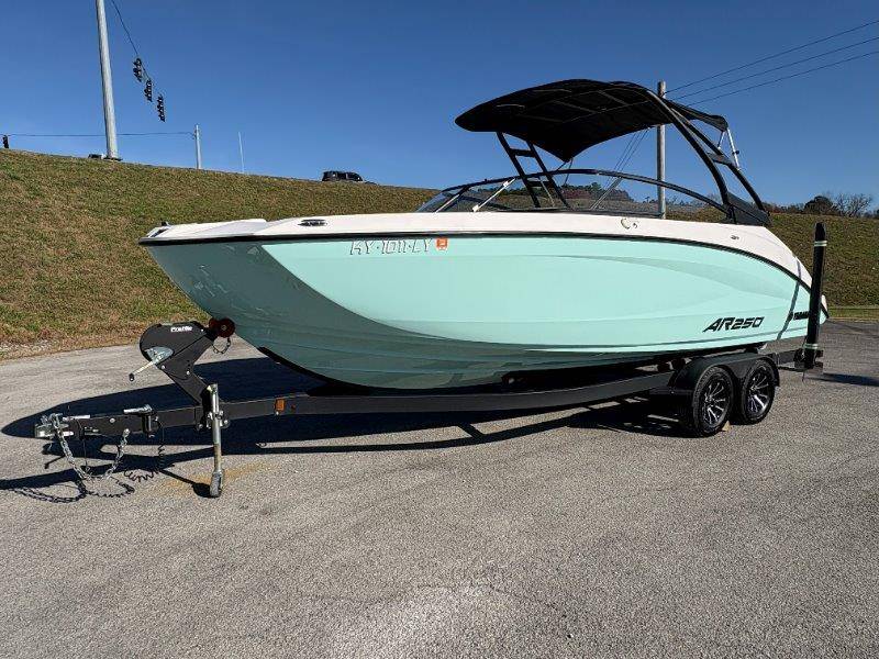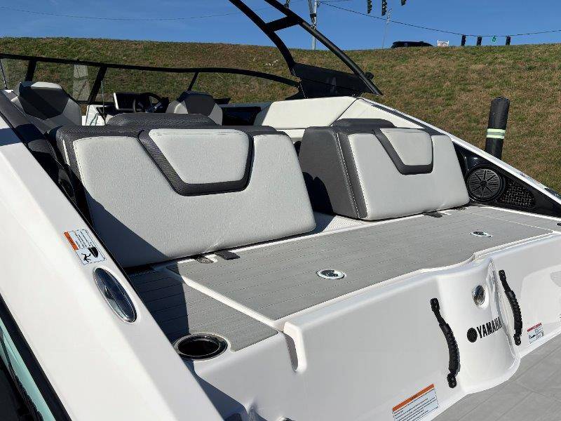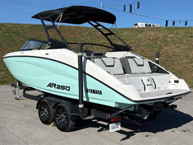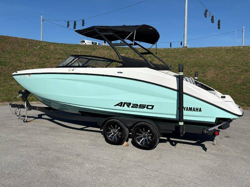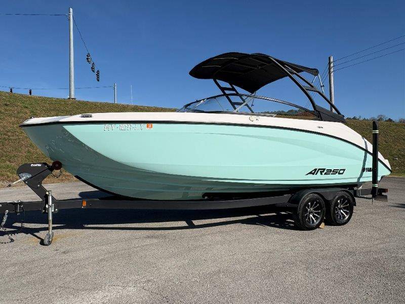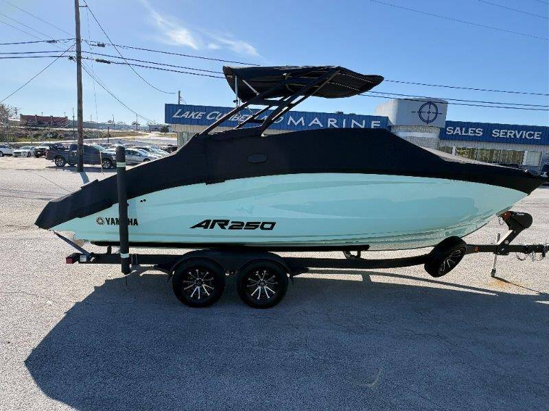 2024 Yamaha AR250 Twin Yamaha Marine 1.9 HO Engines Port Engine showing 52.6 Starboard showing 52.7 hours Rear Boarding Ladder Watersports Tower Bimini Top Full Cover Dual Batteries with Selector Switch Ski Locker Removable Dinette Table with Pedestal Hinged Seat Cushions Integrated Drink Holders Tilt Steering Adjustable Captain's Chair with Flip-up Bolster Walk-through Bow Door Courtesy Deck Lighting Dedicated Anchor and Rope Locker Bow Reboarding Ladder Cockpit Drainage System Integrated Swim Platform Upholstered Cushioned Backrests with Storage 12-volt Outlet Stainless Steel Telescopic Reboarding Ladder 7-inch Connext with Touchscreen Custom Fit Smartphone Holder Black Helm Switch Panels Premium Marine Stereo No Wake Mode Control Cruise Assist Compass Electronic Speedometer Fuel Management System
