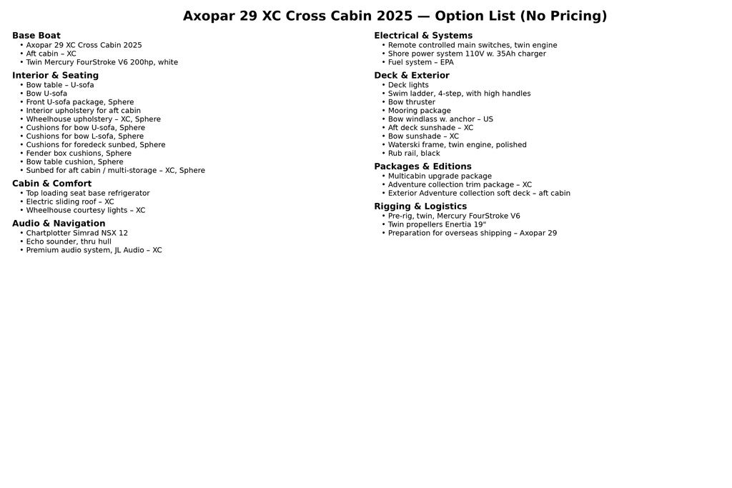 This clean, well-kept 2024 Axopar 29 Cross Cabin combines year-round comfort with confident performance. Featuring a fully enclosed Cross Cabin design and powered by twin Mercury 200HP V6 outboards, this boat is built for versatile use in changing conditions while maintaining Axopar’s signature handling and efficiency. With very light use and thoughtful equipment throughout, this 29 Cross Cabin is ideal for cruising, day trips, and extended seasons on the water.