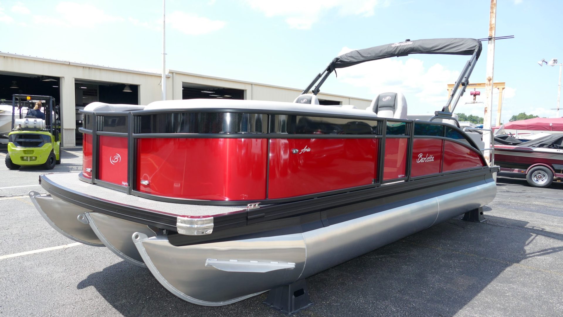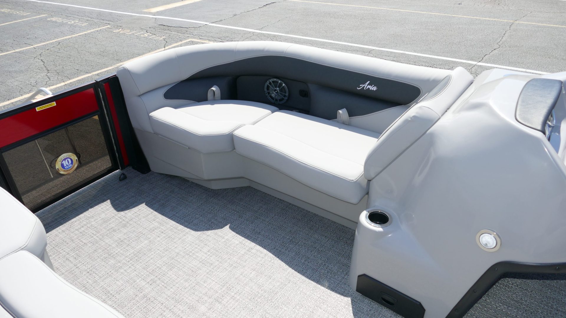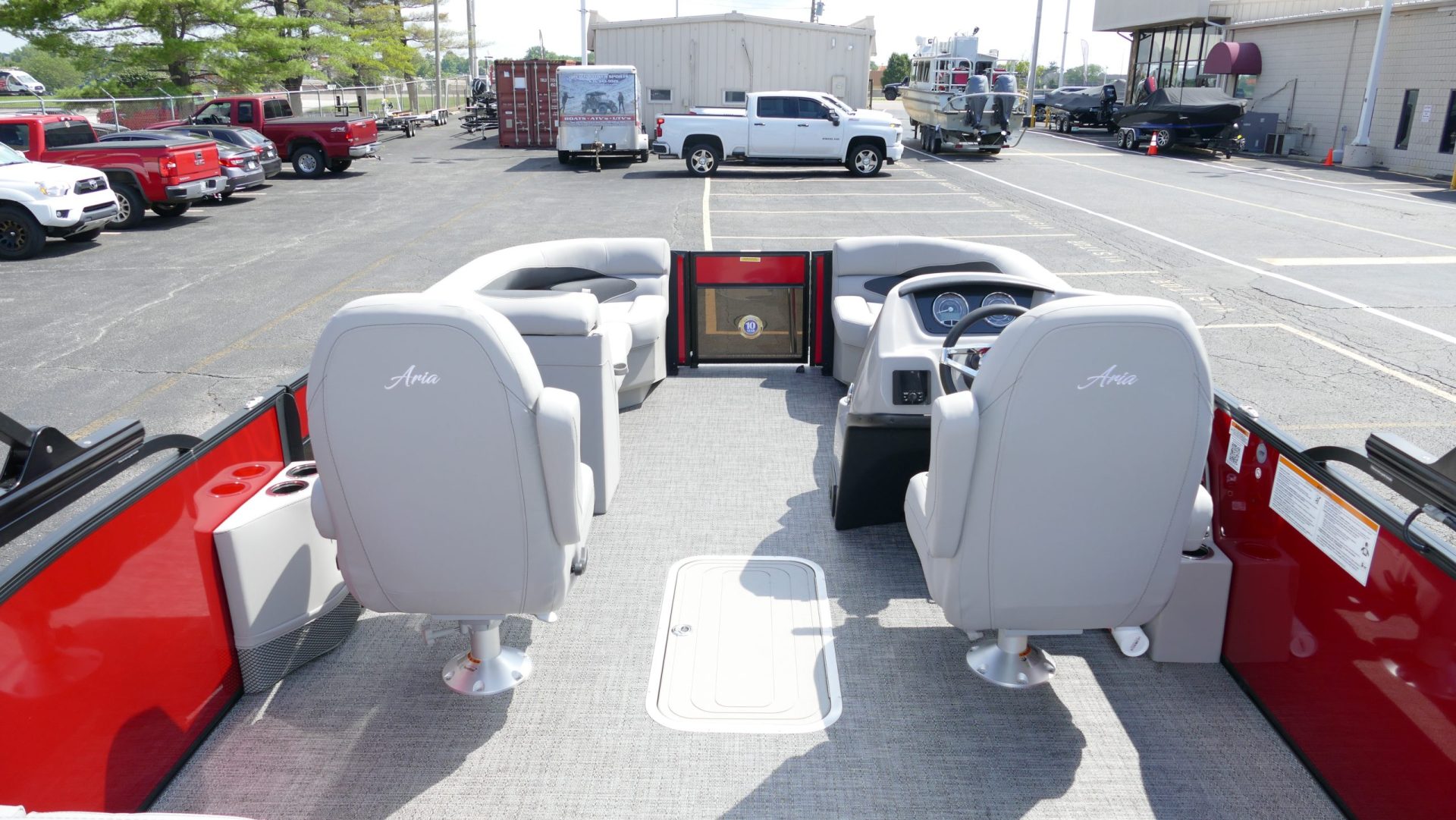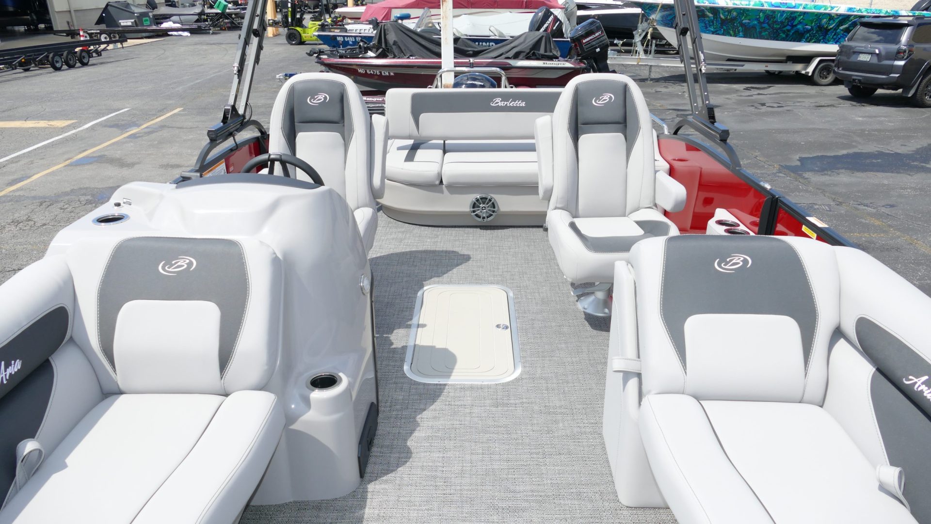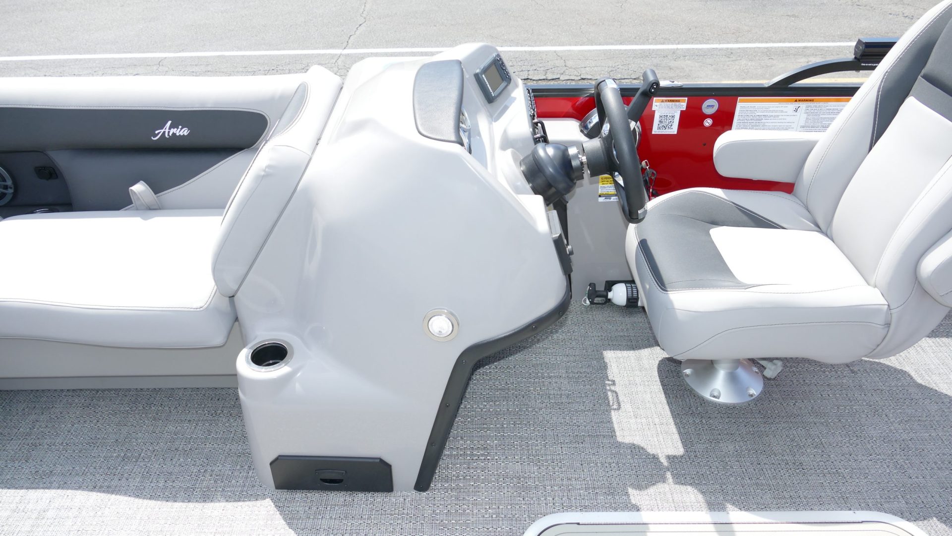 Railskin Color - Macau Red, Railskin Accent Color: Black Diamond, Interior Colors : Tempest Gray / Black Accent, Flooring : Amore Gray Full Length Flooring, Aria Tri Toon Package Includes: 25" Center Tube With 53 Gallon Fuel Tank, Full Lifting Strakes (Inside & Outside), Hydraulic Steering, Ski Tow Bar, Full Belly Skin, Aria Blackout Package Includes : Black Rails, Black Bimini, Black Rubrail, Black Skirting, Black Shims And Gate Pockets, Black Heavy-Duty Rail Supports, Mercury 150L. 4 Stroke, In Floor Midship Storage, Stainless Steel Safety Stanchions With Chains, Propeller, Lifetime + 10 Year Bow To Stern Warranty. Trailer Available For A Additional Cost.