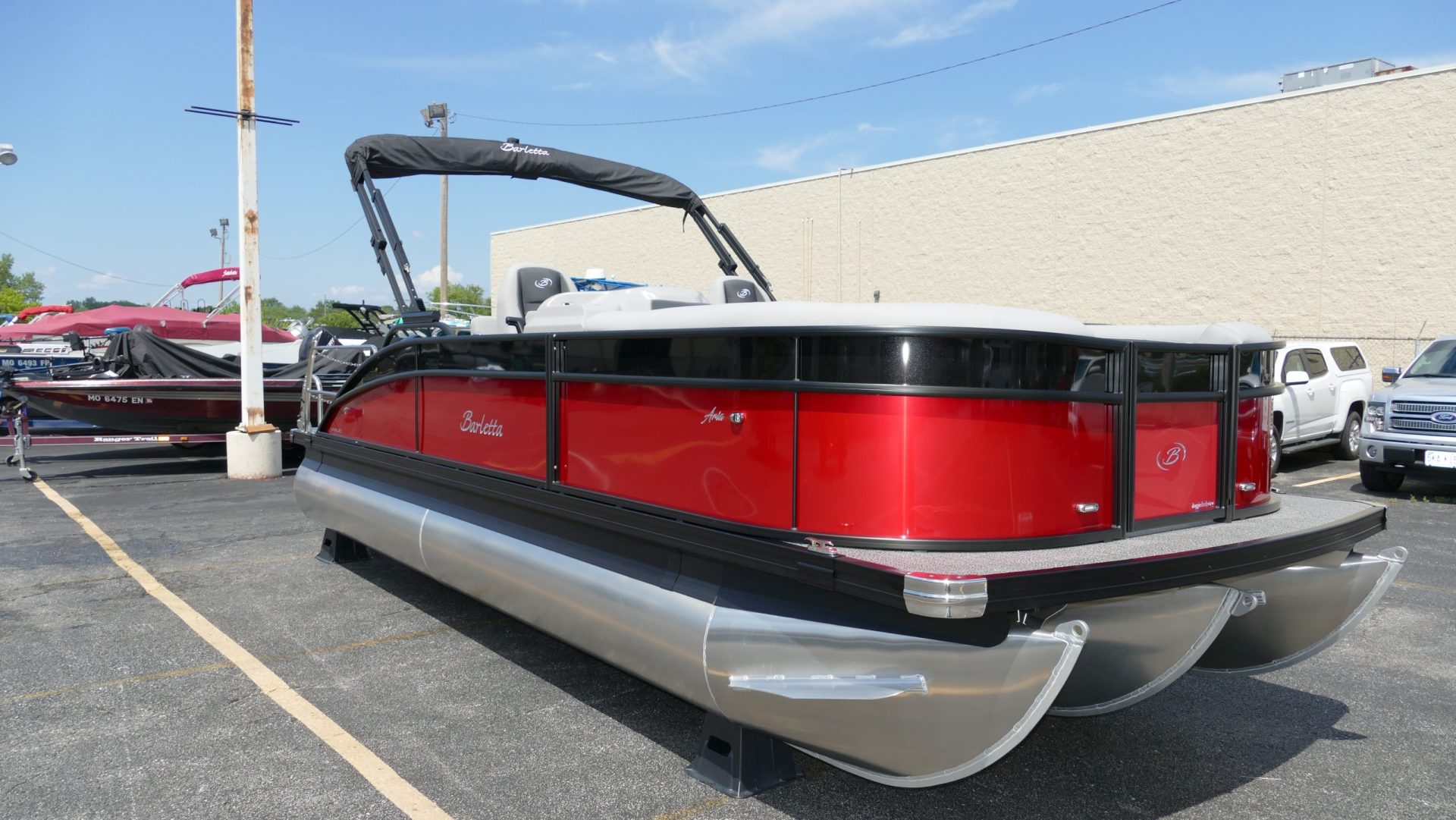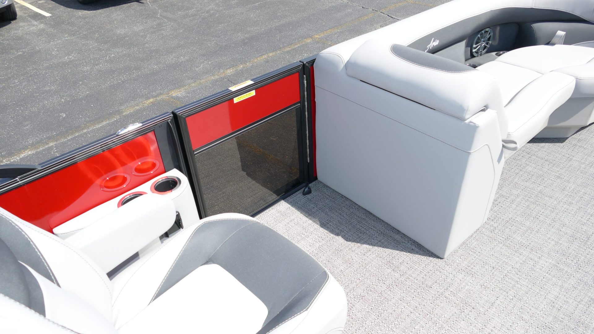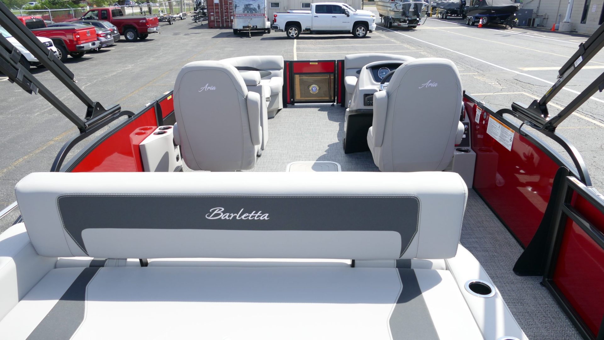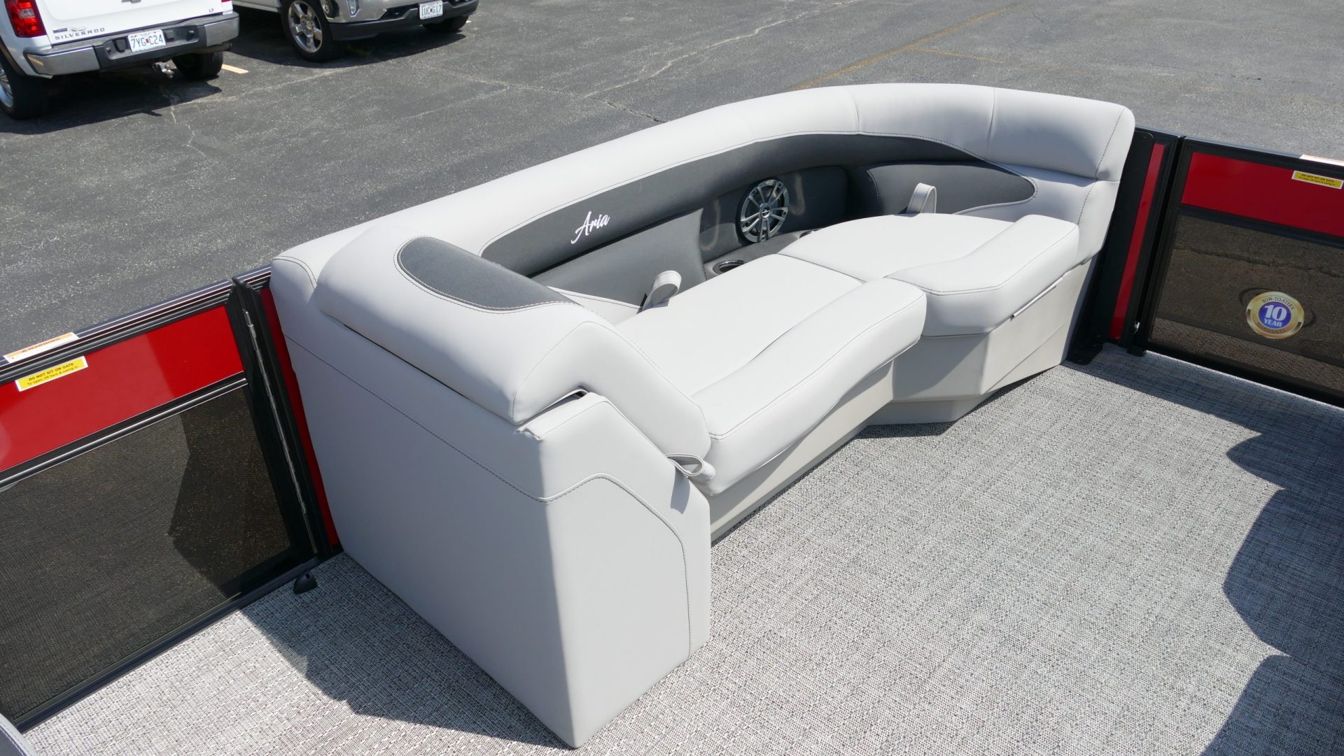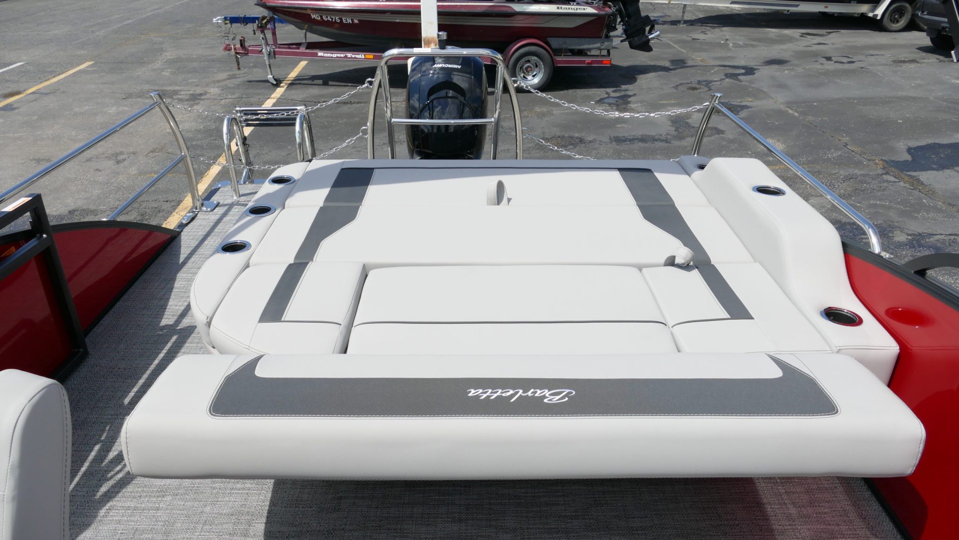 Railskin Color - Macau Red, Railskin Accent Color: Black Diamond, Interior Colors : Tempest Gray / Black Accent, Flooring : Amore Gray Full Length Flooring, Aria Tri Toon Package Includes: 25" Center Tube With 53 Gallon Fuel Tank, Full Lifting Strakes (Inside & Outside), Hydraulic Steering, Ski Tow Bar, Full Belly Skin, Aria Blackout Package Includes : Black Rails, Black Bimini, Black Rubrail, Black Skirting, Black Shims And Gate Pockets, Black Heavy-Duty Rail Supports, Mercury 150L. 4 Stroke, In Floor Midship Storage, Stainless Steel Safety Stanchions With Chains, Propeller, Lifetime + 10 Year Bow To Stern Warranty. Trailer Available For A Additional Cost.