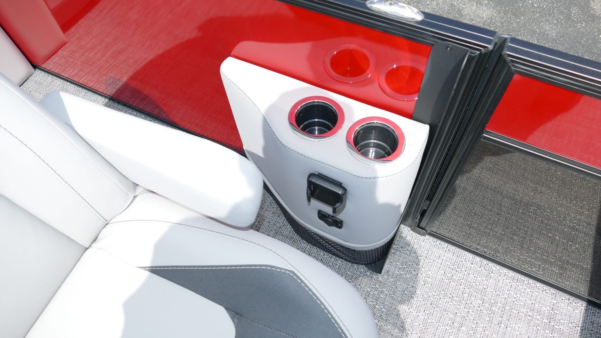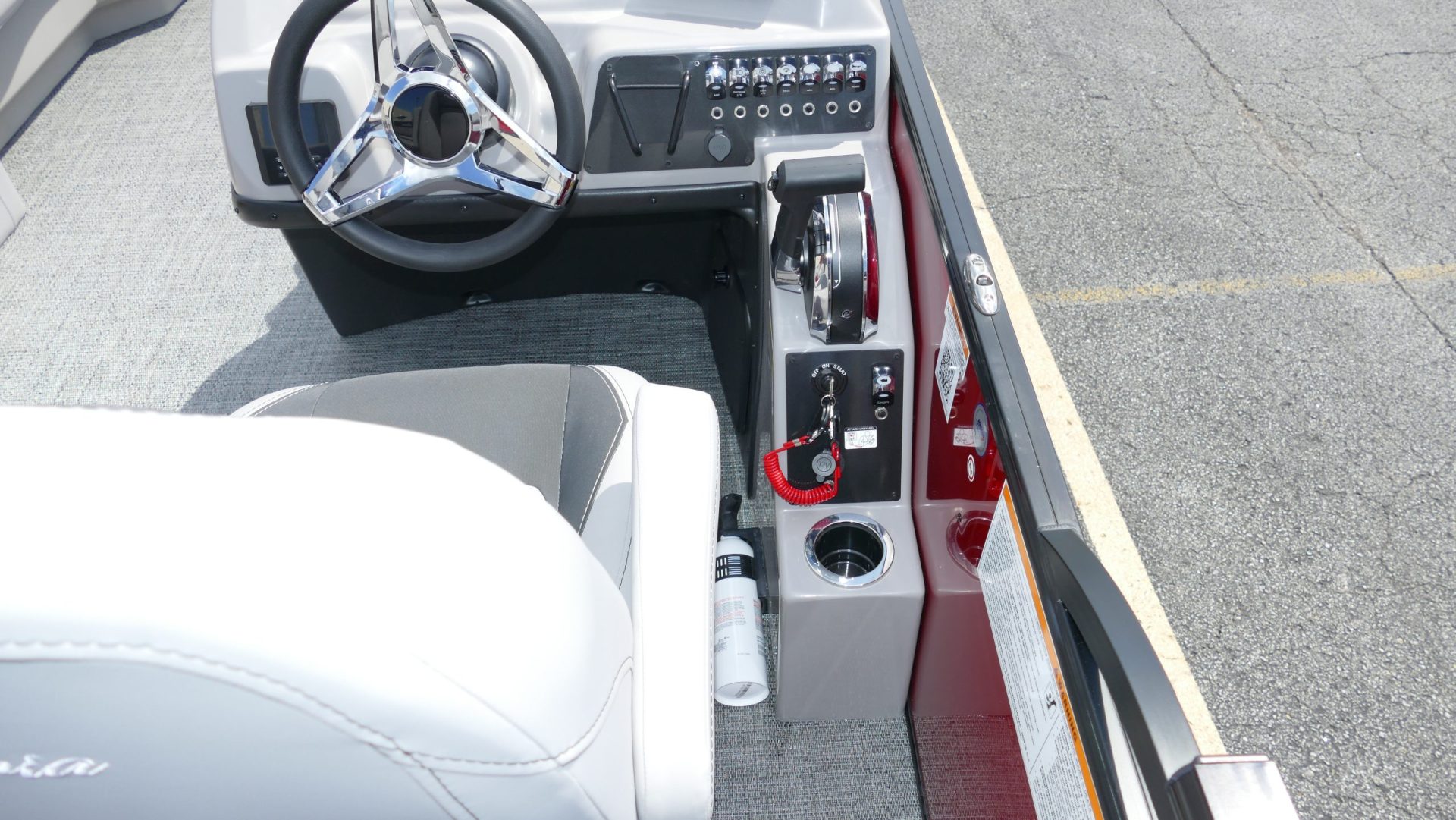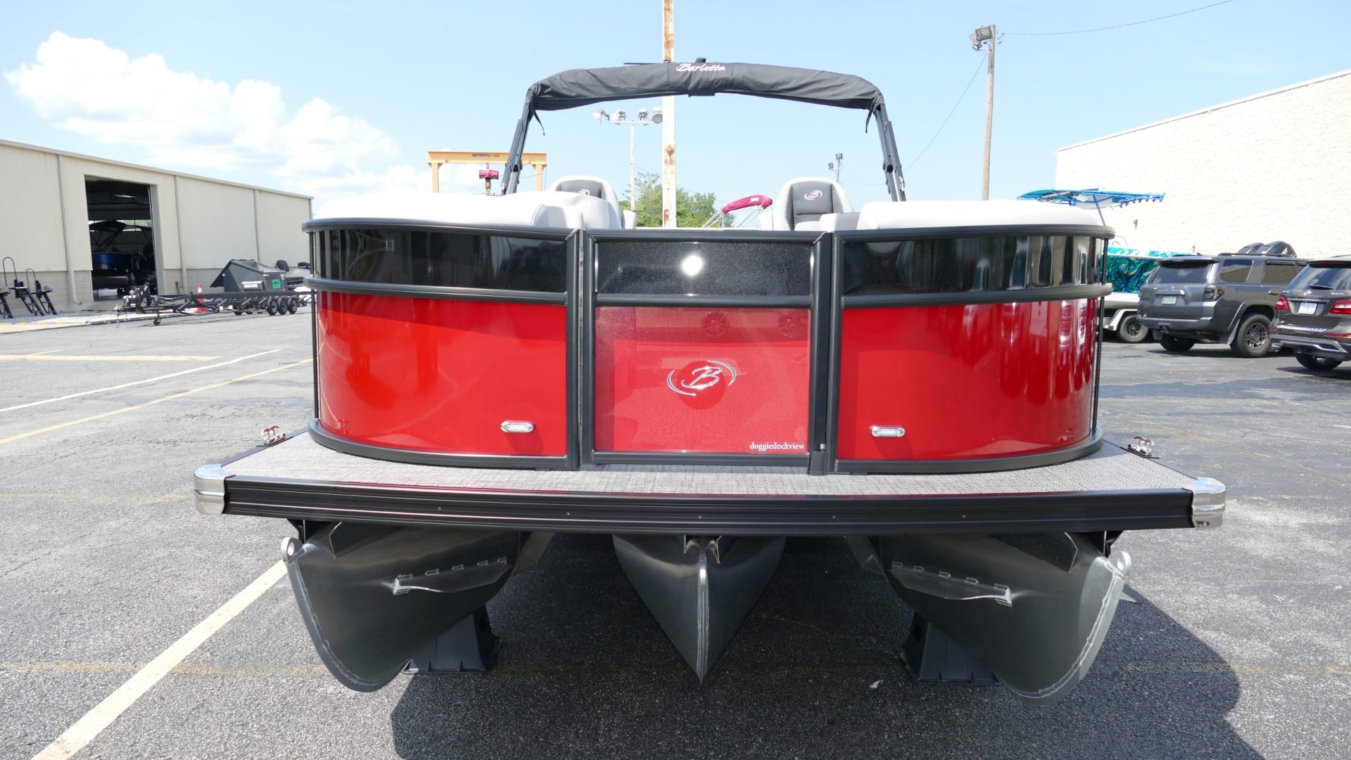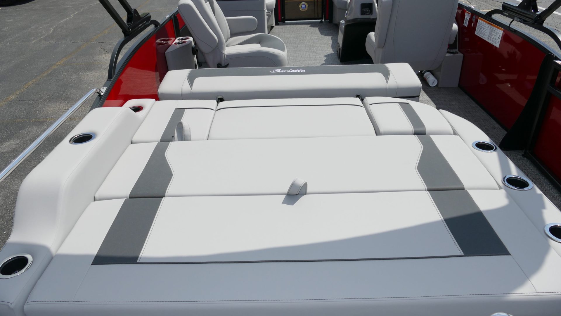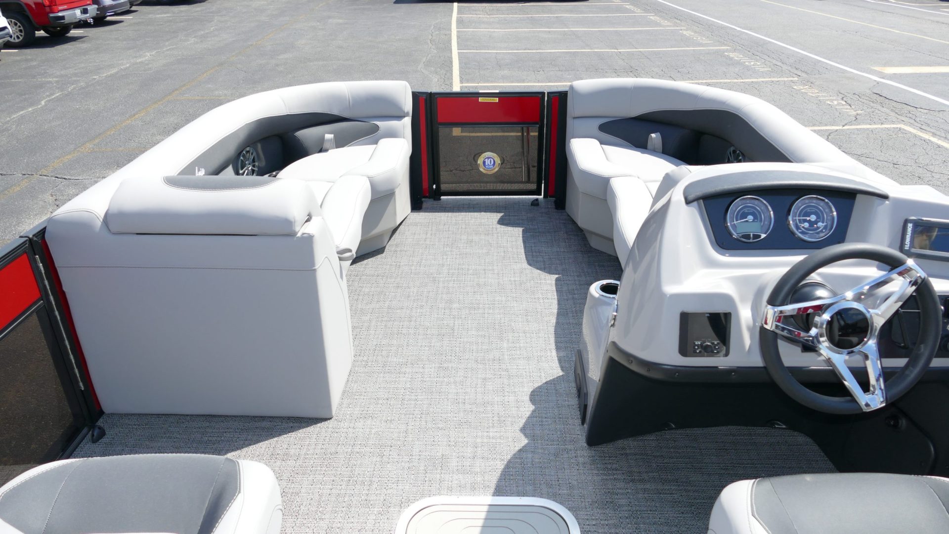 Railskin Color - Macau Red, Railskin Accent Color: Black Diamond, Interior Colors : Tempest Gray / Black Accent, Flooring : Amore Gray Full Length Flooring, Aria Tri Toon Package Includes: 25" Center Tube With 53 Gallon Fuel Tank, Full Lifting Strakes (Inside & Outside), Hydraulic Steering, Ski Tow Bar, Full Belly Skin, Aria Blackout Package Includes : Black Rails, Black Bimini, Black Rubrail, Black Skirting, Black Shims And Gate Pockets, Black Heavy-Duty Rail Supports, Mercury 150L. 4 Stroke, In Floor Midship Storage, Stainless Steel Safety Stanchions With Chains, Propeller, Lifetime + 10 Year Bow To Stern Warranty. Trailer Available For A Additional Cost.