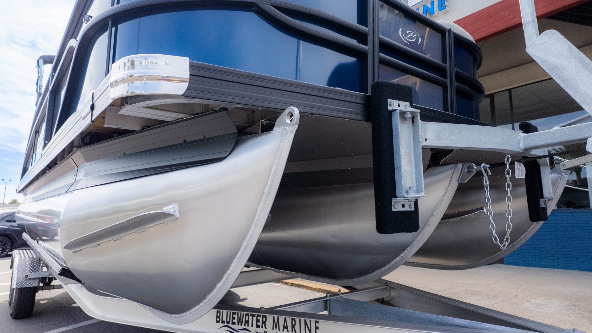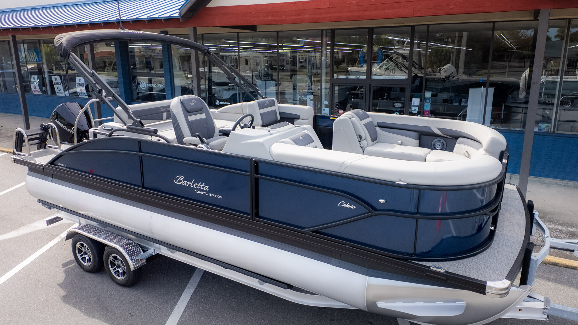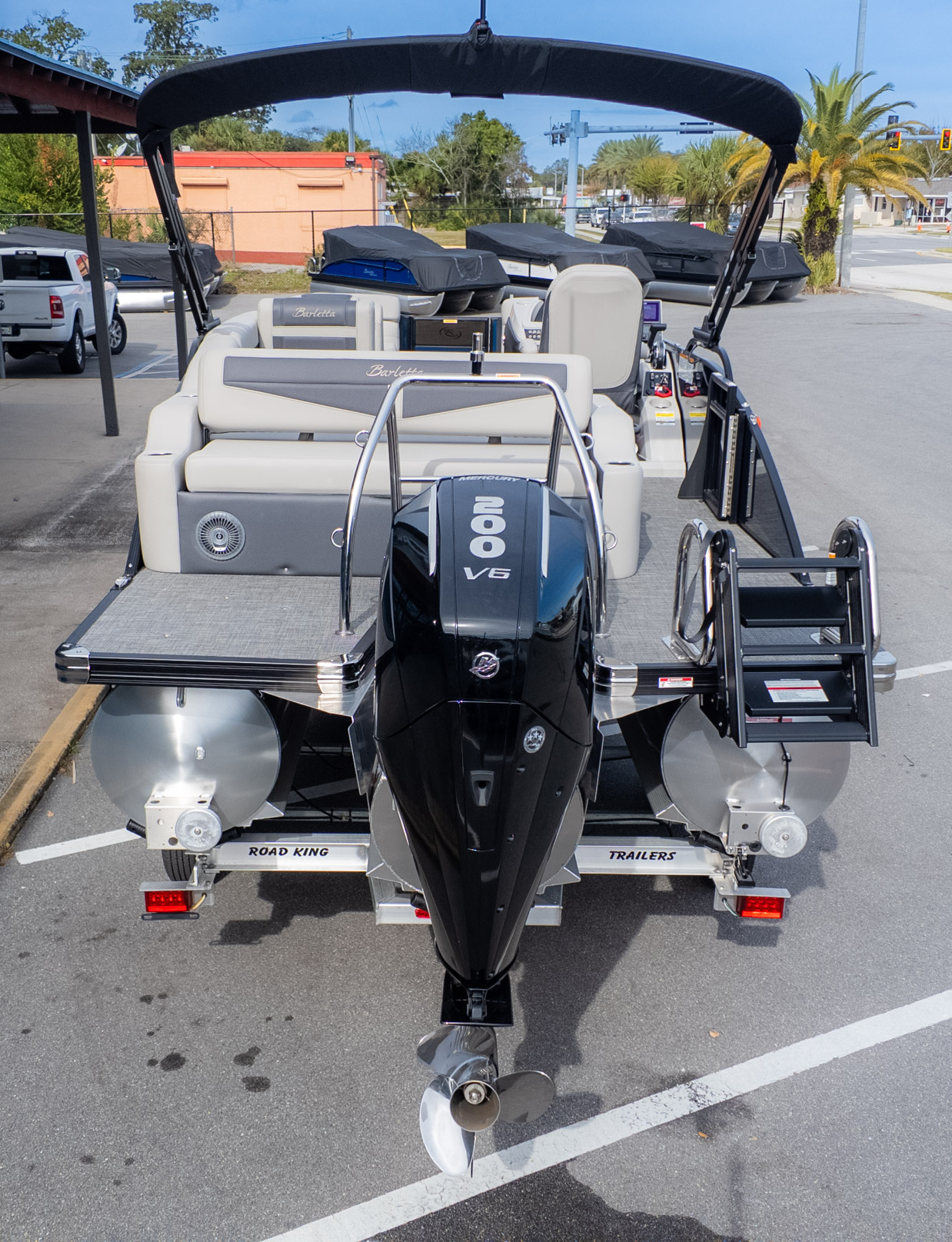 Imagine setting sail with the sun glinting off the Blue Sapphire rails, surrounded by the sleek Blackout Package. The Marquesan Gray furniture with Charcoal accents offers a stylish and comfortable setting for all your adventures, complemented by the Amore Gray flooring underfoot. Whether you're towing water sports enthusiasts with the tube-tow cage or just kicking back with your favorite tunes on the JBL Marine Stereo, this boat promises endless fun. Plus, with integrated pet food/water dishes and a convenient stern boarding ladder, your furry friends are just as welcome on board. The Coastal Edition and Triple Toon Package, complete with midship storage, ensure a smooth and stable ride, making every journey a delight. This boat comes equipped with a Mercury 200L FourStroke engine.