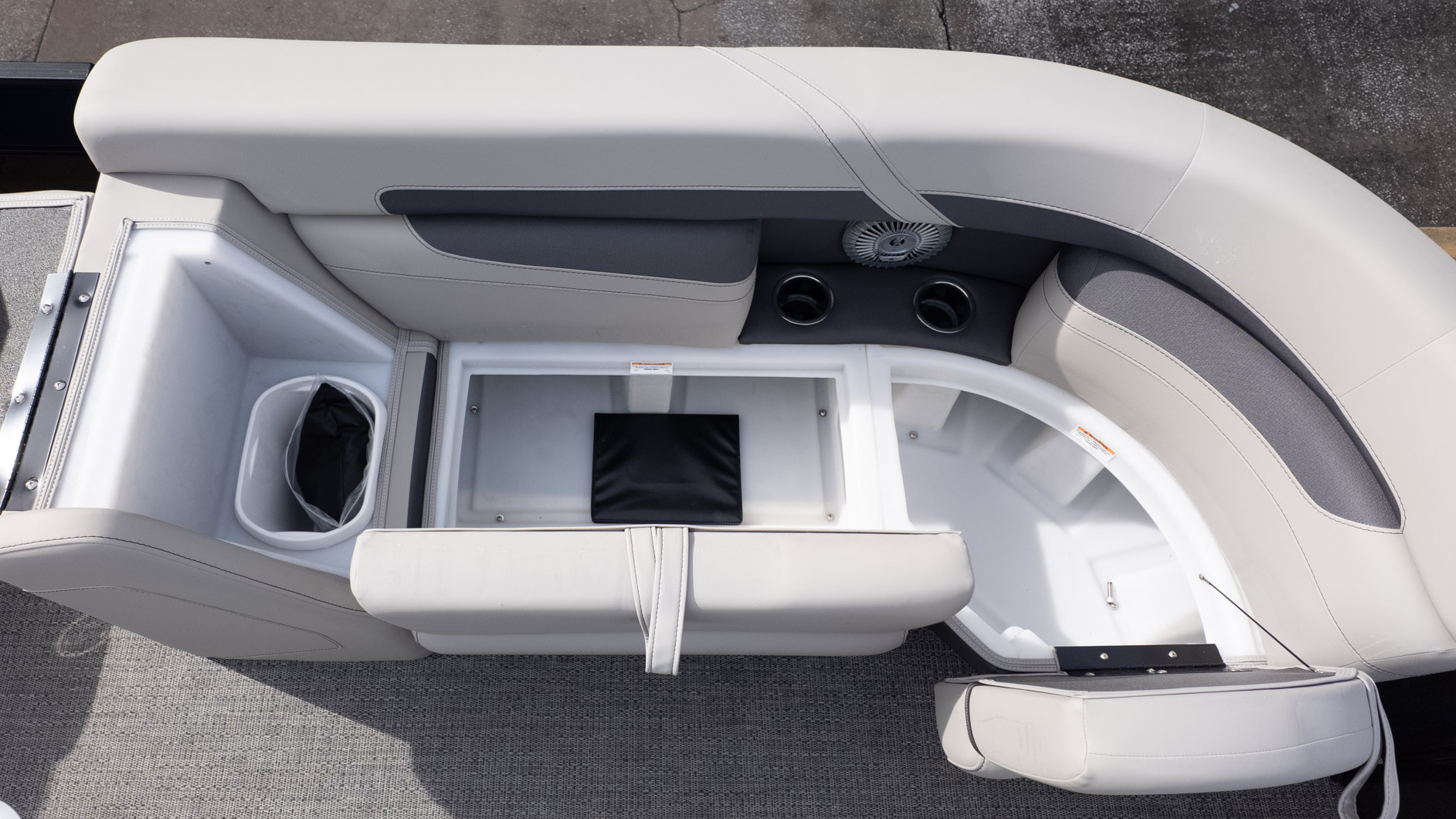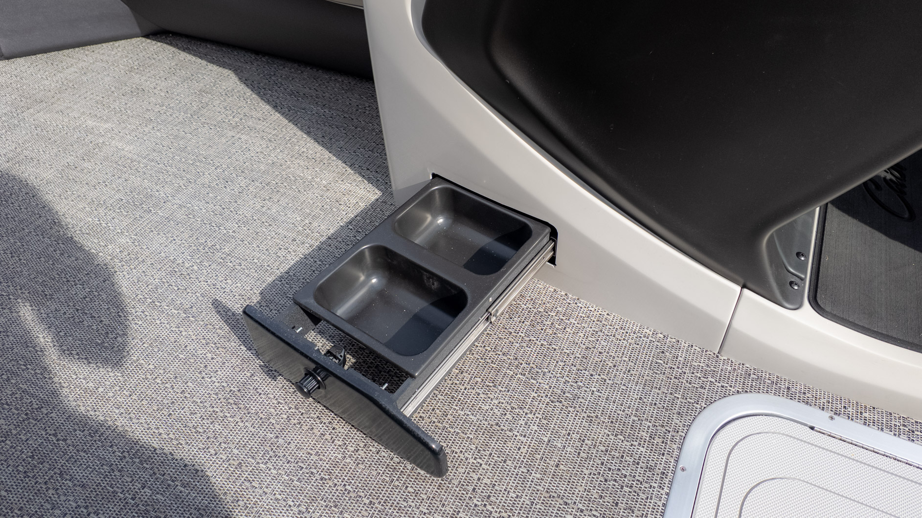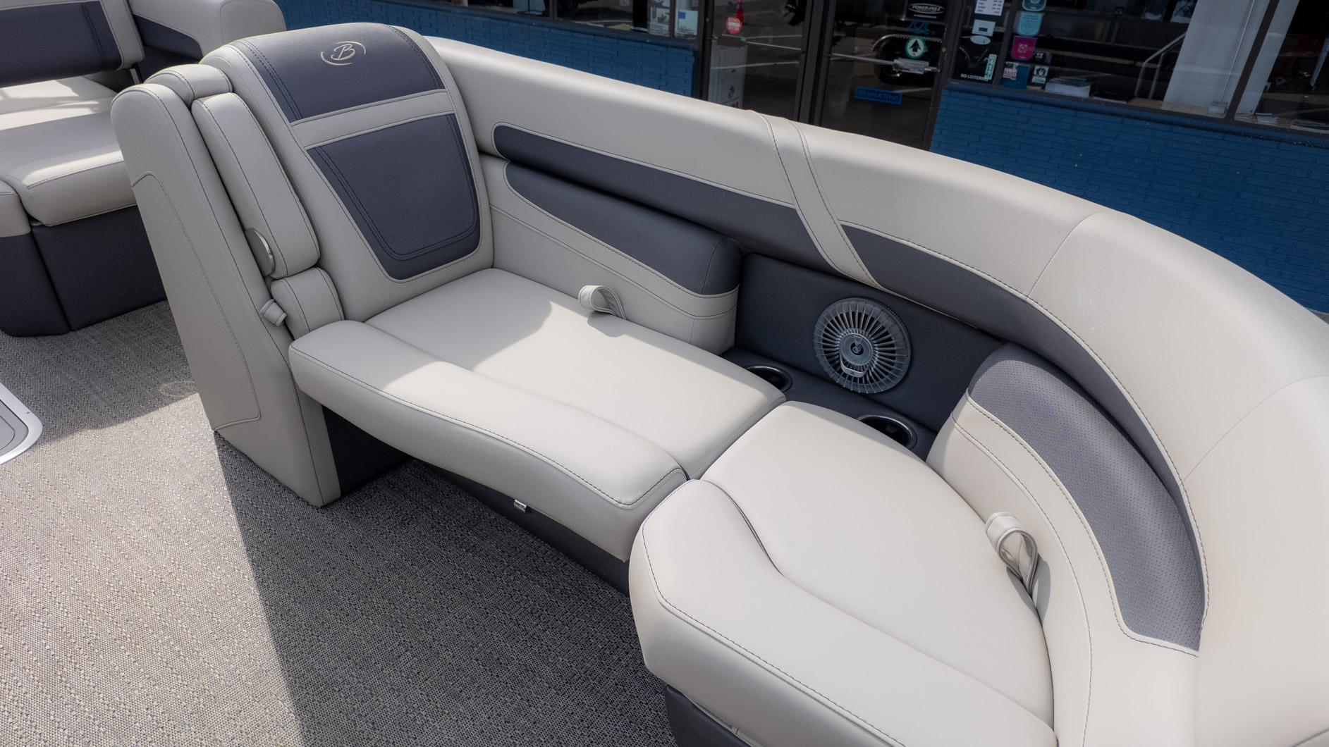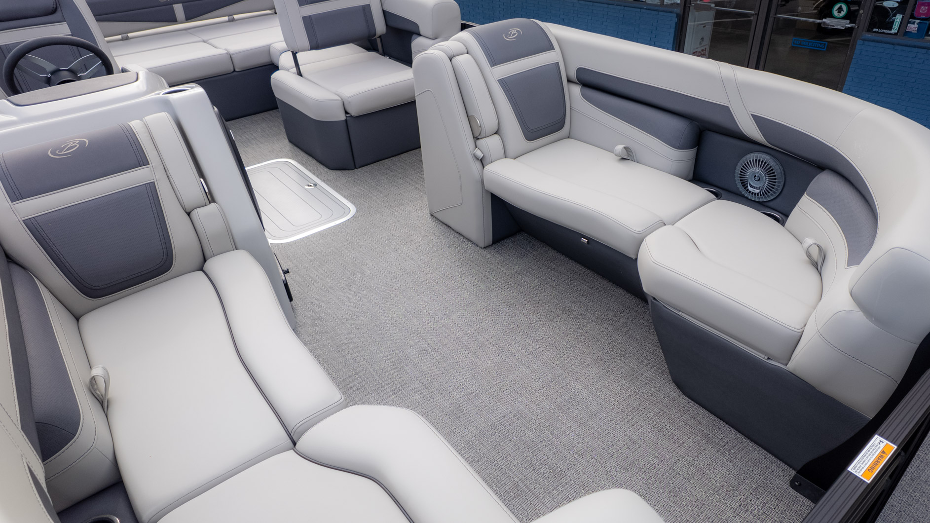 Imagine setting sail with the sun glinting off the Blue Sapphire rails, surrounded by the sleek Blackout Package. The Marquesan Gray furniture with Charcoal accents offers a stylish and comfortable setting for all your adventures, complemented by the Amore Gray flooring underfoot. Whether you're towing water sports enthusiasts with the tube-tow cage or just kicking back with your favorite tunes on the JBL Marine Stereo, this boat promises endless fun. Plus, with integrated pet food/water dishes and a convenient stern boarding ladder, your furry friends are just as welcome on board. The Coastal Edition and Triple Toon Package, complete with midship storage, ensure a smooth and stable ride, making every journey a delight. This boat comes equipped with a Mercury 200L FourStroke engine.