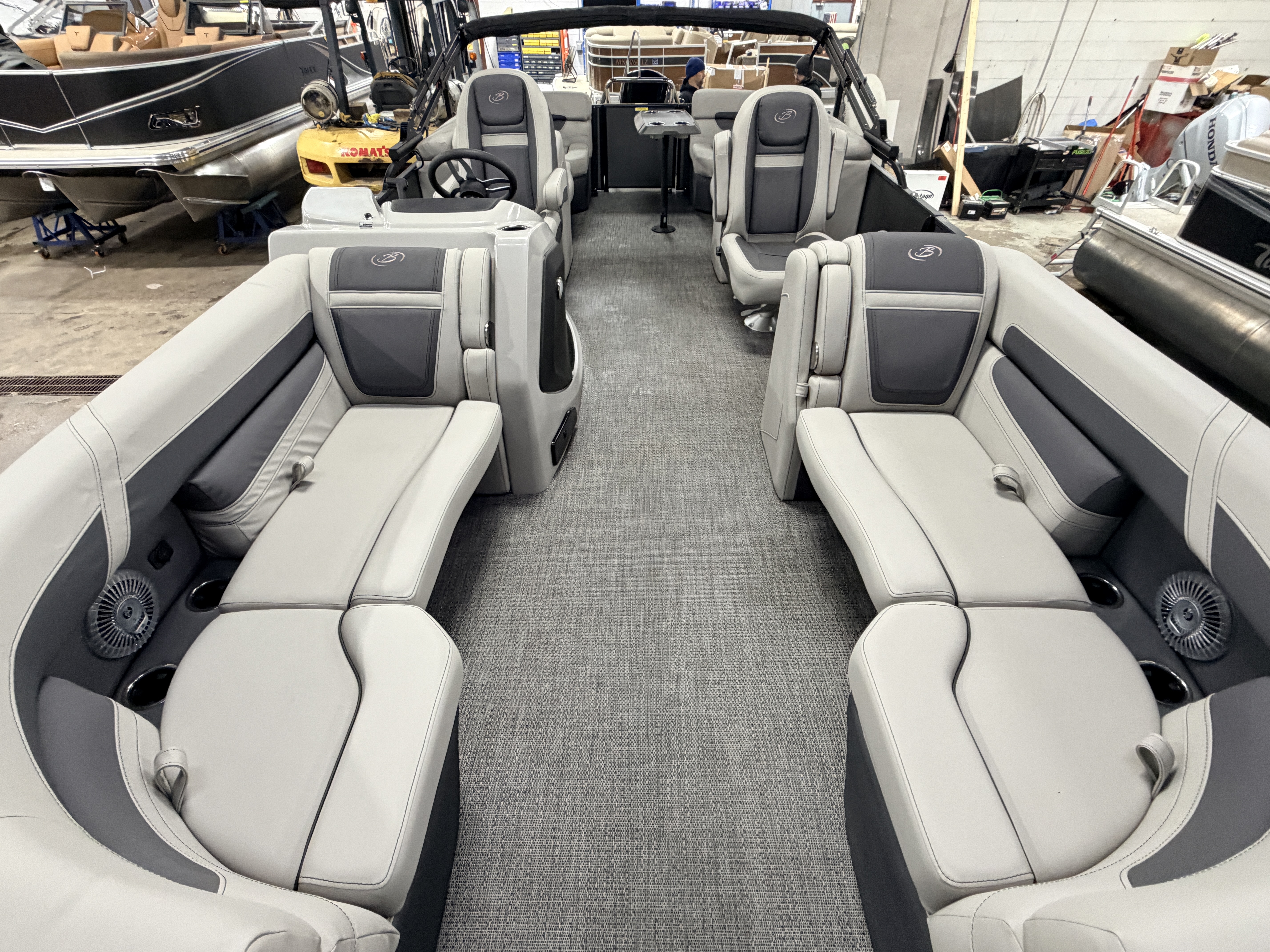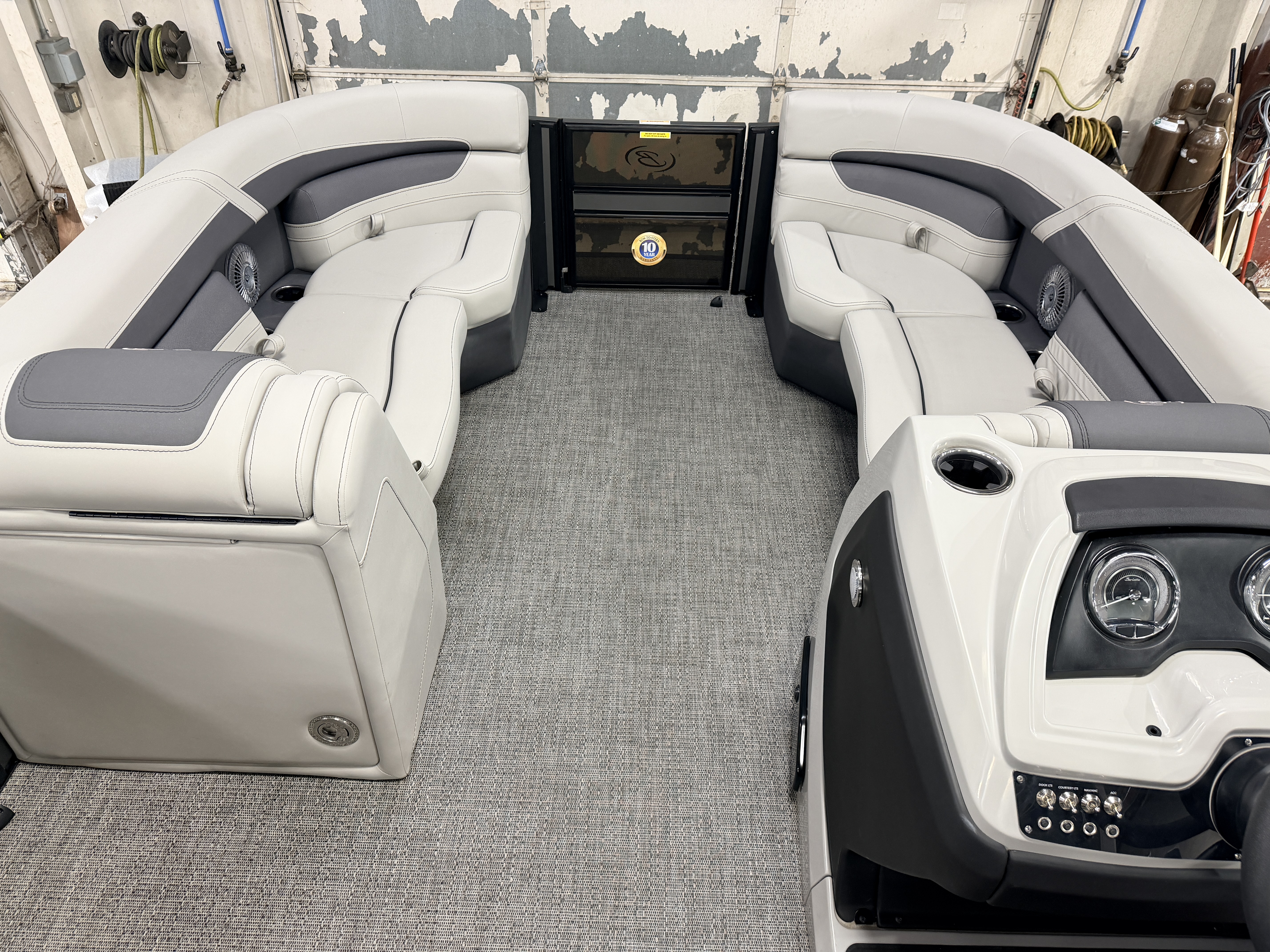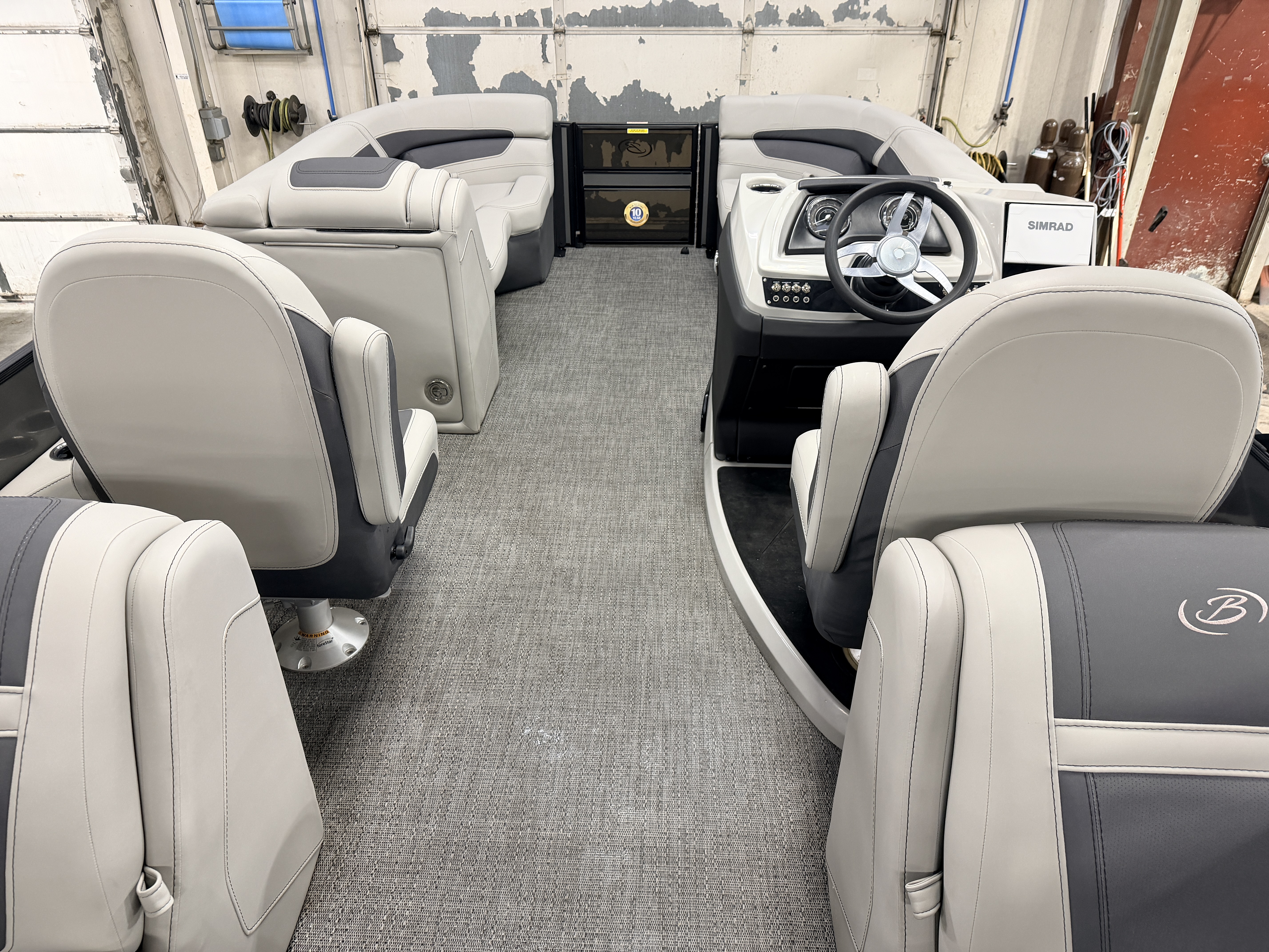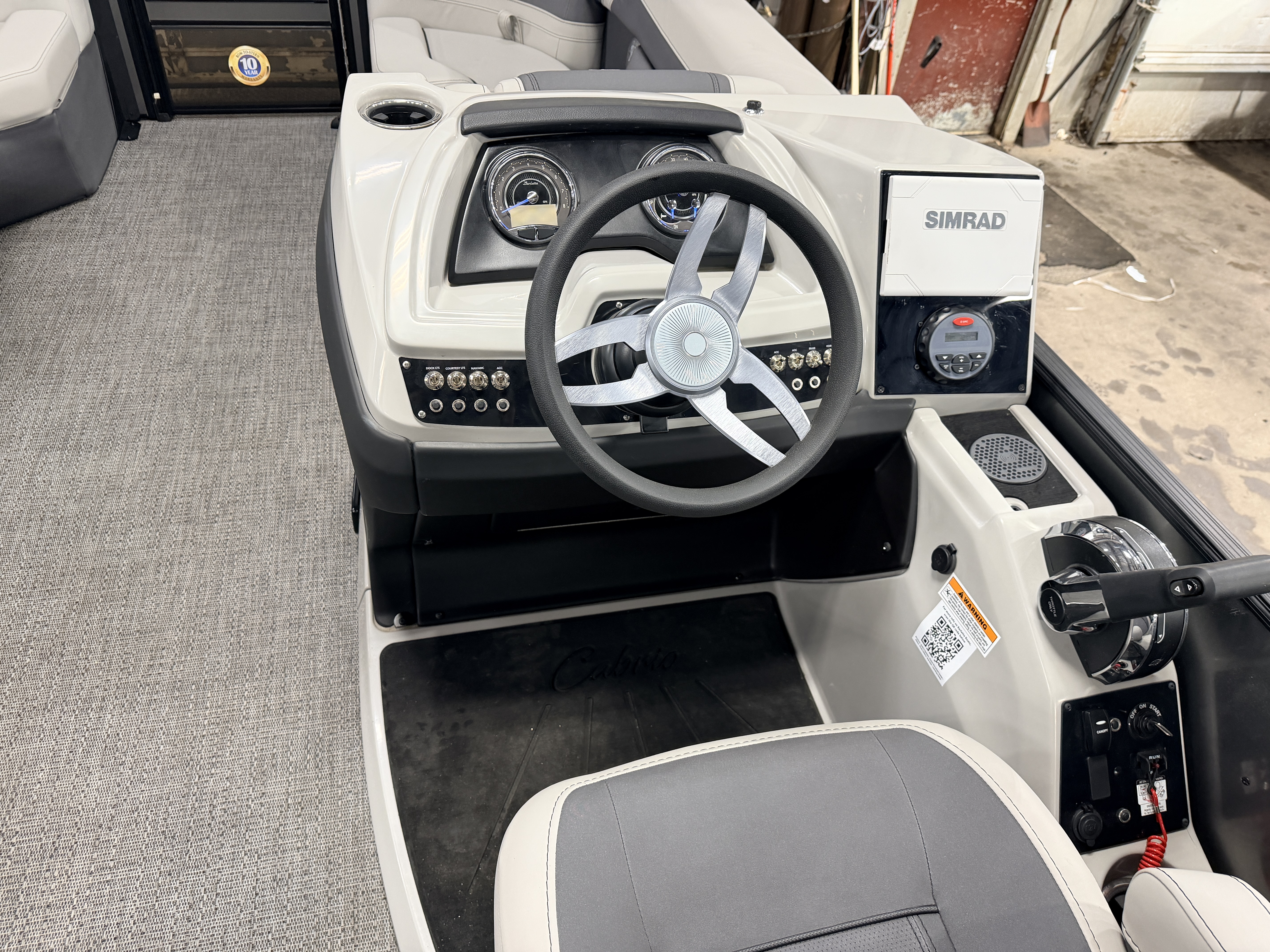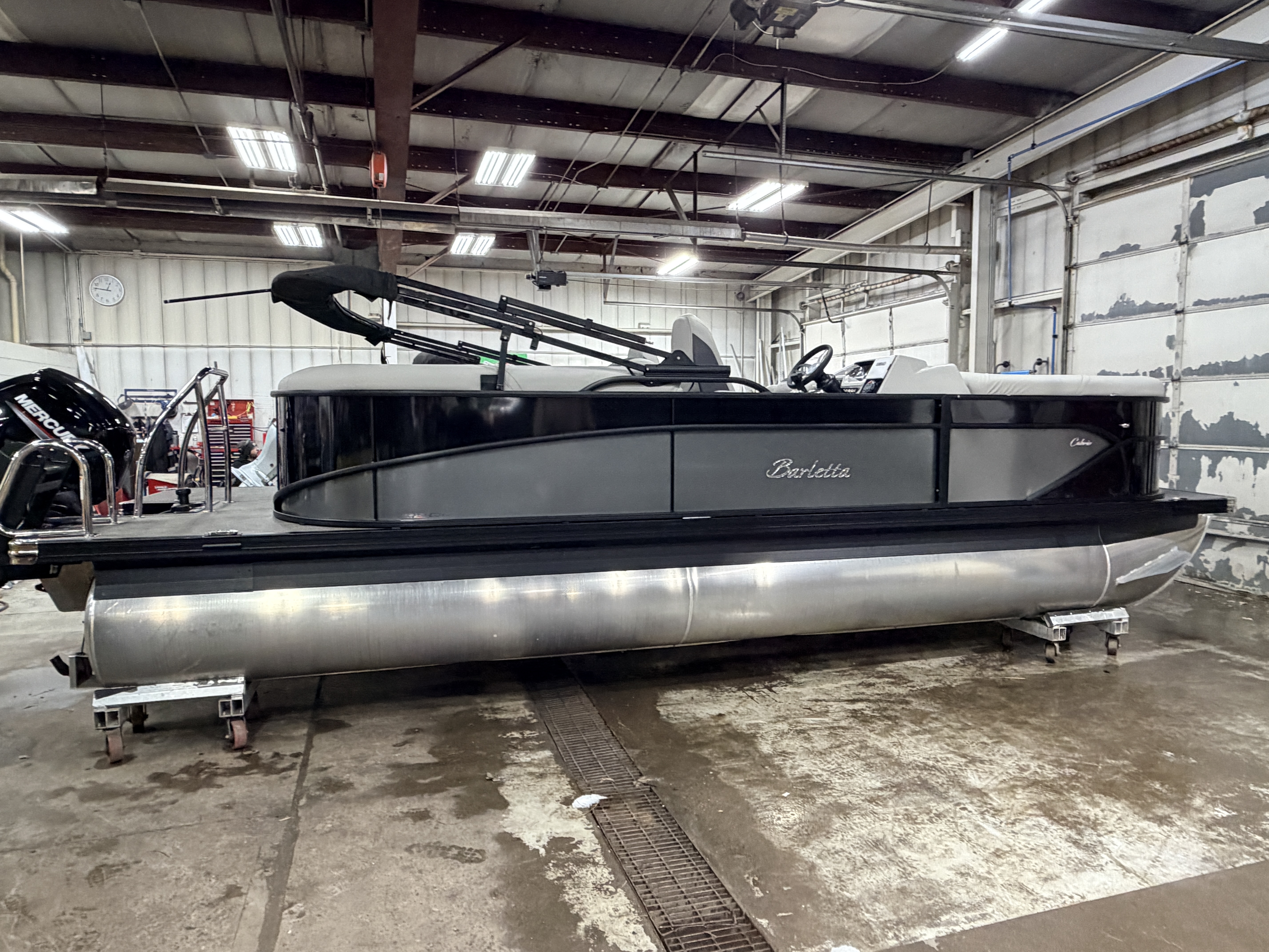 2025 Barletta Cabrio 22QC Pontoon with 115HP Mercury Command Thrust Fourstroke EFI Outboard. This quad lounge layout pontoon features 4 lounge style couches; 1 in each corner of the pontoon, along with side-by-side captain's chairs amidships. The front lounge couches each have a fold down arm rest built into the backrest. The helm features a raised platform for better viewing angle. There is a set of dog bowls built into the bottom of the helm and the entry gates are translucent allowing four legged friends to watch through the gate without worry of them jumping out. There are 2 multi-function gauges in the dash. There is a Tachometer with digital readout and a Speedometer with Fuel and Trim. There is a Simrad built into the dash which functions as a GPS chart plotter and depth finder. It does not display engine data. There is a Bluetooth audio stereo system. The rear lounge couches have flip up lounge backrests with storage underneath and there is also a wastebasket. There is a table mounted between the rear couches as well. This Barletta pontoon also features lifting strakes, full performance under sheeting, a power bimini top, a built-in ski/tow bar, and a rear swim platform with fold down swim ladder.